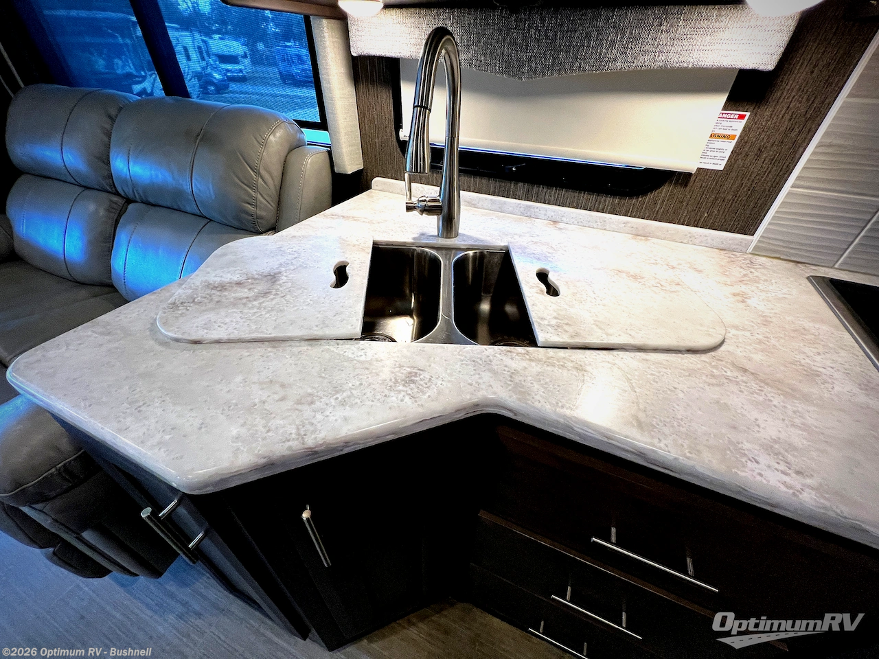 Search for that perfect mountaintop view or lakeside retreat with your powerful and luxurious Thor Motor Coach Challenger Class A gas motorhome! The Challenger is pet friendly with its Pet-Link multi-purpose tie-down, and it is also equipped with a 100W solar charging system that can be used to distance yourself from crowds and surround yourself with nature. You're going to absolutely love the exterior entertainment center because you can use it to play a movie while you sit back in your camp chairs and take in the night sky. Having Wi-Fi while on the road gives you the ultimate freedom, and the Winegard ConnecT Wi-Fi extender + 4G makes that possible. Some other top-notch amenities are the tankless water heater, whole-coach water filtration system, Onan RV QG 5,500 gas generator, and sound bar in the living room.