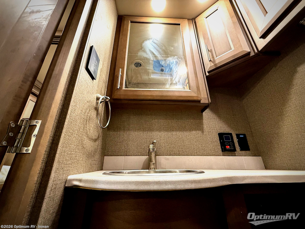 Convenience, comfort and entertainment can be found inside and outside this coach that offers a family of six to seven seating and sleeping space anywhere you decide to set up. For starters you all will have a half bath mid-coach to utilize easily and the master suite offers a full bathroom with a space saving sliding door. There is a Tilt-A-View inclining king bed allowing you to read a book comfortably and enjoy the perfect position to sleep, plus a closet and dresser for your clothing. Just outside the bedroom is an area prepped for a washer and dryer option so that you can enjoy clean clothes throughout your entire trip. You can relax and unwind at night on the 60" x 74" sofa bed and theater seat with footrest or while sitting at the dinette and the captain's chairs that swivel to face the living area. And the Always-In-View 39" LED TV with fireplace below allow you to be cozy on those chilly nights.