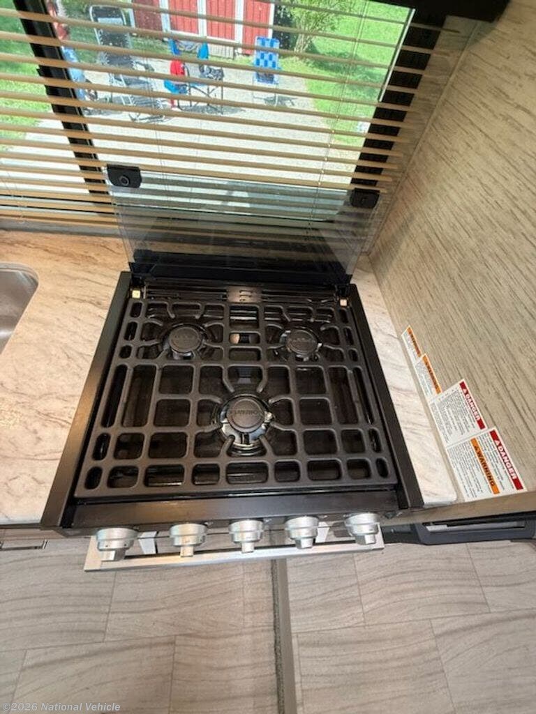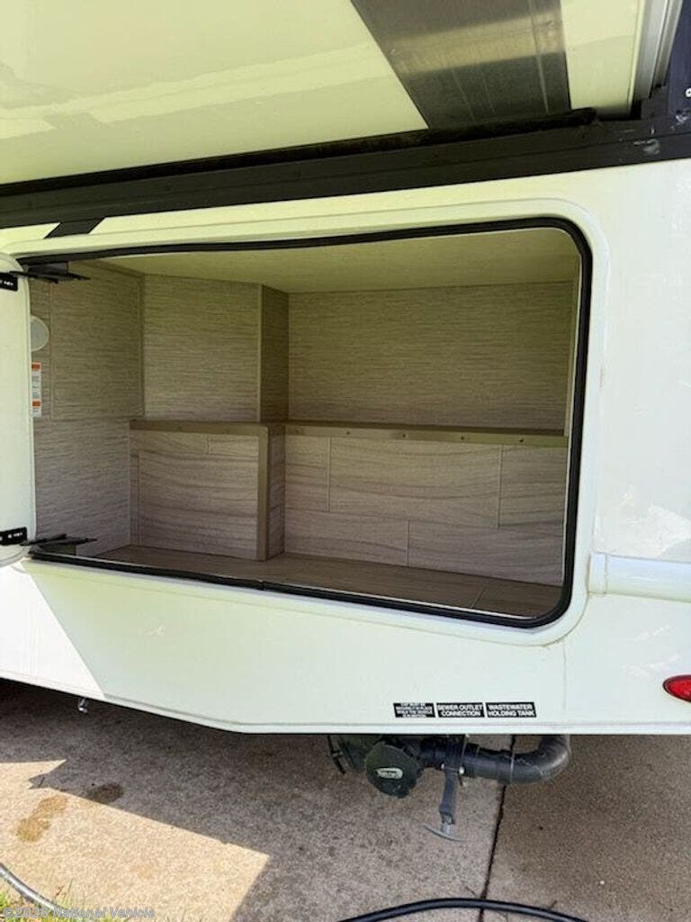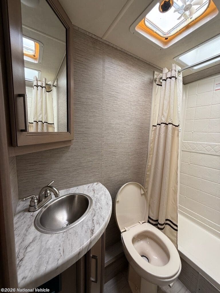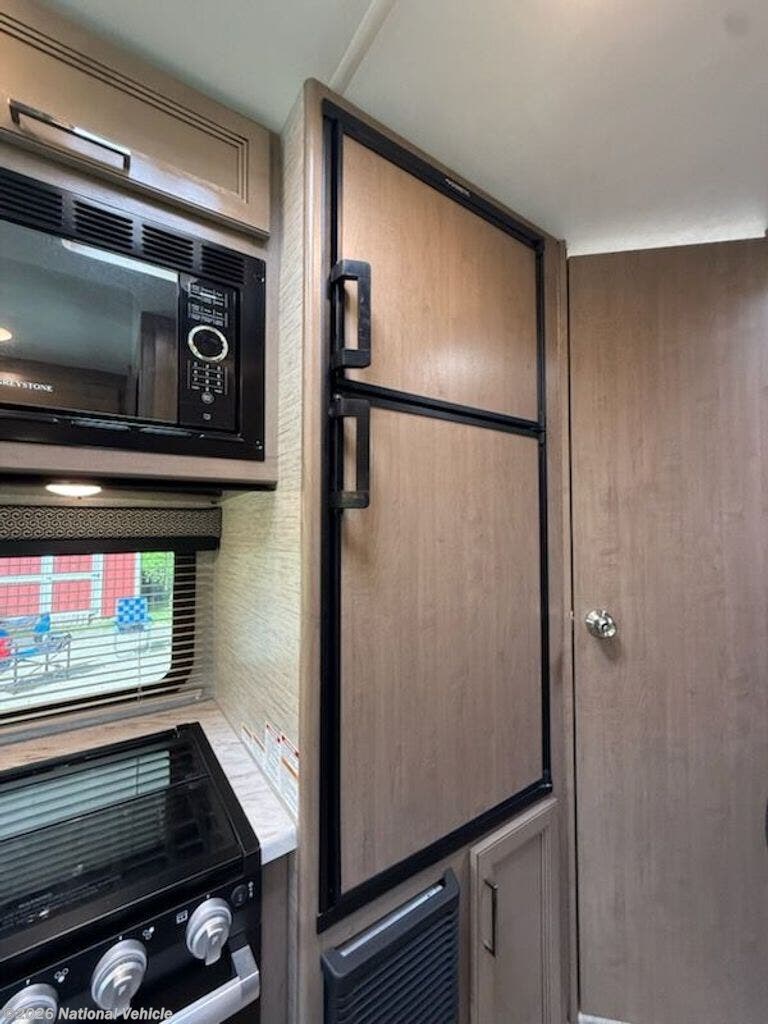 Inside, you?ll find a versatile living area with a booth dinette and cab-over bunk for added sleeping space. The fully equipped kitchen includes a cooktop, microwave, refrigerator, and ample storage?everything you need to prepare meals on the go.