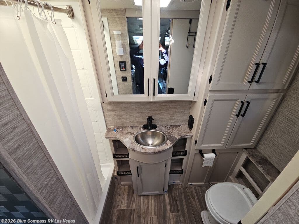 Get ready to set out to new destinations in a Thor Motor Coach Compass Class B+ All-Wheel drive gas motorhome. Along the exterior portion of the Compass you will find a vacu-bond laminated roof, walls, and floors with block foam insulation. Your extra camping gear can be stored in the Rotocast storage compartments with lights, and there is a power patio awning with integrated LED lights which will allow you to sit outside just a bit longer each night. The interior décor of the Compass has a modern and classy look with its residential vinyl flooring, Euro-style cabinet doors, and pressed laminate countertops.