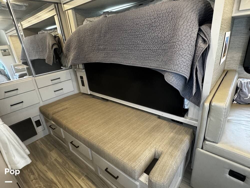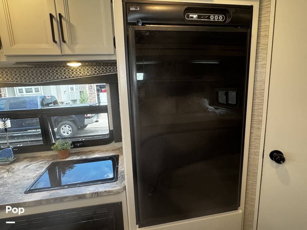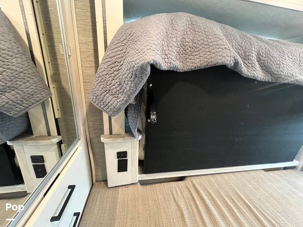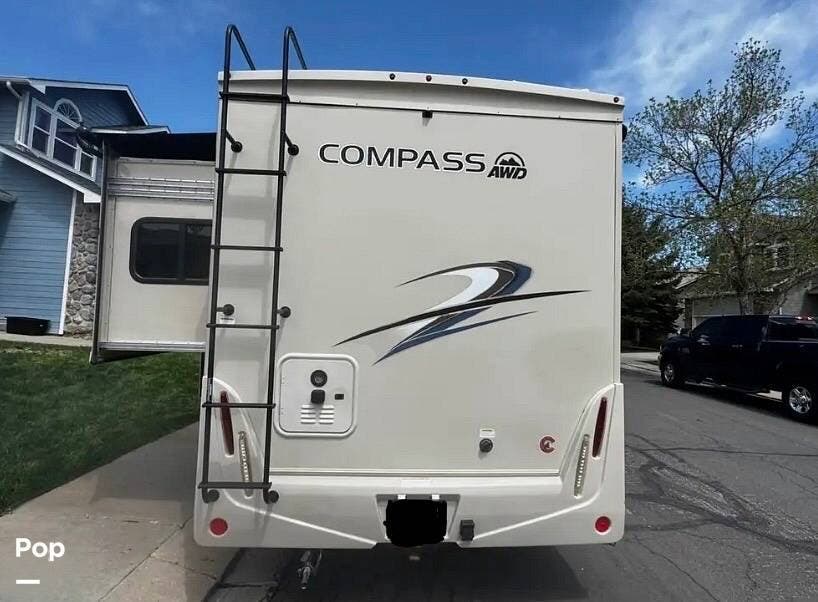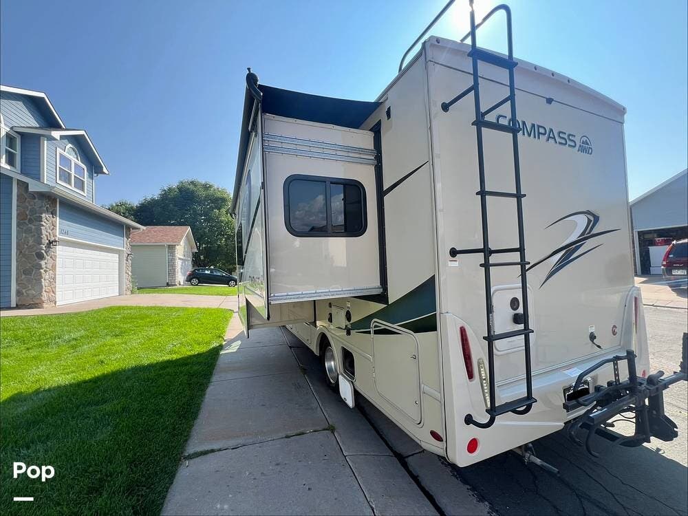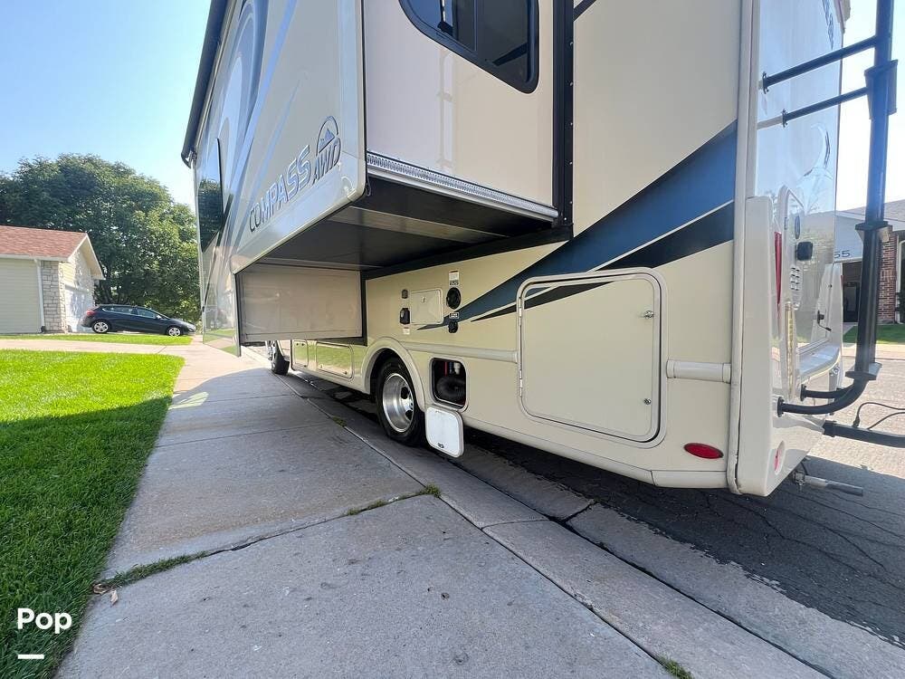 This 2021 Compass is also loaded with extras, including a touchscreen infotainment system with backup camera, a 100-watt solar charging system, an Onan generator, and a 14-foot power awning with integrated LED lighting.