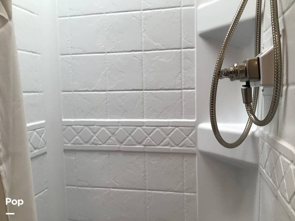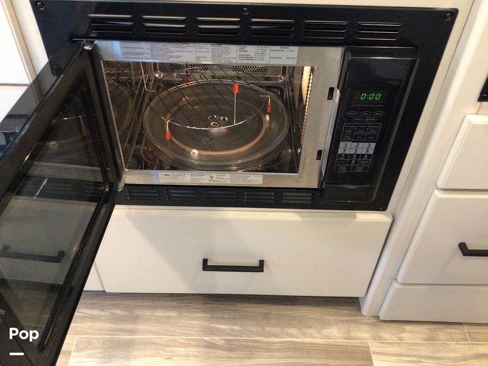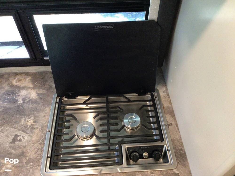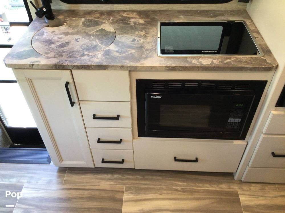 The kitchen is large with ample storage and counter space. The refrigerator runs on propane, as well as 120 volts and 12 volts. There is a two-burner stove and a convection microwave. This will make the most discerning chef happy!