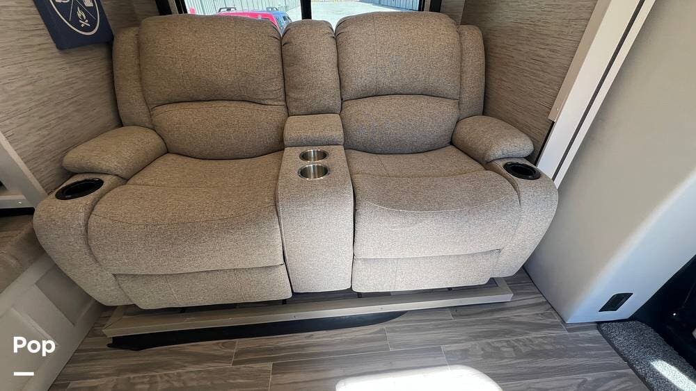 The interior features Euro-style cabinet doors, pressed Laminate countertops, LED lighting, and residential vinyl flooring. Opposite the kitchen is stadium-style theater seating and a flip-up queen-size bed with cushioned seating underneath.