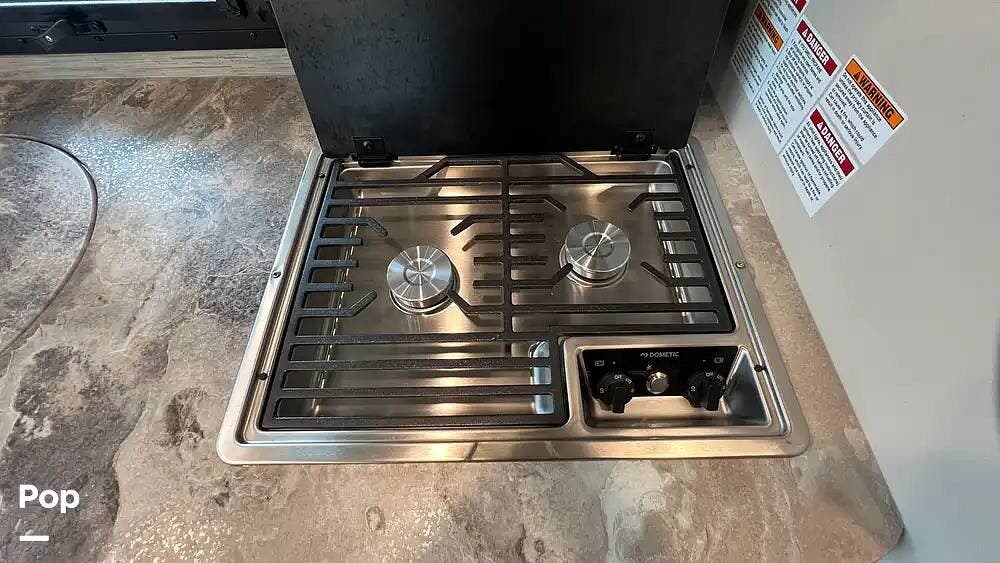 The kitchen has a refrigerator, a two-burner gas cooktop, a convection microwave, and a large stainless steel sink with a single-handle faucet.