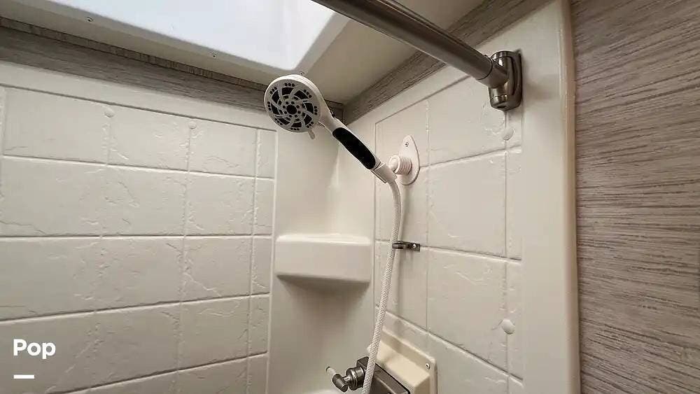 The bathroom has a stainless steel sink, a foot flush toilet, and a shower with a skylight.