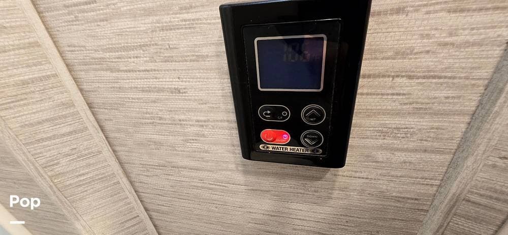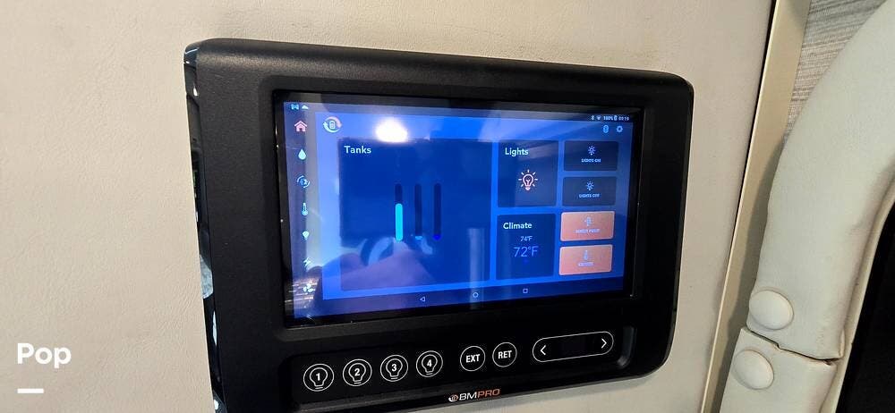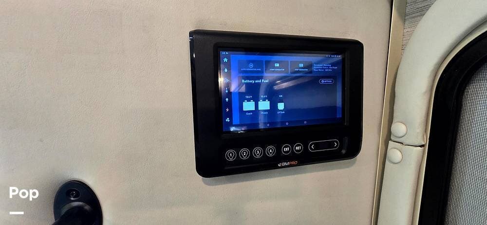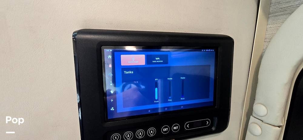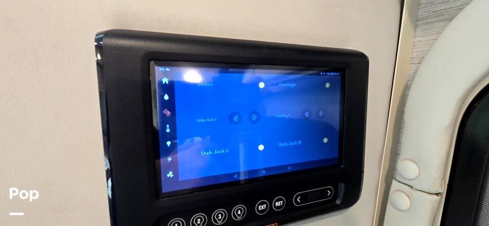 The coach also features a RapidCamp+ multiplex lighting and systems control. That includes a touchpad with an app at the entry to control not only lights, but also the awning, slide-out, jacks, Generator, and monitors for all your tanks.
