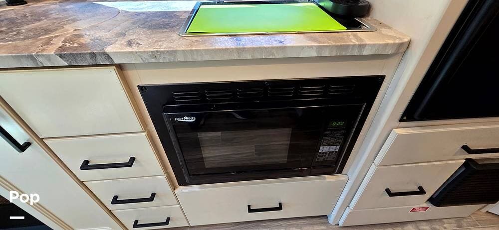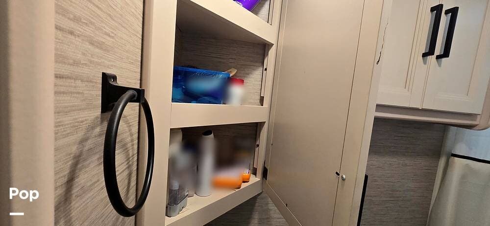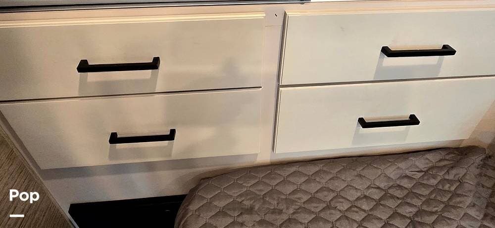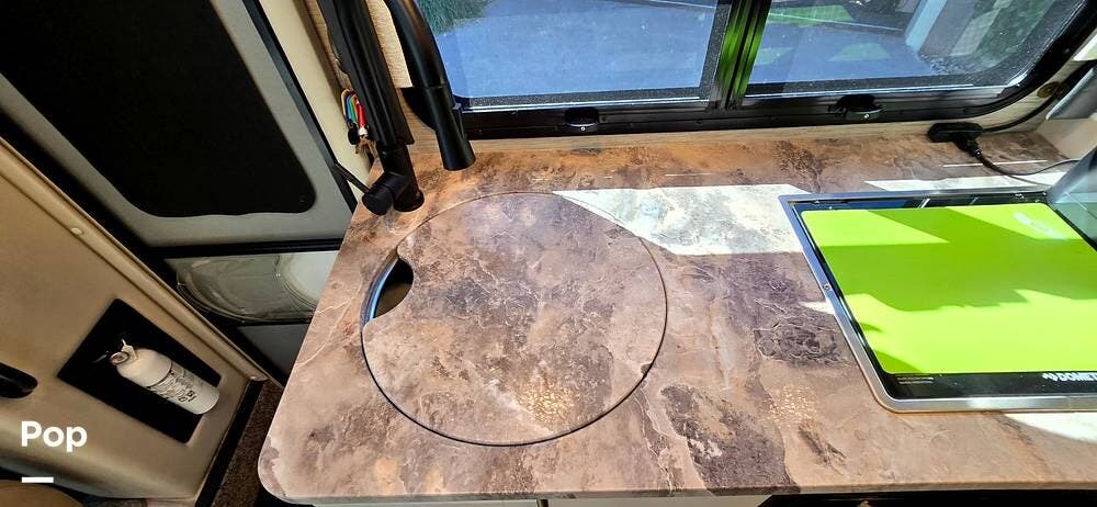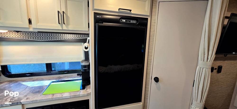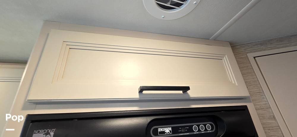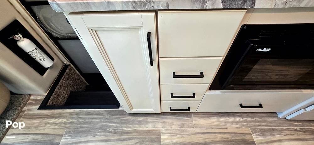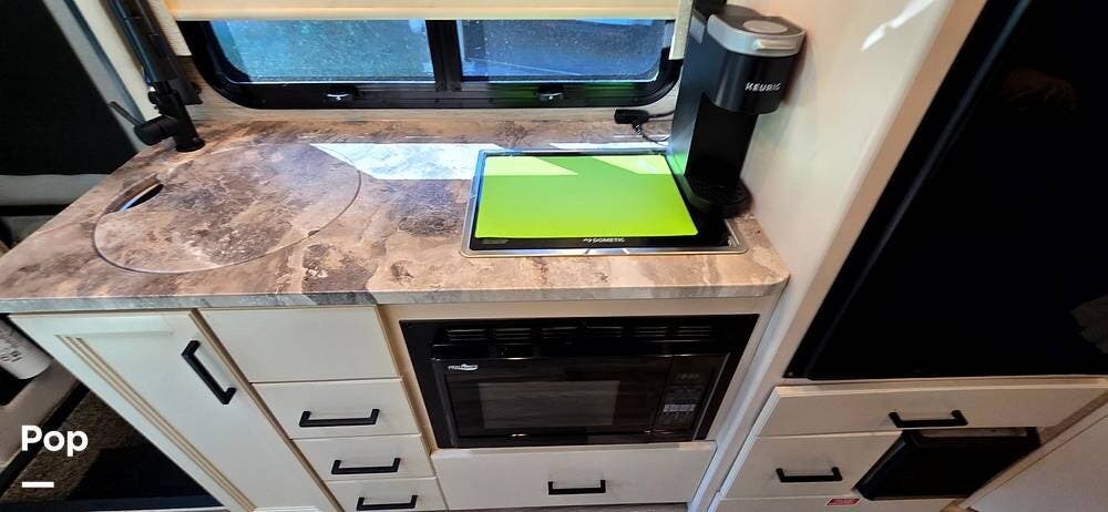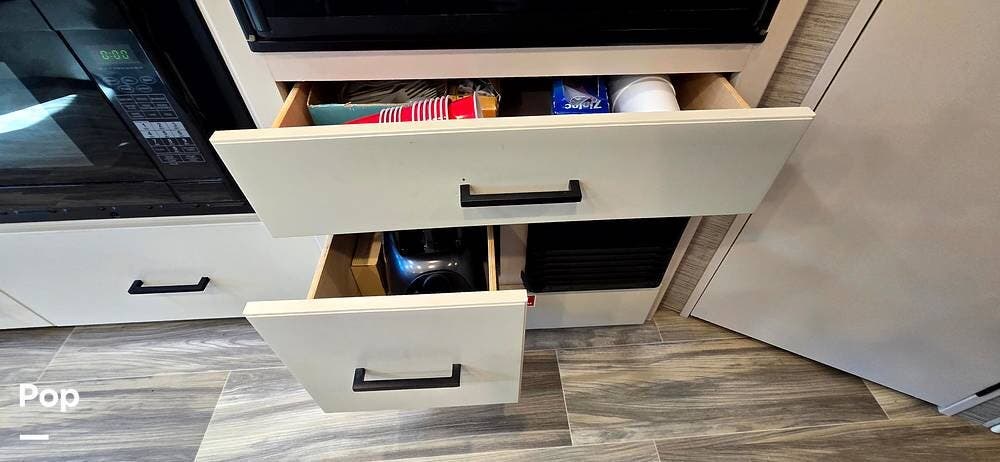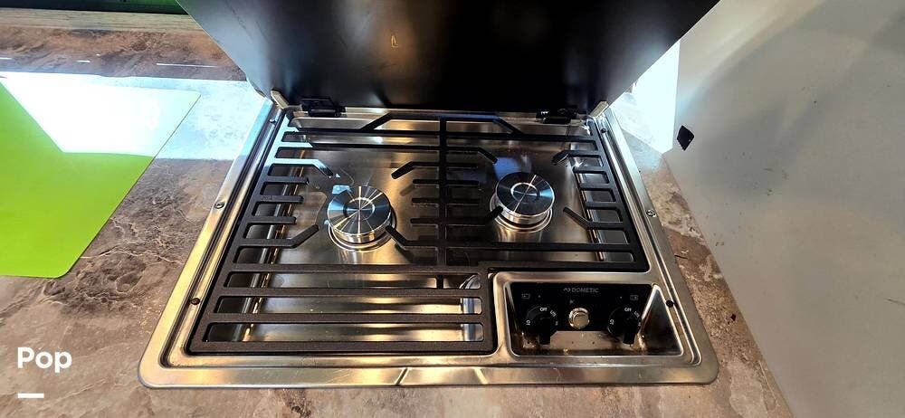 The fully equipped galley includes a High Point convection microwave oven, Dometic dual-burner gas cooktop with a glass cover, and a stainless-steel sink with Satin Black pull-down sprayer faucet. Solid-surface countertops provide a high-end touch, while the 5.5 cu. ft. Norcold's double-door, dual-power refrigerator and ample cabinetry ensure plenty of storage for meals on the go.