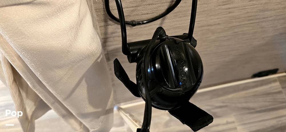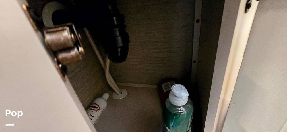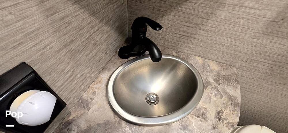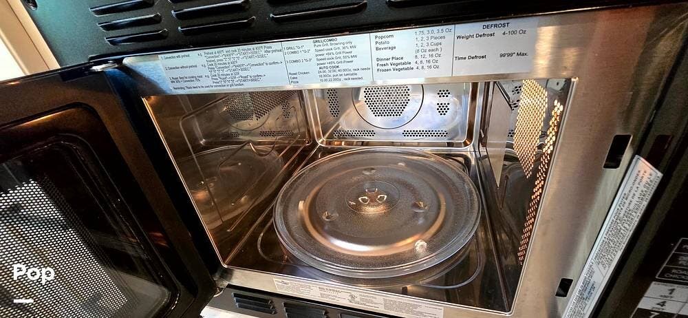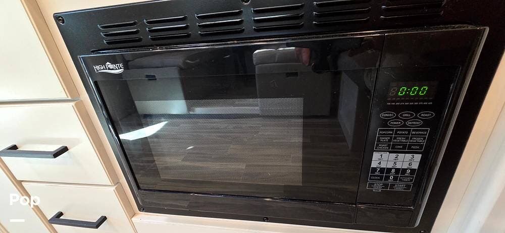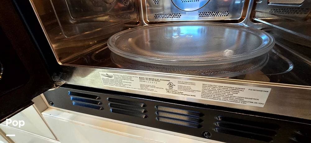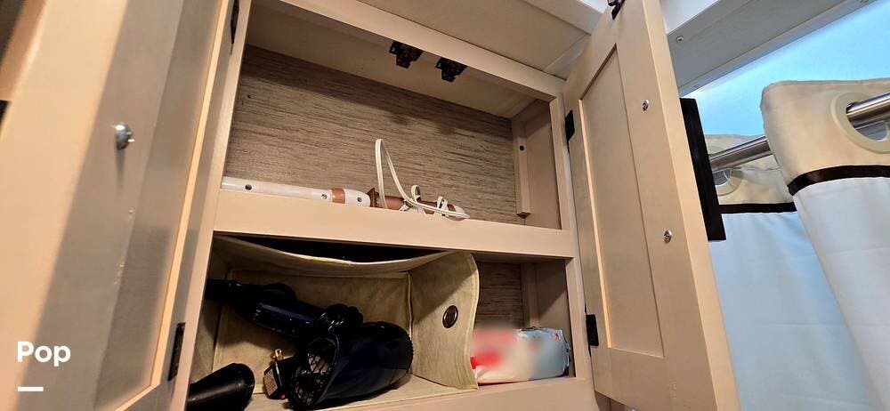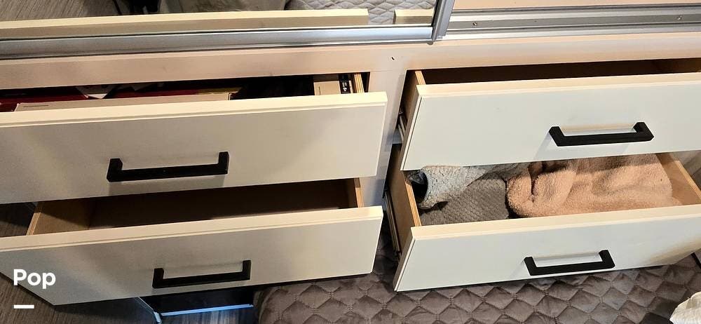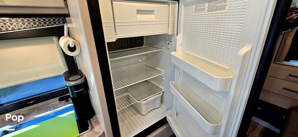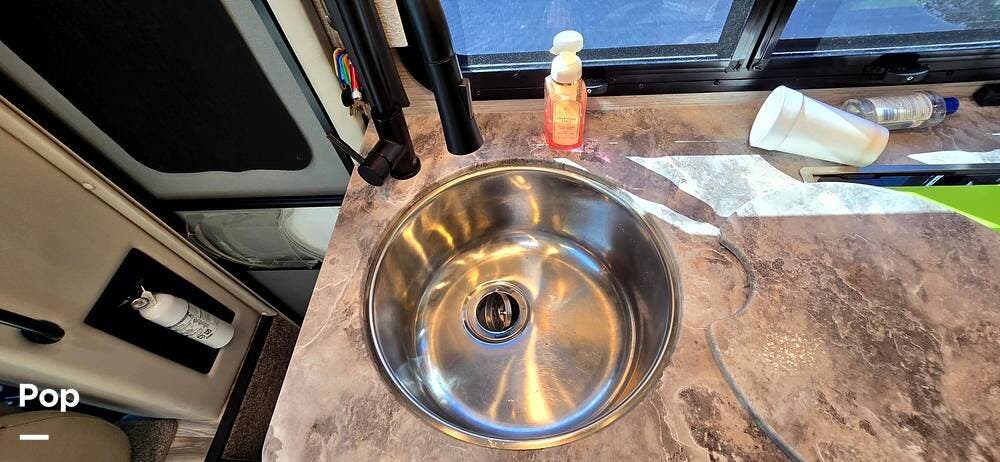 The fully equipped galley includes a High Point convection microwave oven, Dometic dual-burner gas cooktop with a glass cover, and a stainless-steel sink with Satin Black pull-down sprayer faucet. Solid-surface countertops provide a high-end touch, while the 5.5 cu. ft. Norcold's double-door, dual-power refrigerator and ample cabinetry ensure plenty of storage for meals on the go.