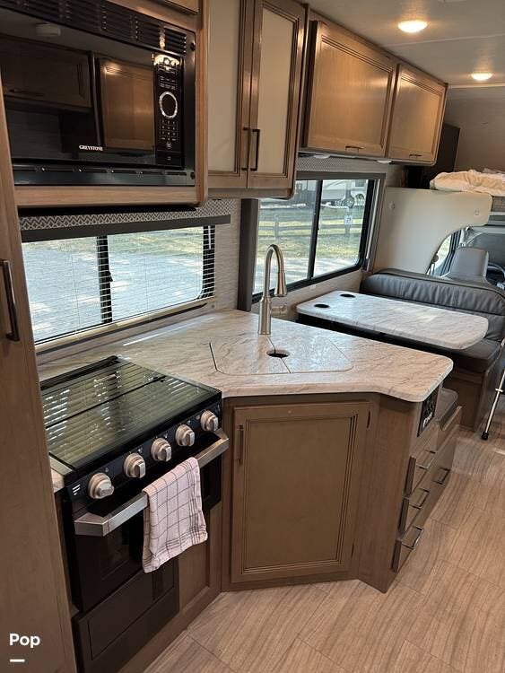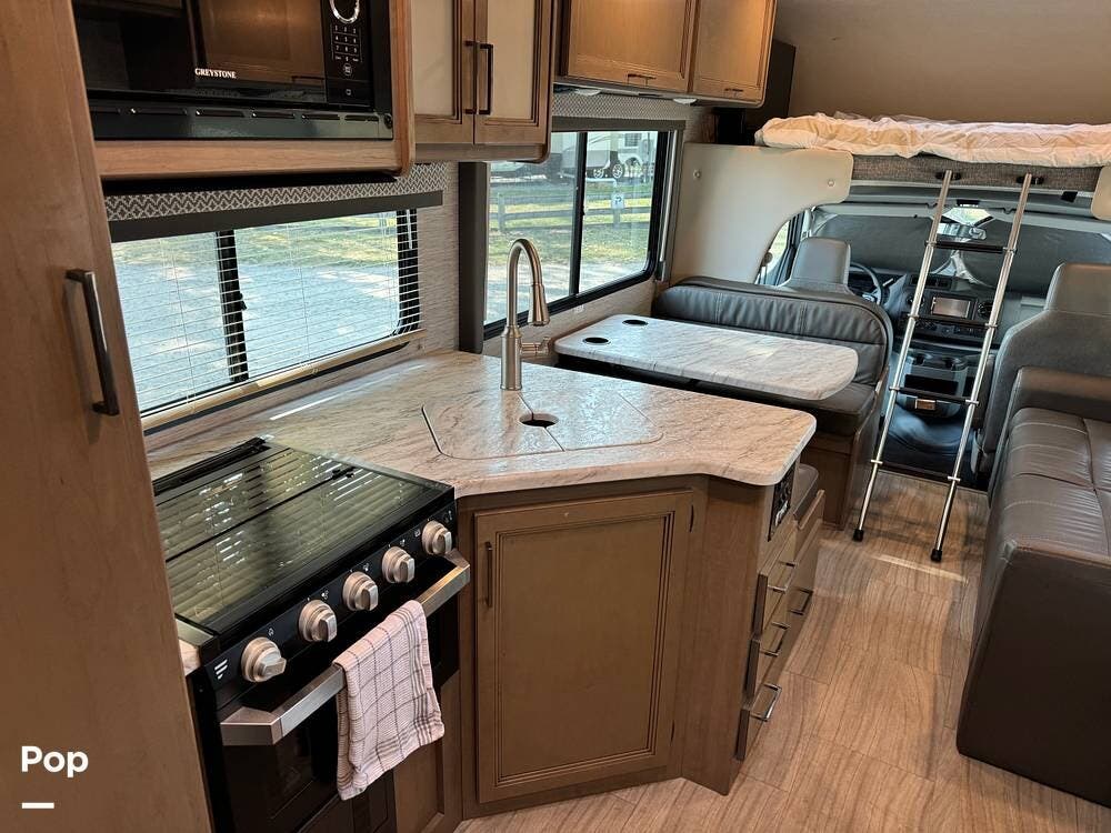 The main area features a booth dinette and a jack-knife sofa, both of which can convert into sleeping areas, as well as an overhead bunk with a TV, allowing this motorhome to accommodate up to six people comfortably.