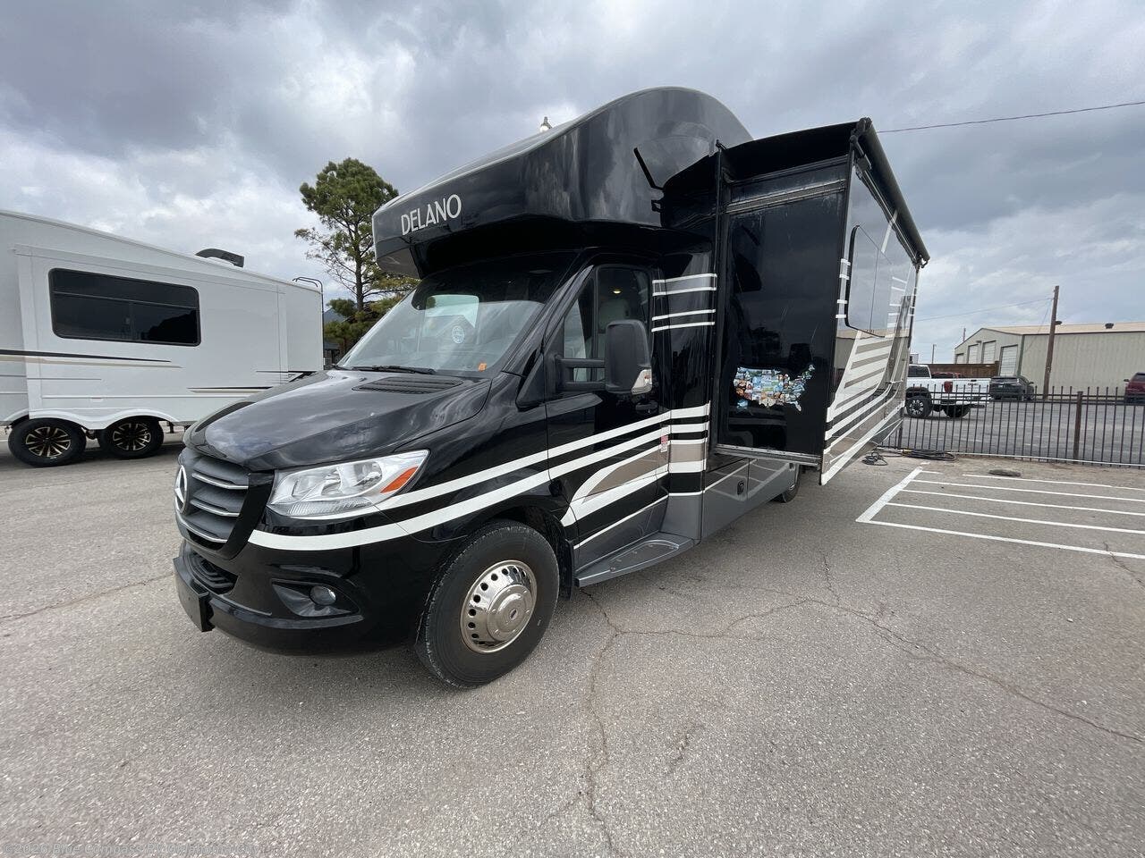 The 2021 Thor Motor Coach Delano 24FB is a 25'8" Class C diesel motorhome built on a Mercedes-Benz Sprinter 3500 chassis. It features a rear bathroom, Murphy bed/sofa combo, and a cab-over bunk, sleeping up to four. Key features include a 188-hp V6 diesel engine, Rapid Camp+ multiplex system, and full-body paint.