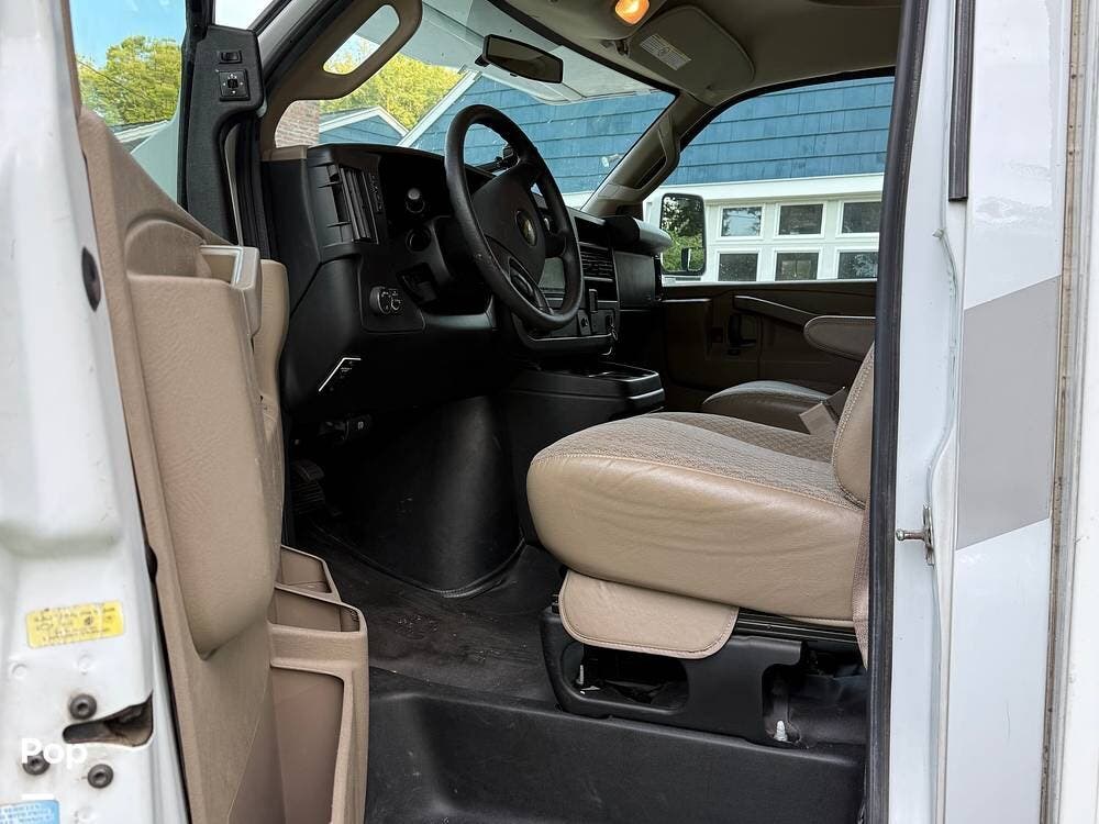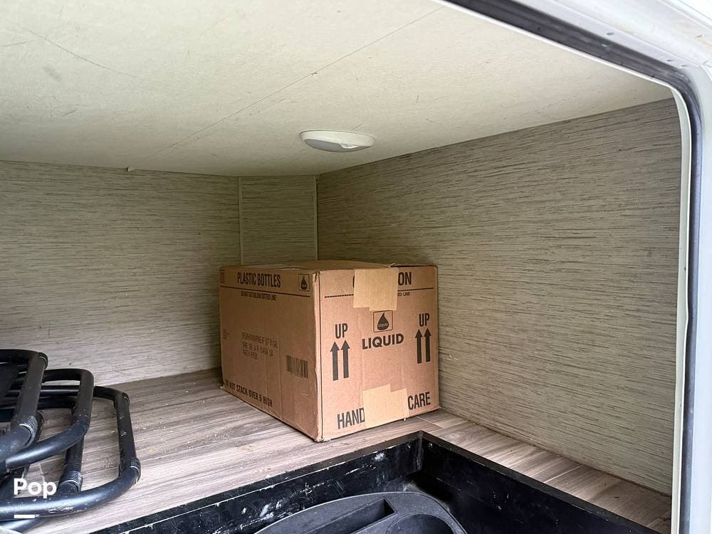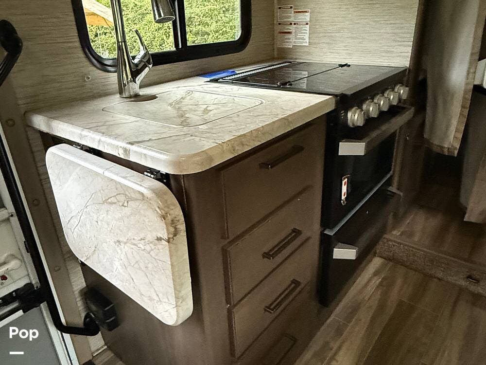 The kitchen is compact yet fully equipped. It features a three-burner gas cooktop, microwave, mid-sized refrigerator, and stainless steel sink, allowing for meal preparation on the go. Storage cabinets and drawers throughout the kitchen and living space ensure ample room for food, utensils, and other essentials.