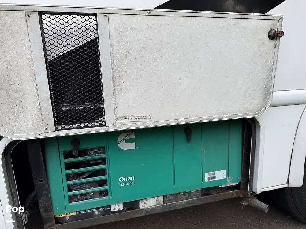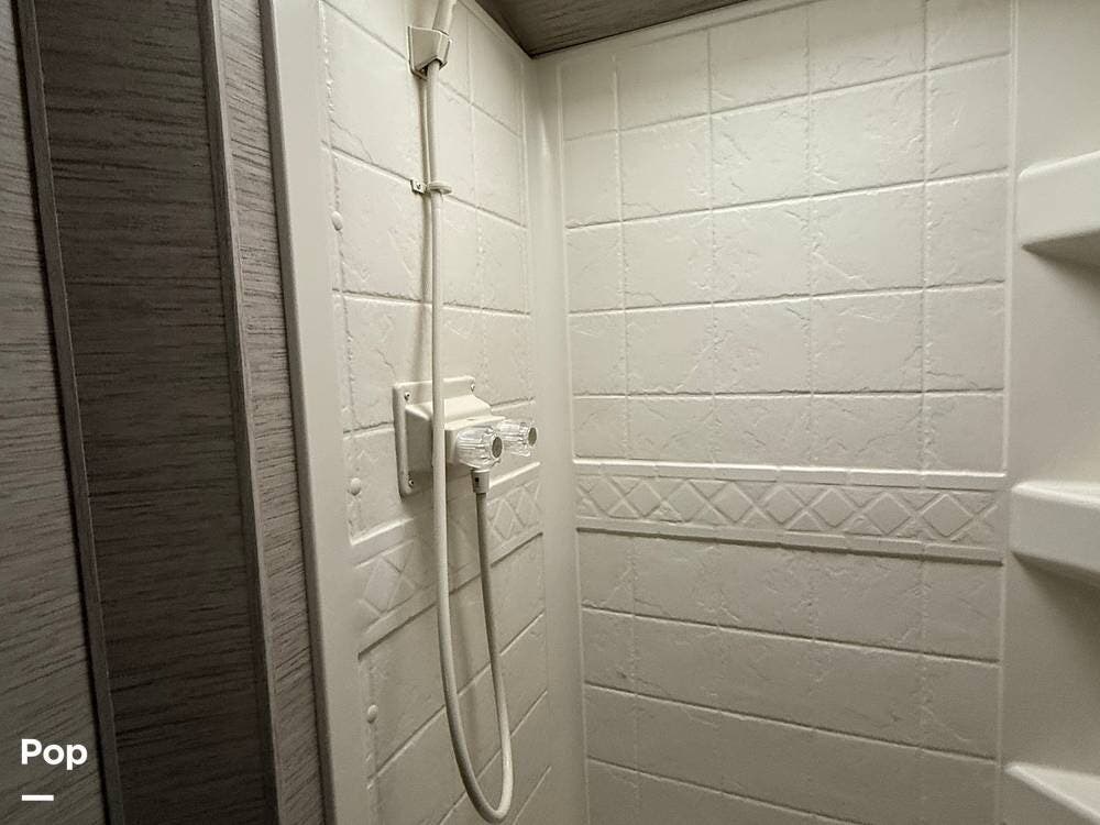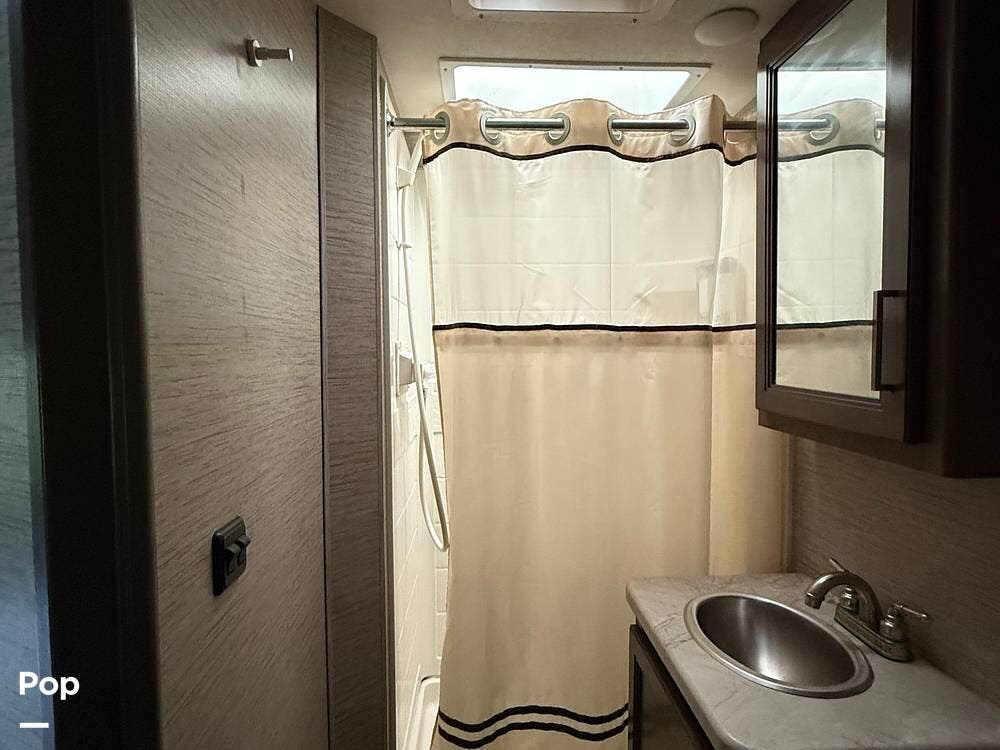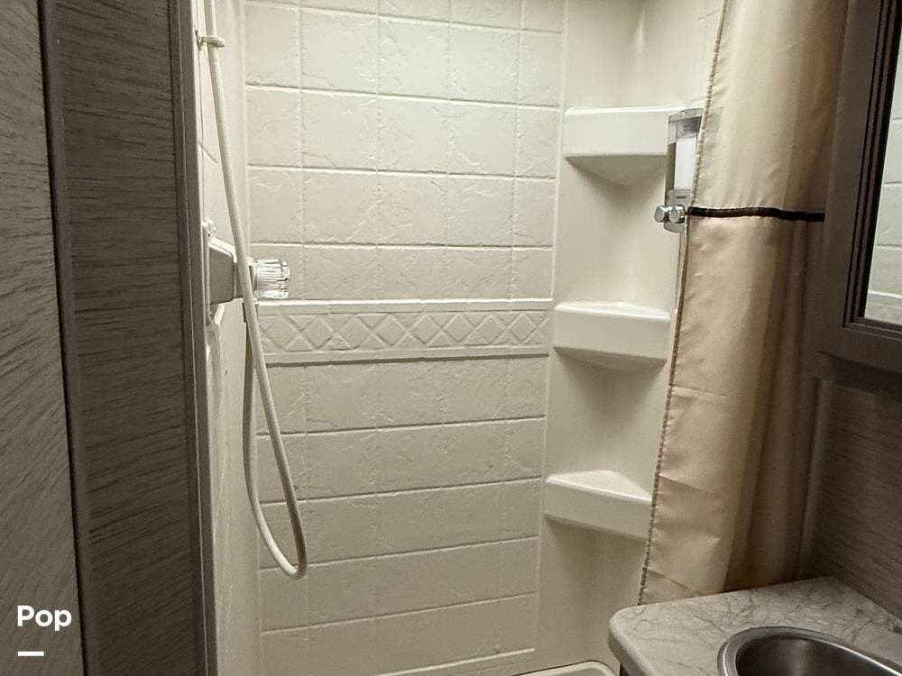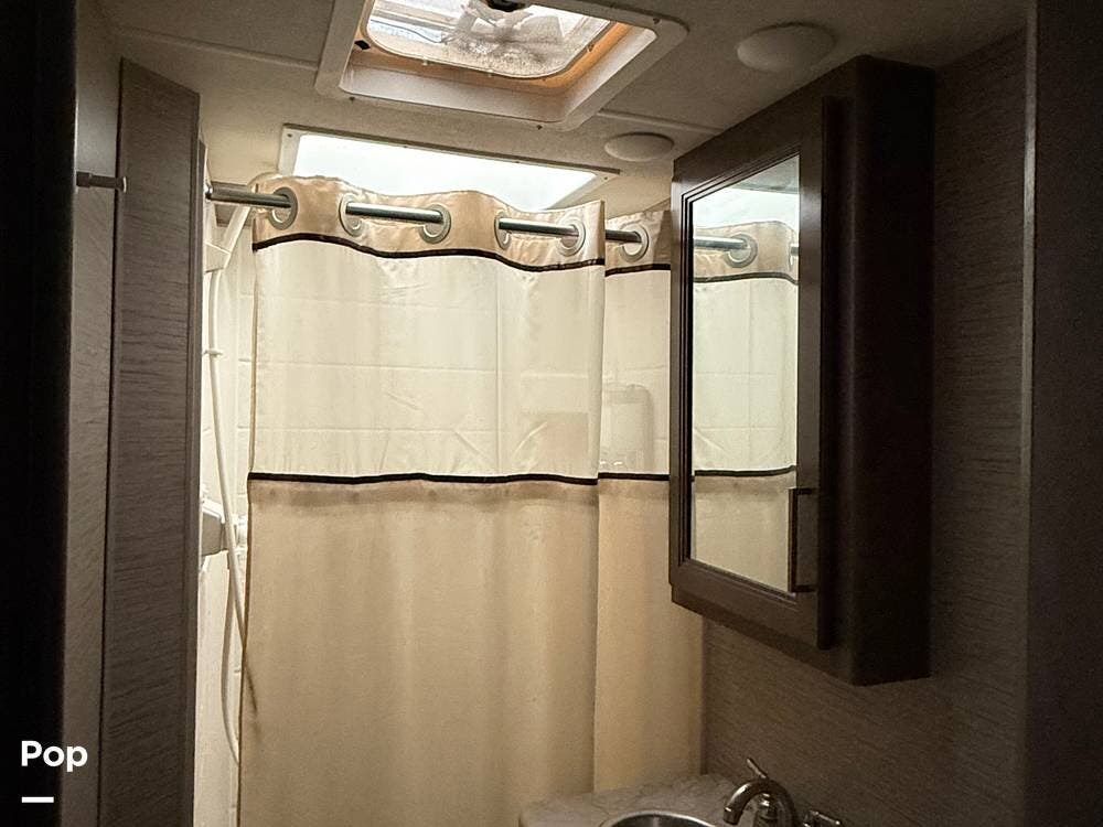 The bathroom, located at the rear, includes a toilet, sink, and shower with a skylight for added natural light, maximizing comfort and convenience on long trips. The RV has a 30-amp electrical system, an onboard generator, and propane storage, making it ideal for campgrounds and off-grid adventures.