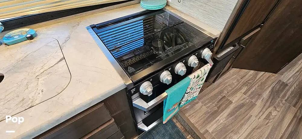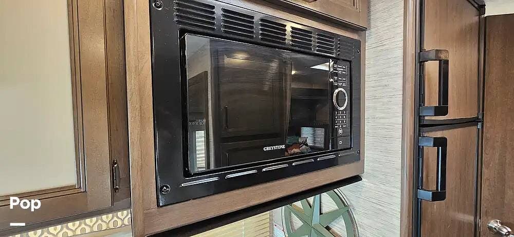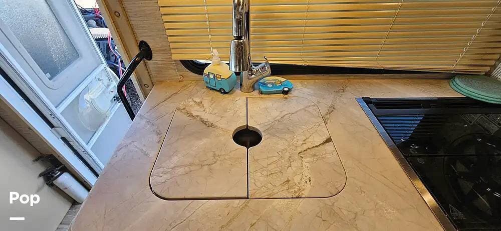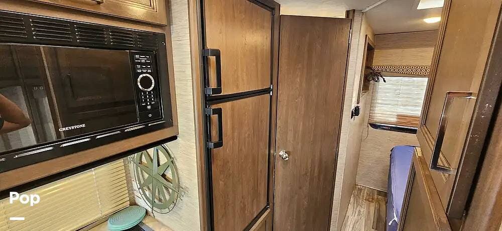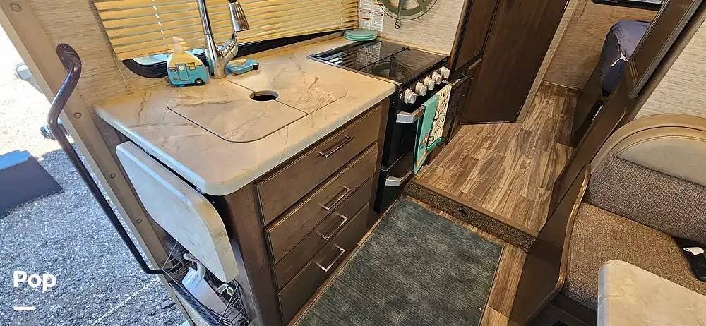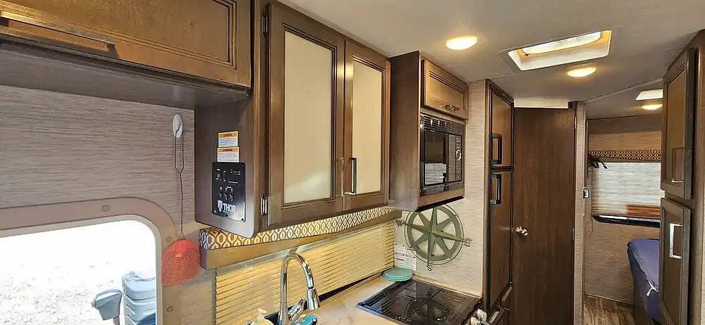 The kitchen is compact yet fully equipped. It features a three-burner gas cooktop, microwave, mid-sized refrigerator, and stainless steel sink, making meal preparation on the go possible. Storage cabinets and drawers throughout the kitchen and living areas provide ample space for food, utensils, and other essentials.