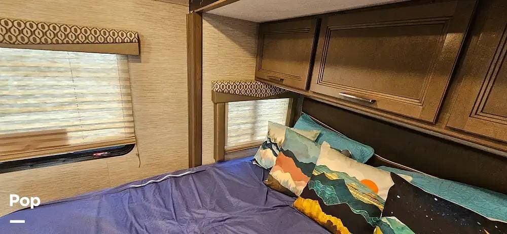 Inside, the 22FE can comfortably sleep up to five people, making it ideal for small families or couples who enjoy traveling with extra space. The rear queen bed provides a cozy sleeping area, while the cab-over bunk is perfect for kids or additional guests. The dinette also converts into a bed, offering flexibility in sleeping arrangements.