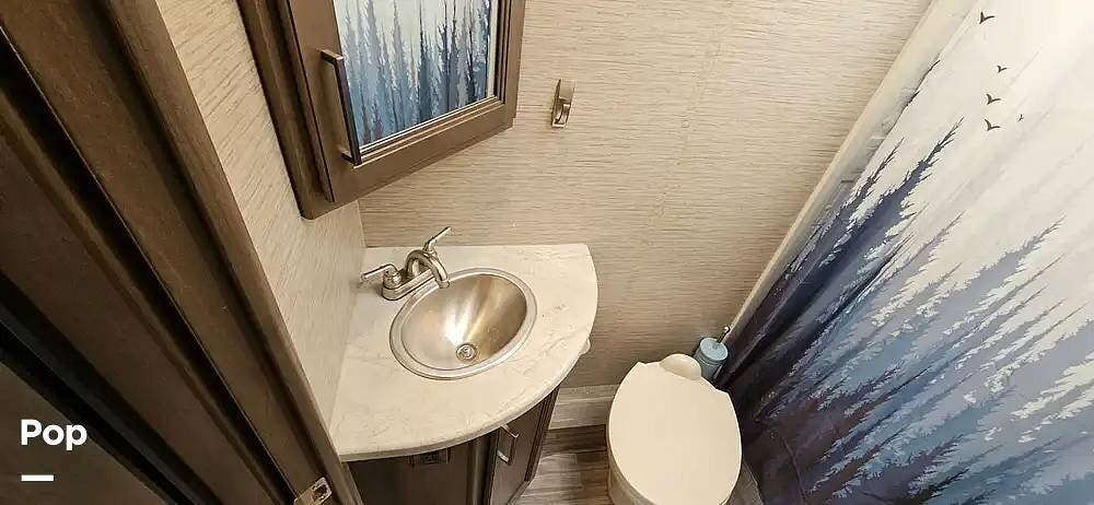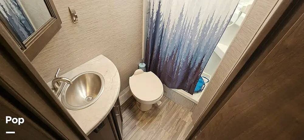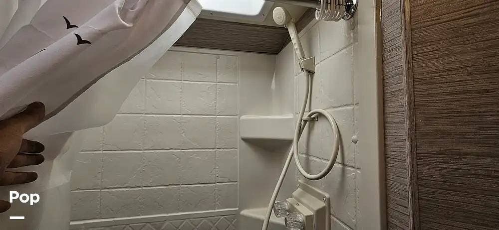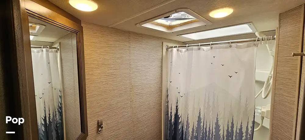 The bathroom at the rear includes a toilet, sink, and shower with a skylight for added natural light, maximizing comfort and convenience on long trips. The RV has a 30-amp electrical system, an onboard generator, and propane storage, making it ideal for campgrounds and off-grid adventures.