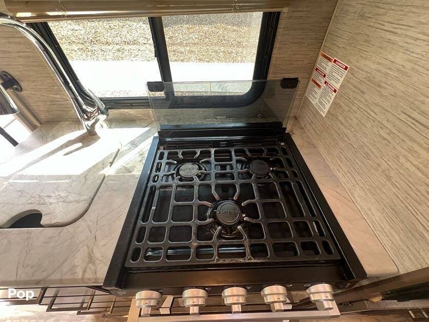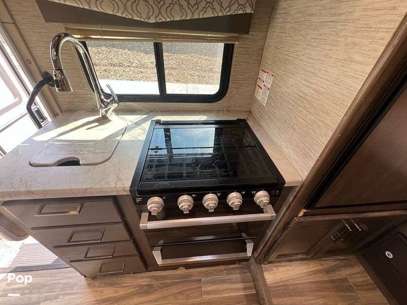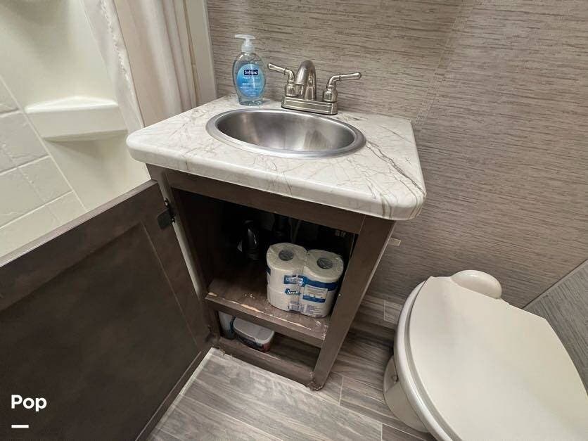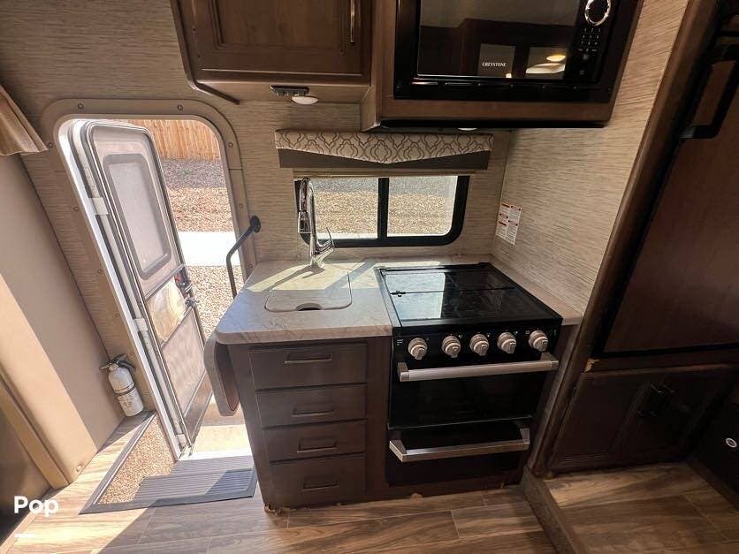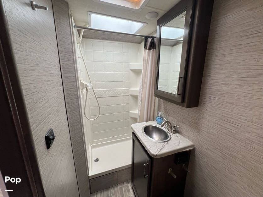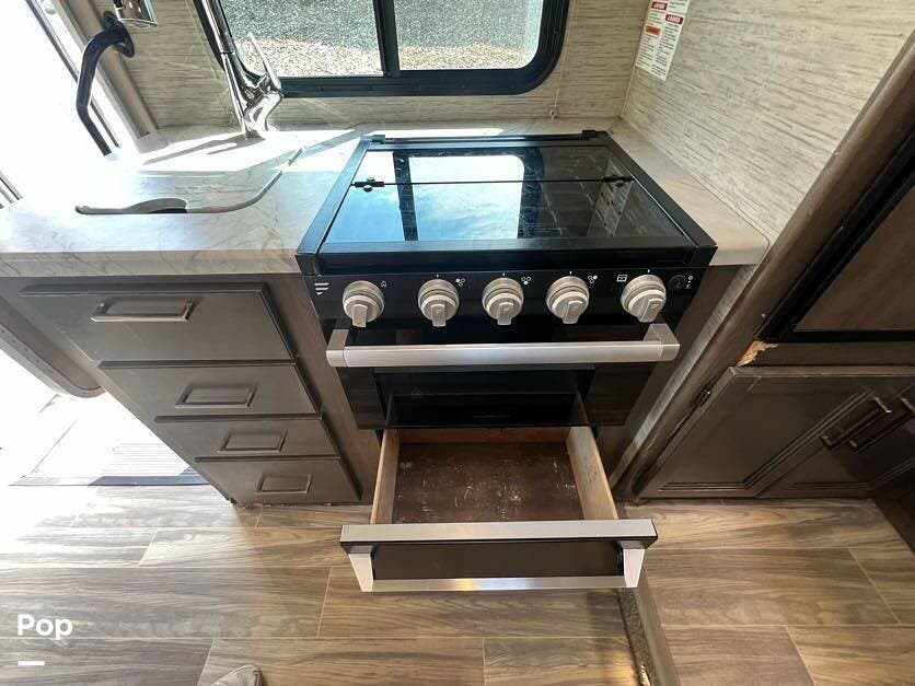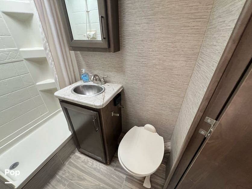 The fully equipped kitchen has everything you need for meals on the road, and the bathroom includes a shower, toilet, and vanity--no campground restrooms required.