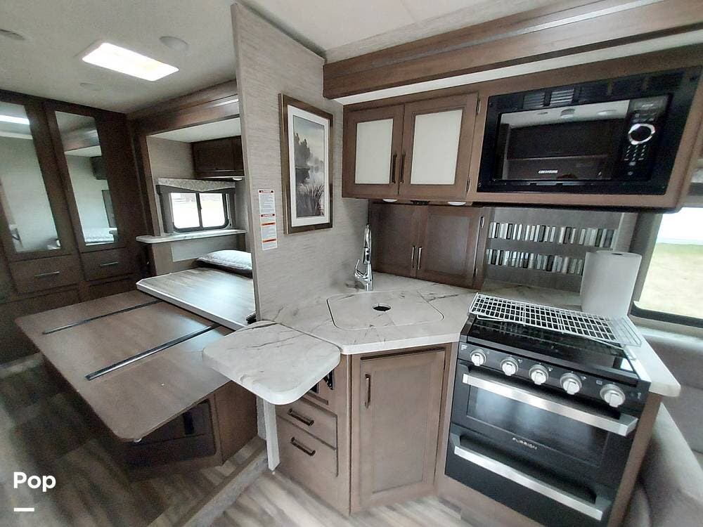 In the kitchen, amenities such as a three-burner gas cooktop, microwave, large refrigerator, and substantial countertop space ensure seamless meal preparation. The dining area doubles as an additional sleeping space using the Dream Dinette.