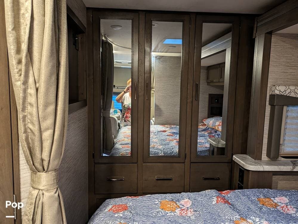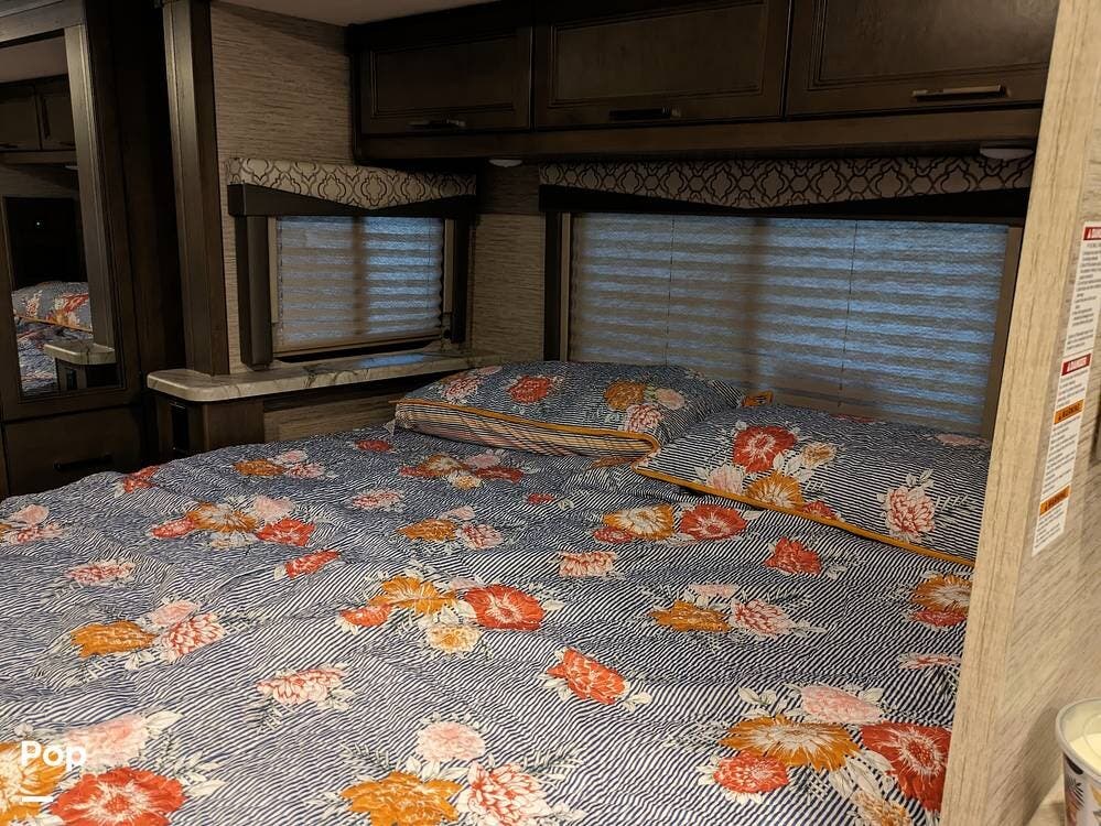 The motorhome's exterior comes with a 20' power patio awning with integrated LED lighting, providing an ideal spot to unwind outdoors.