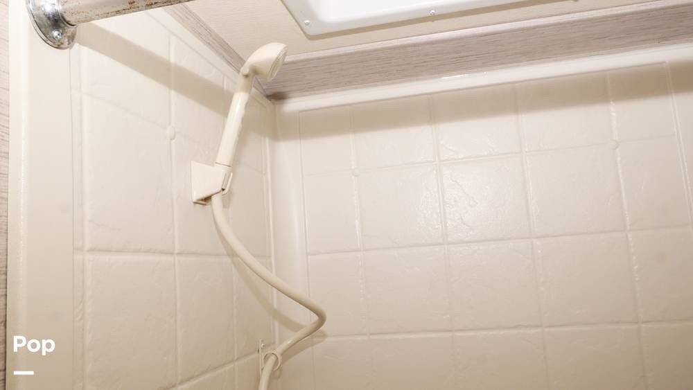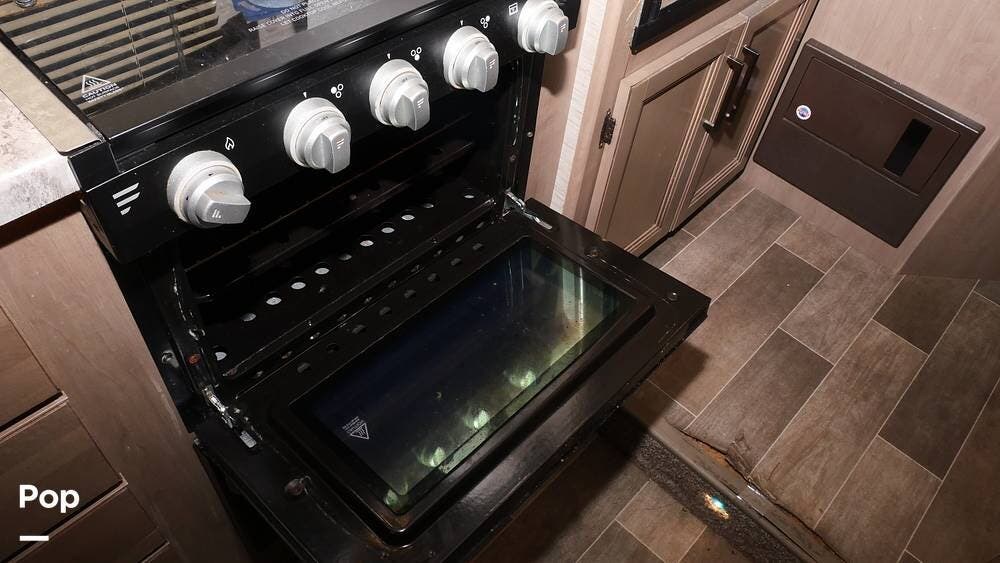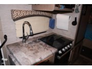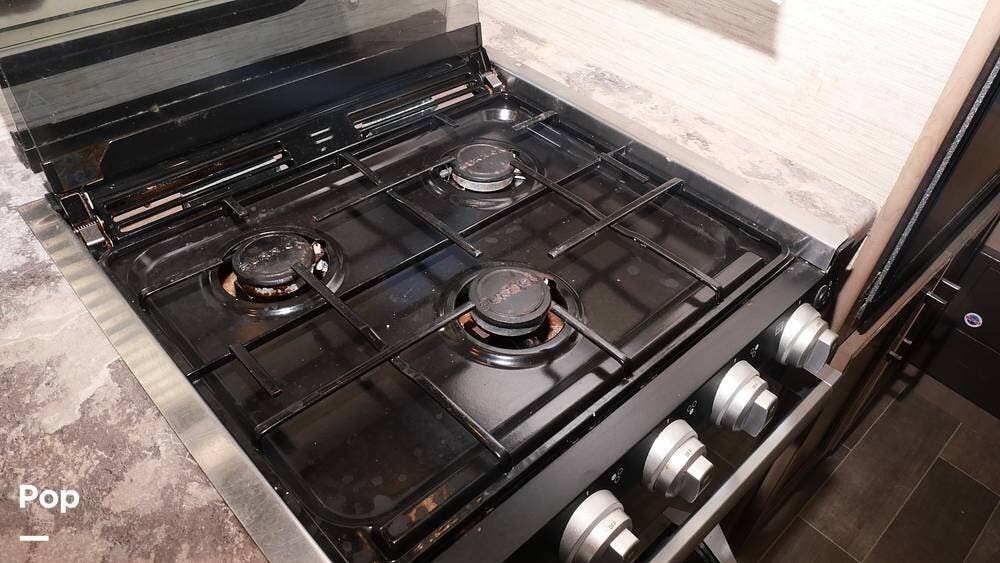 Inside, you'll find a cozy rear bed, a full bathroom with a shower, and a functional kitchen complete with a 3-burner stove and oven, a microwave, a sink, and a mid-size refrigerator.