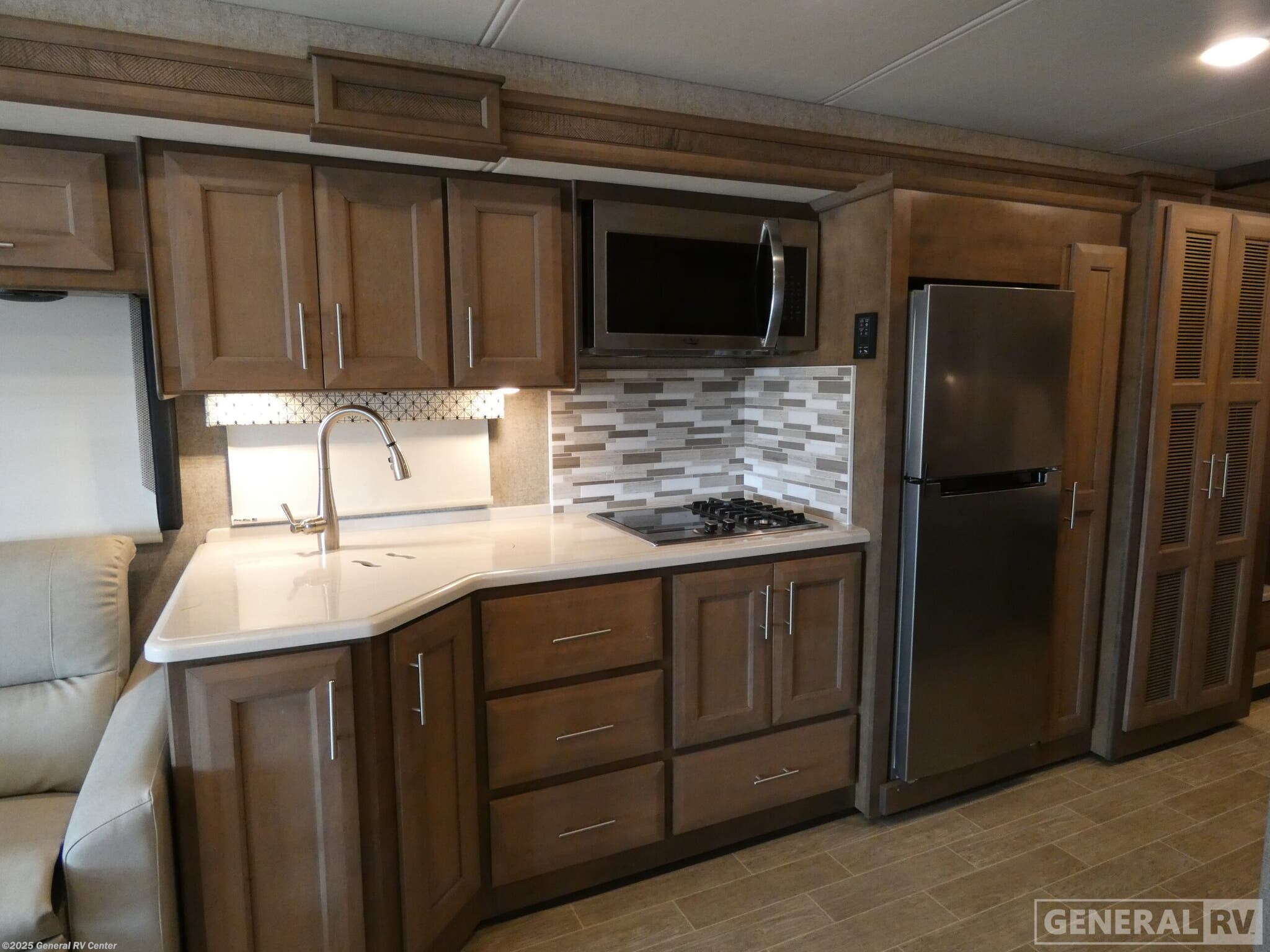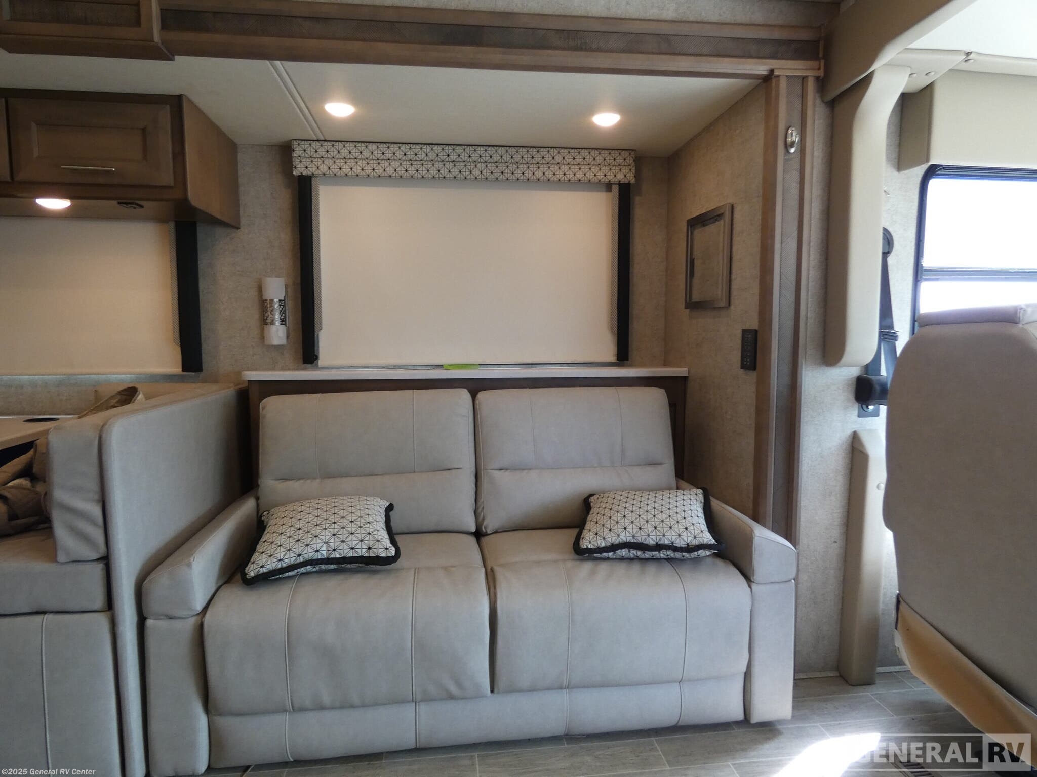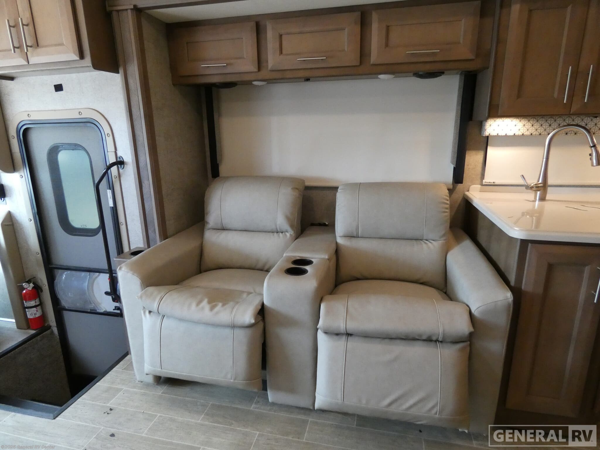 Experience the open road like never before with the 2021 Thor Motor Coach Miramar 35.2. This luxurious motorhome is designed to be your home away from home, offering ample space and comfort for up to eight adventurers. The master suite boasts a Tilt-A-View inclining king bed, ensuring restful nights after a day of exploration. The spacious living area features a 68" sofa bed and a 70" dream dinette, perfect for relaxing or entertaining guests. The drop-down overhead bunk adds versatility, providing additional sleeping space without compromising on style or comfort. The Miramar 35.2 is equipped with a modern center kitchen, complete with a full-size refrigerator and convection cooking, making meal preparation a breeze. The theater seating invites you to unwind with a movie night on the retractable 49" LED TV. With a 20 ft. powered retractable awning, you can enjoy outdoor gatherings, rain or shine. Built on a robust Ford F-Series Super Duty chassis and powered by a Triton V10 engine, this RV delivers both power and reliability, ensuring smooth travels wherever the road takes you. For more details, visit your nearest General RV dealership and start your journey today!