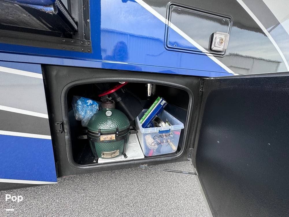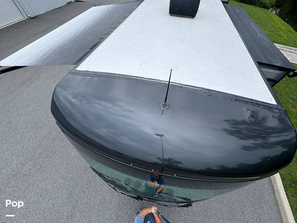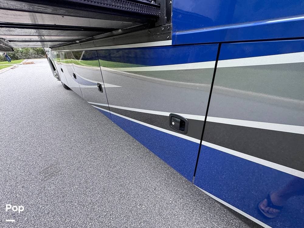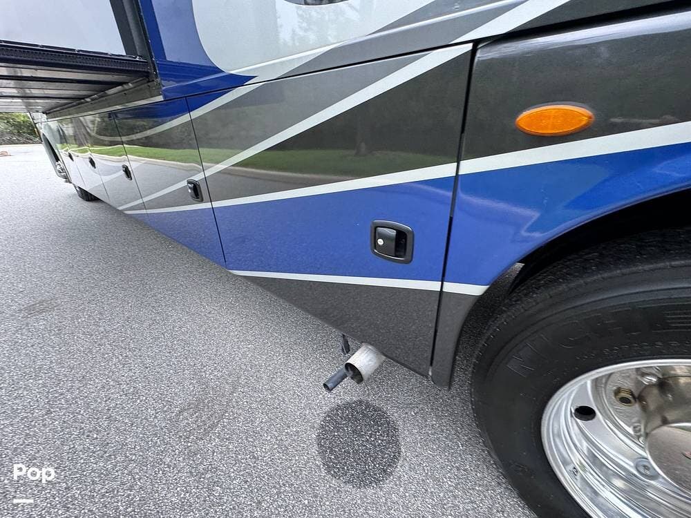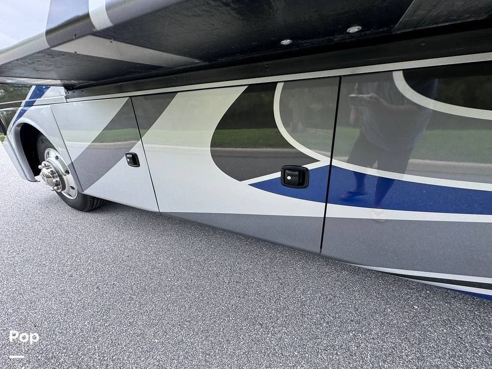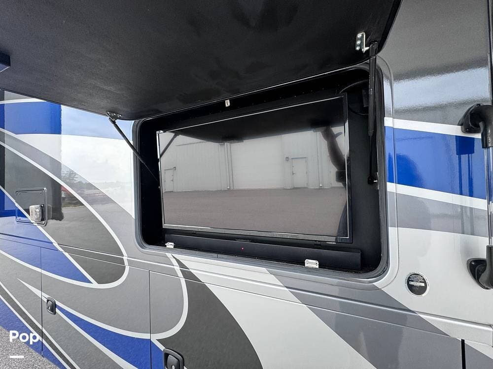 The exterior features three slides, leveling jacks, a Blue Ox towing system, an RVI wireless braking system, Tyron wheel bands (making it much safer in case of a blowout), a rooftop Winegard satellite antenna, a popout television, a ceramic coating to protect the paint from fade.
