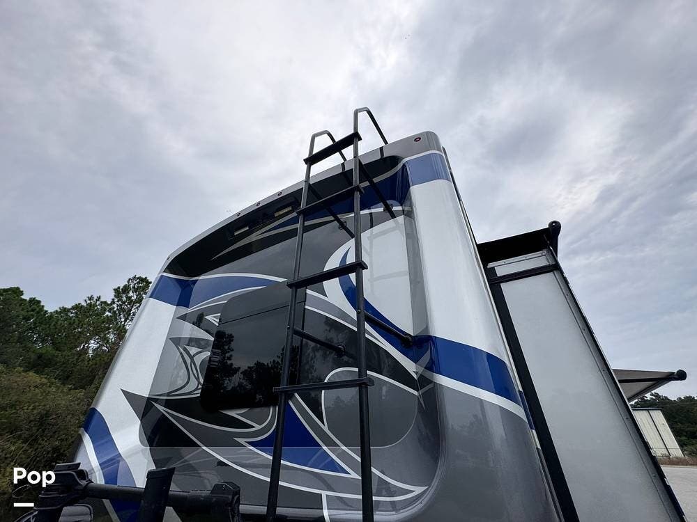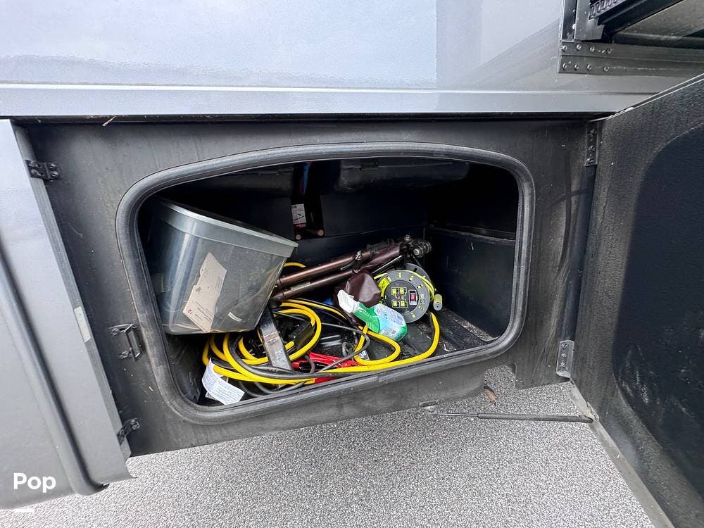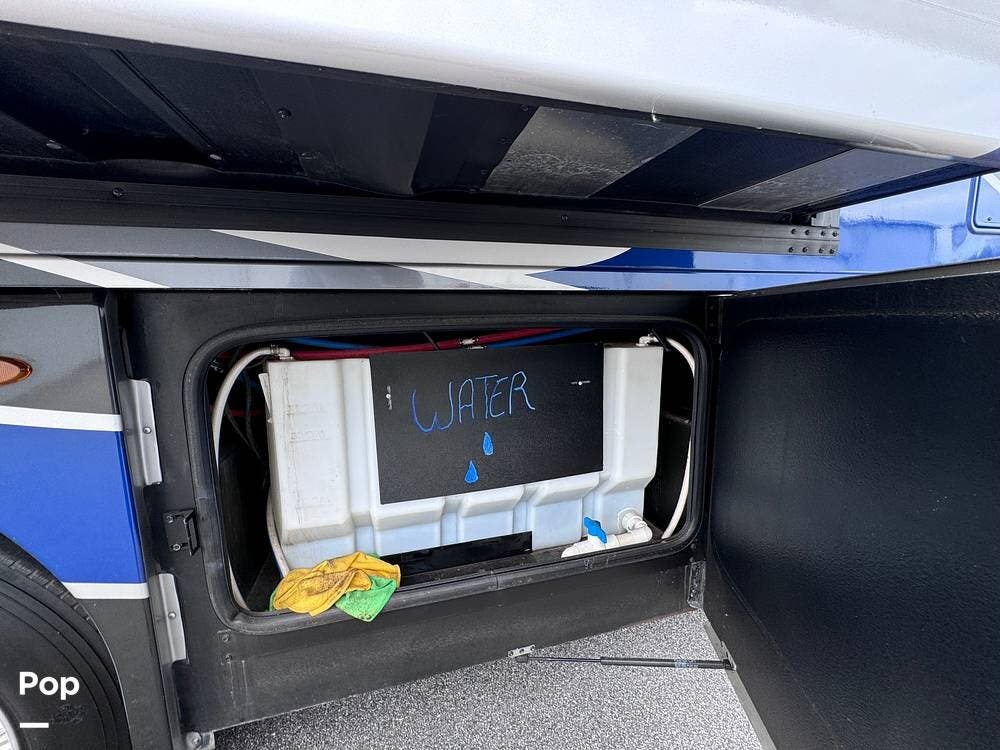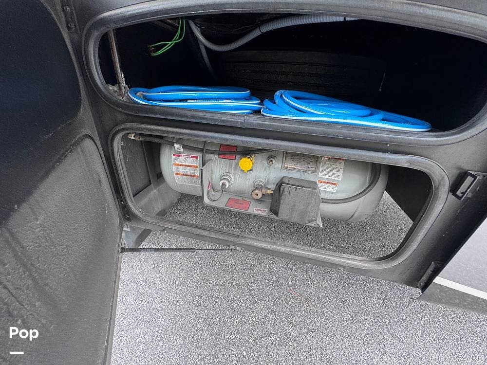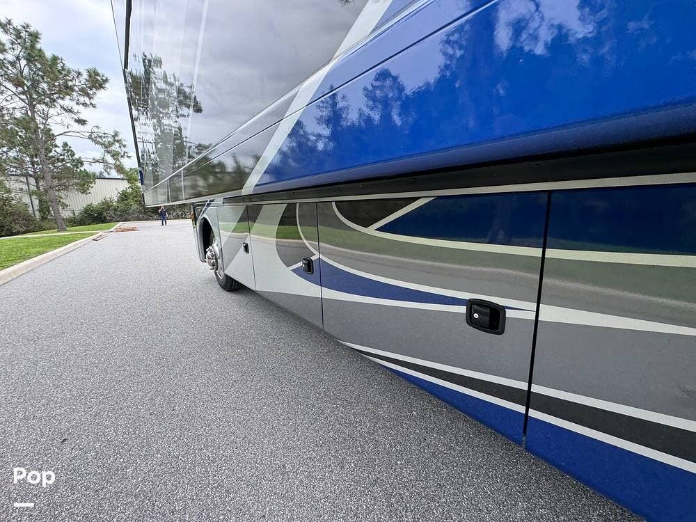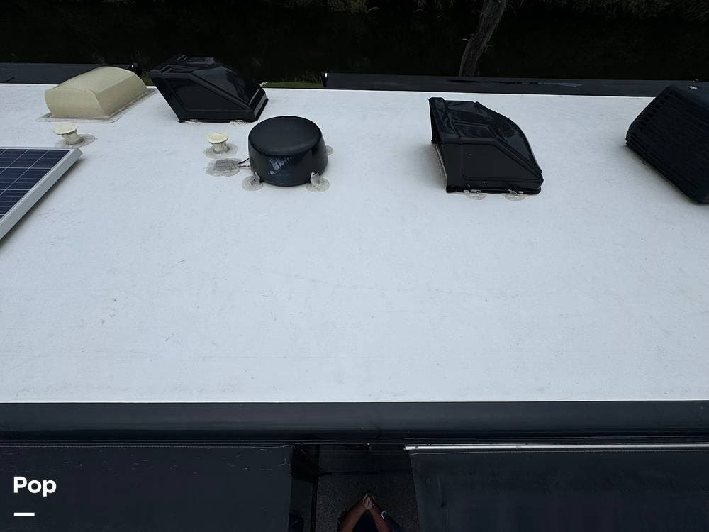 The exterior features three slides, leveling jacks, a Blue Ox towing system, an RVI wireless braking system, Tyron wheel bands (making it much safer in case of a blowout), a rooftop Winegard satellite antenna, a popout television, a ceramic coating to protect the paint from fade.