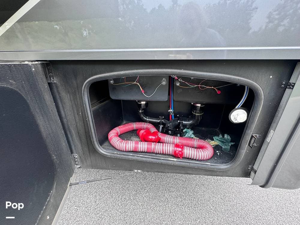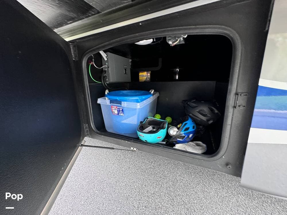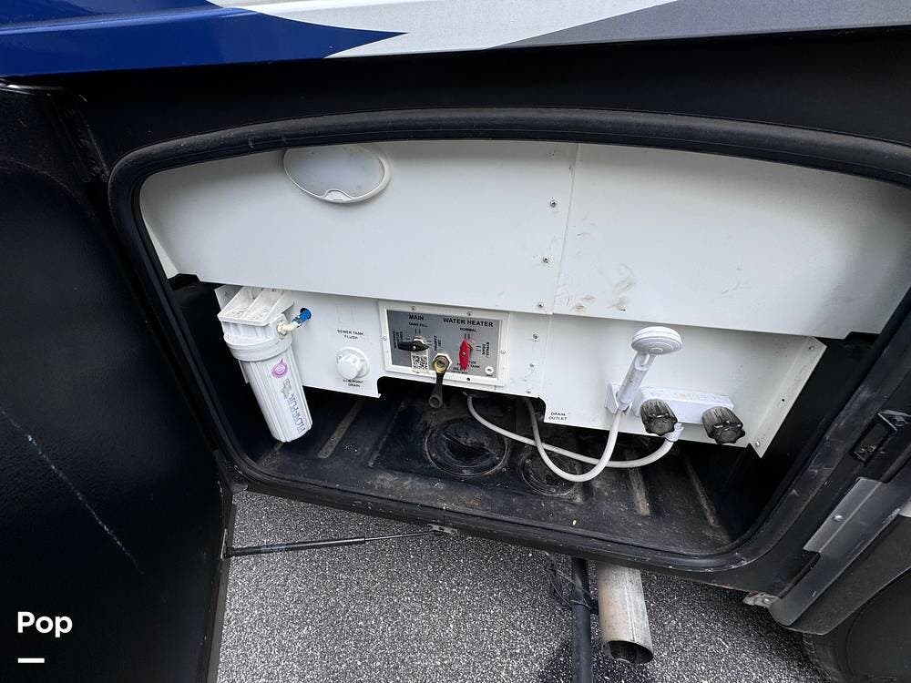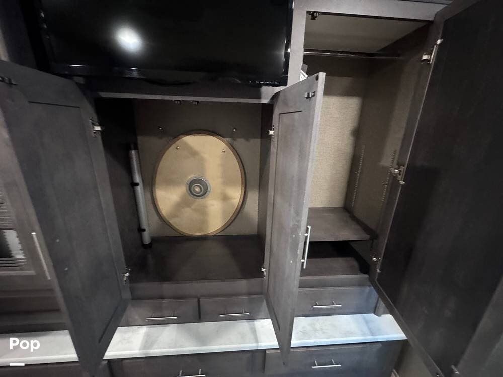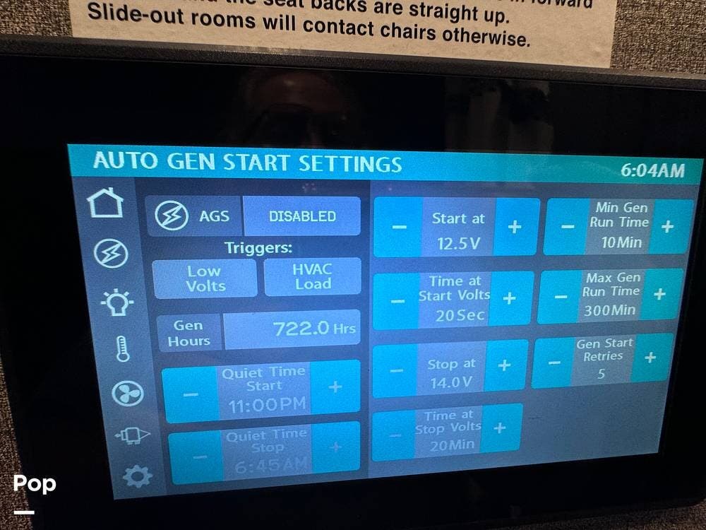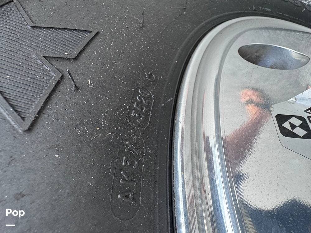 The exterior features three slides, leveling jacks, a Blue Ox towing system, an RVI wireless braking system, Tyron wheel bands (making it much safer in case of a blowout), a rooftop Winegard satellite antenna, a popout television, a ceramic coating to protect the paint from fade.