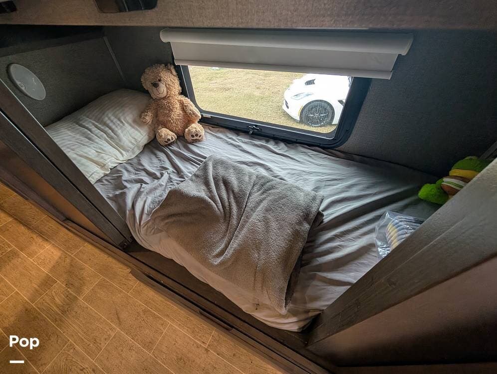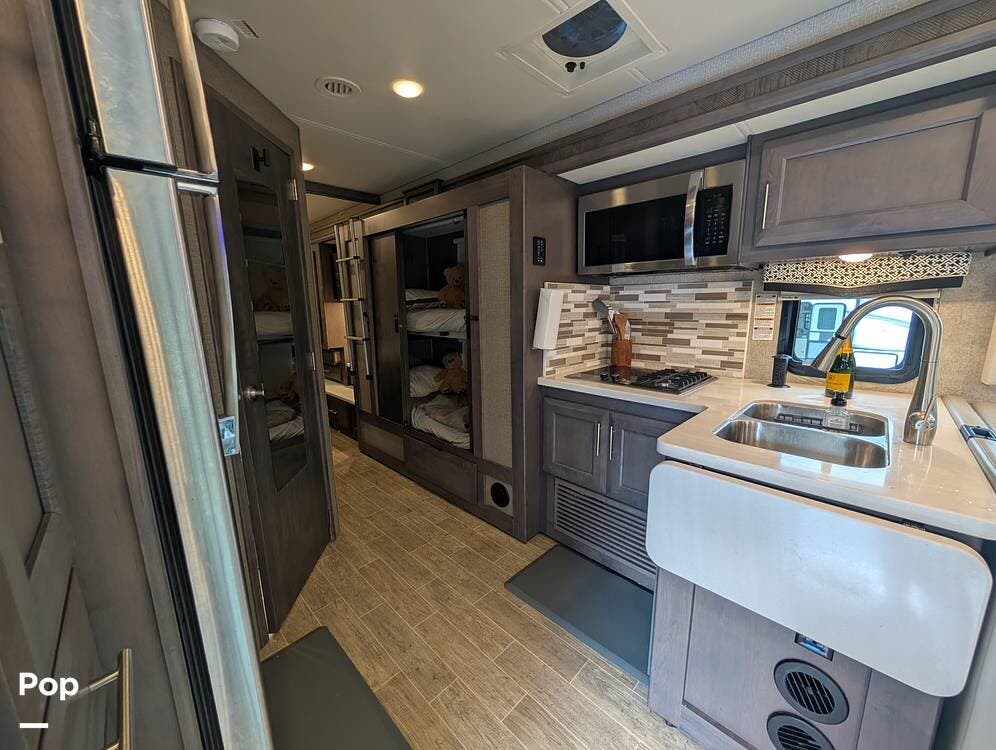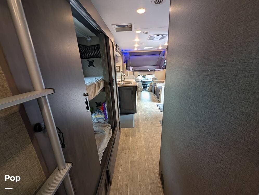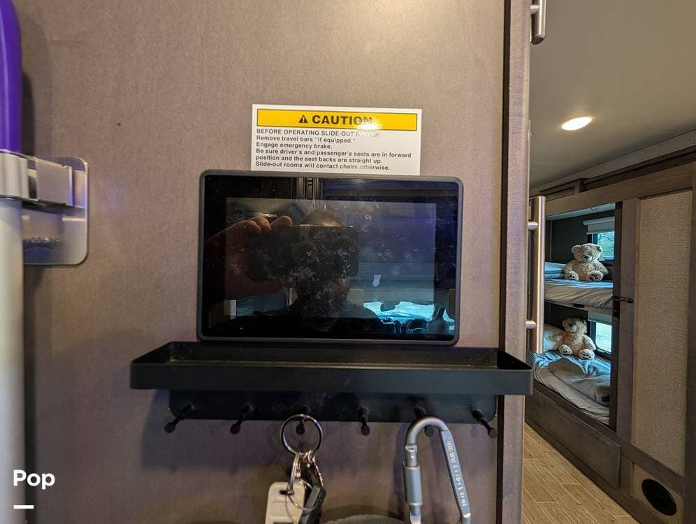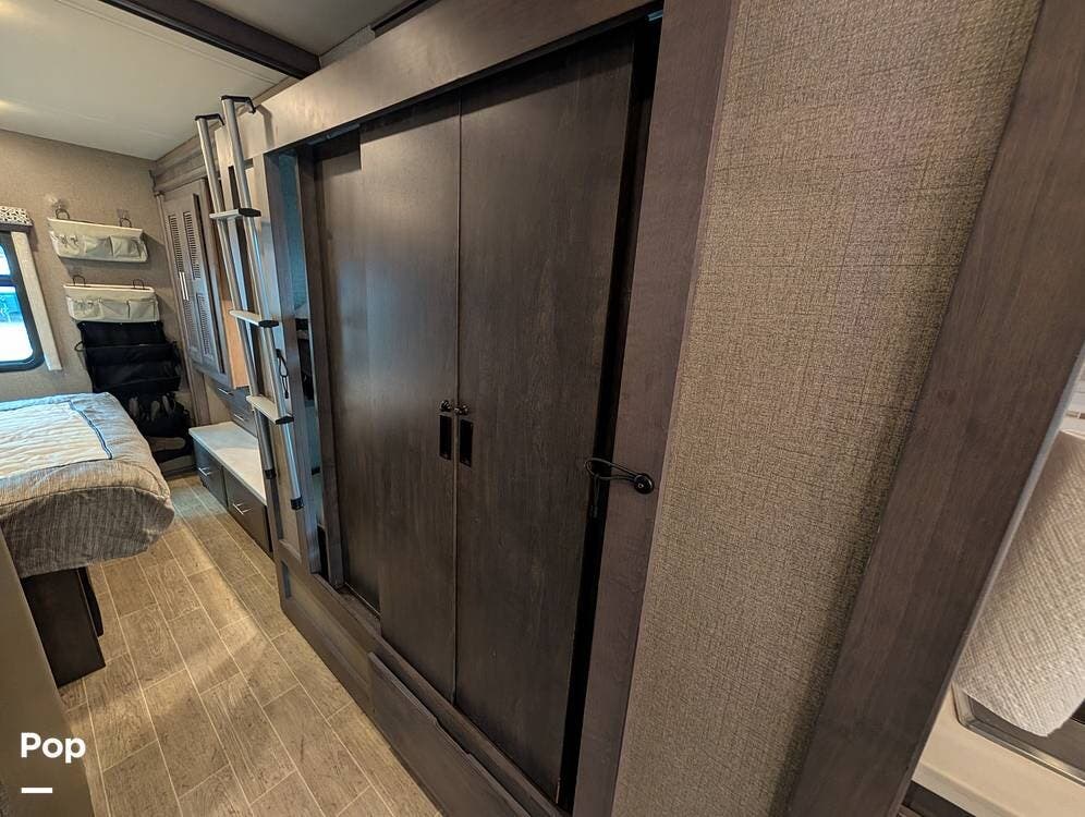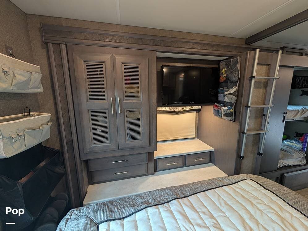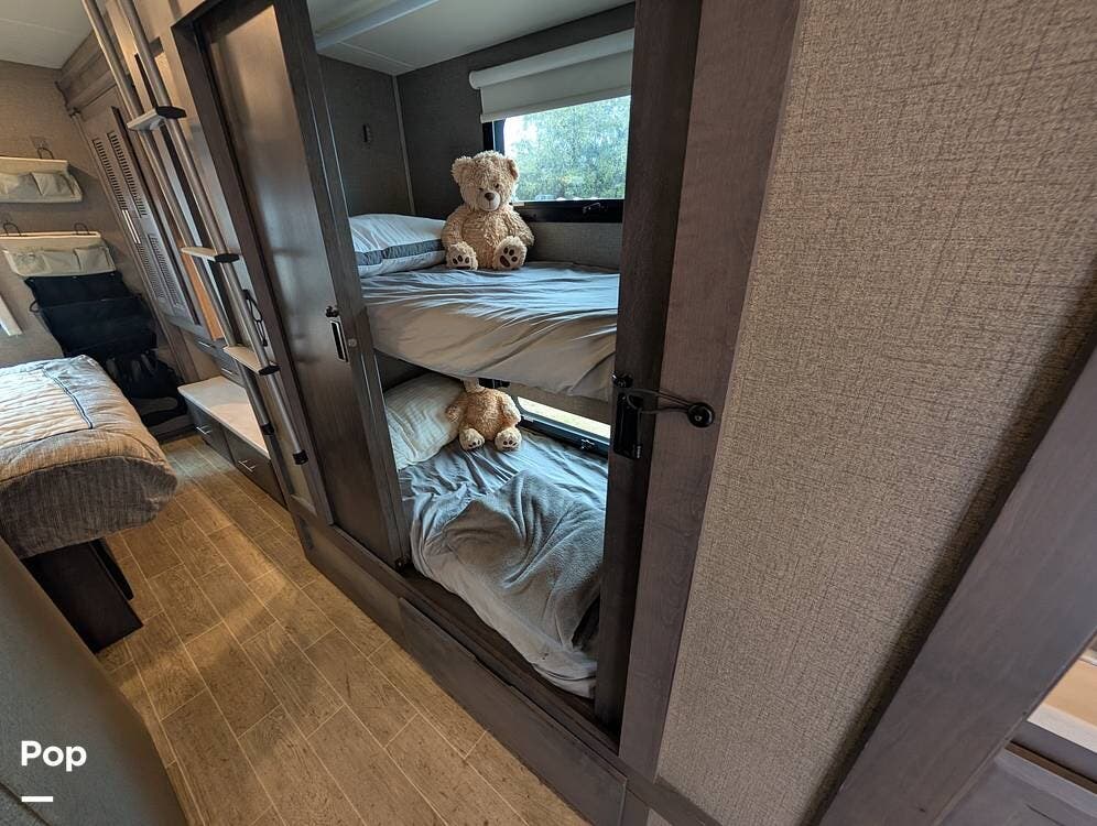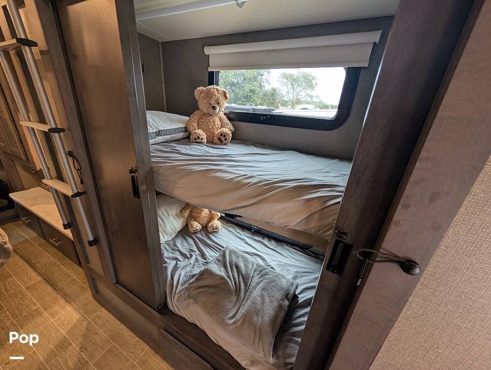 Inside, the full-wall slide opens the coach into an expansive living space that comfortably sleeps up to eight. The huge cabover bunk with power shade offers generous sleeping space, while twin bunks with windows, tablet mounts, and wooden privacy doors create the perfect bunkhouse setup for kids or guests.