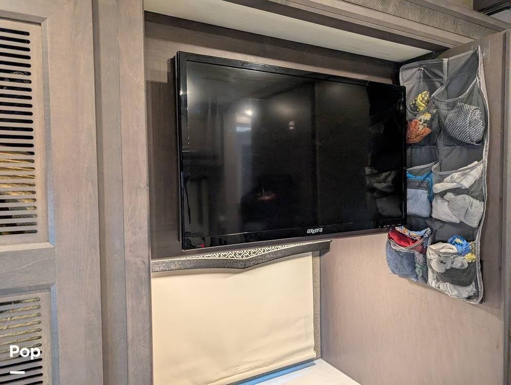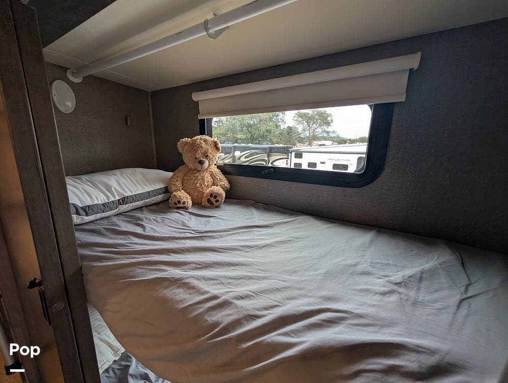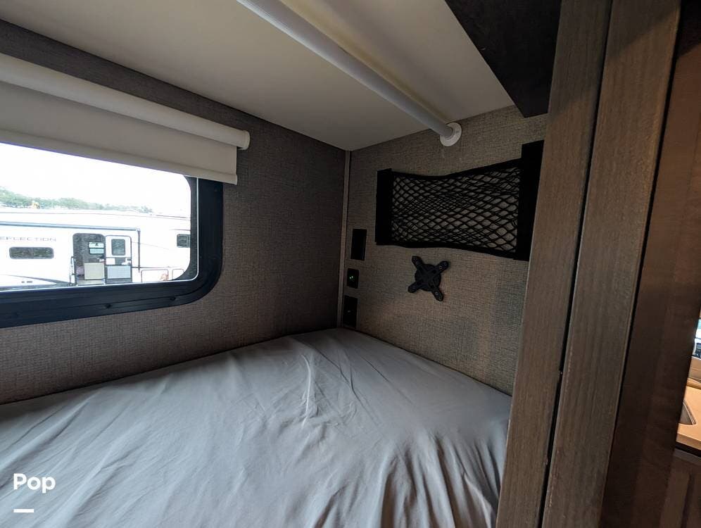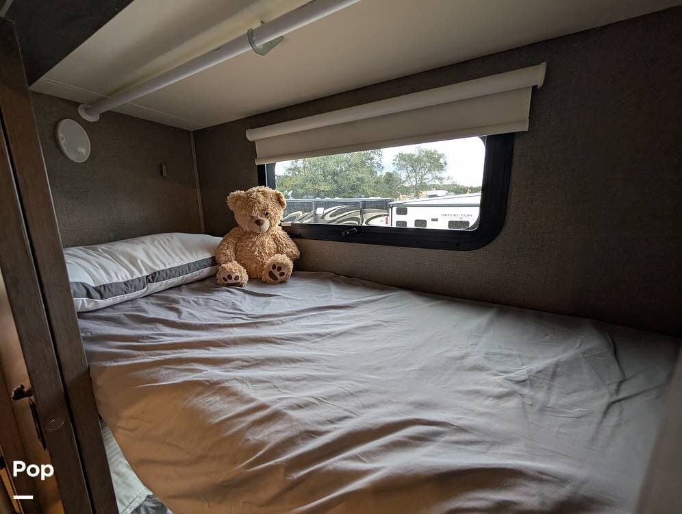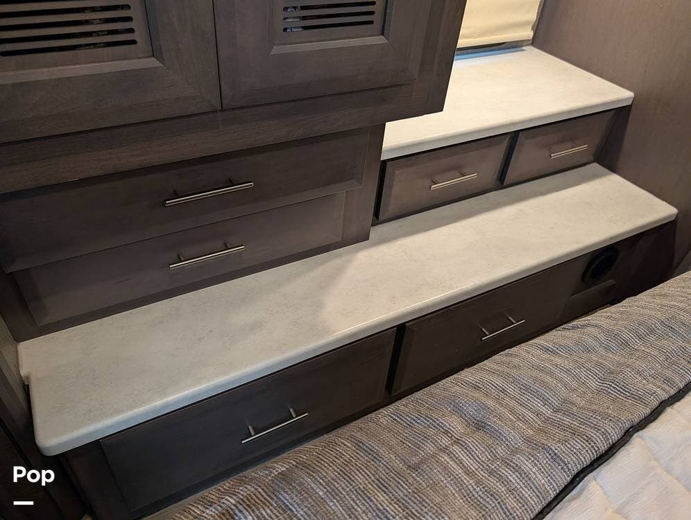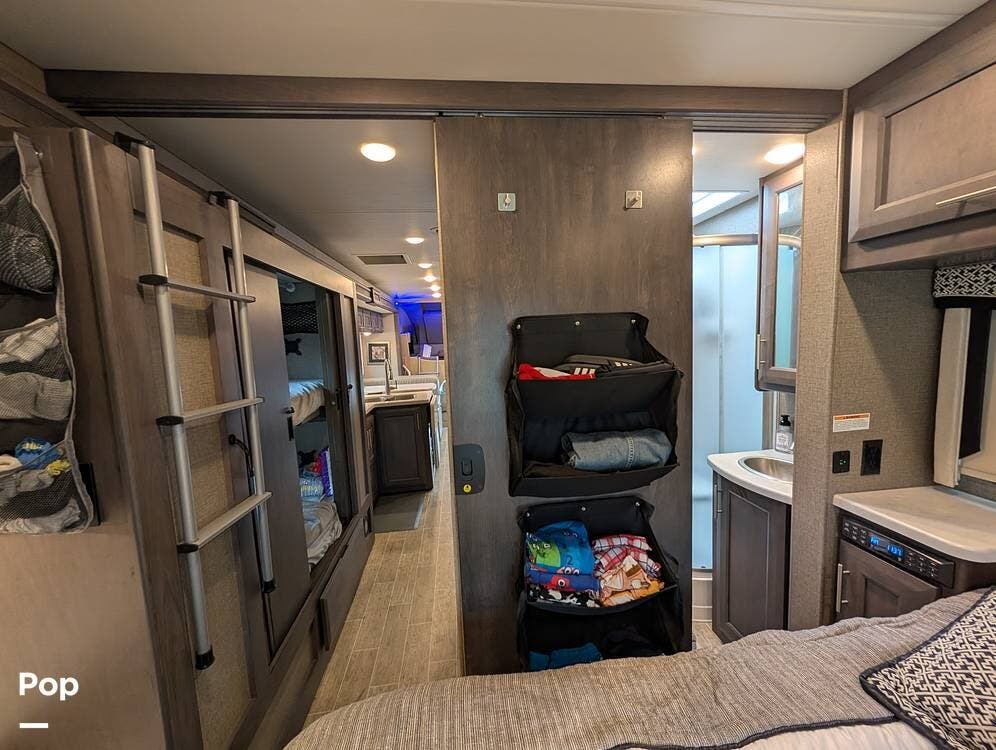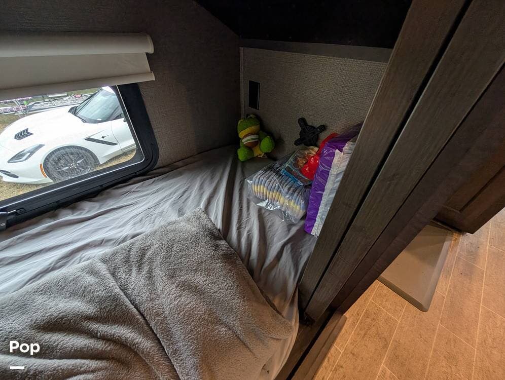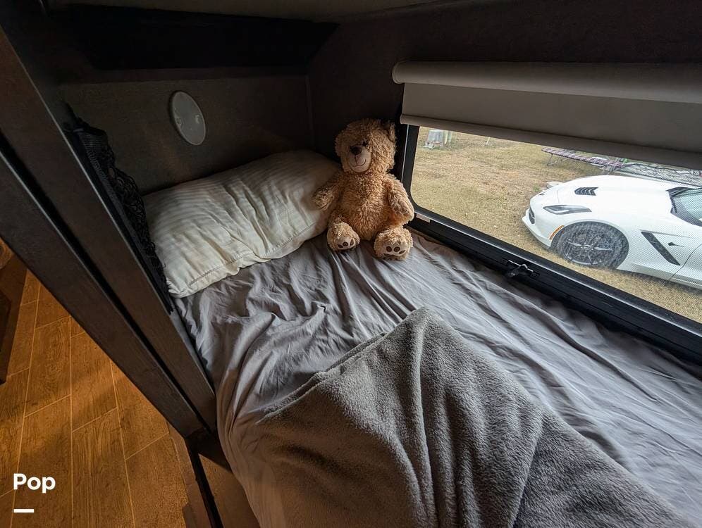 Inside, the full-wall slide opens the coach into an expansive living space that comfortably sleeps up to eight. The huge cabover bunk with power shade offers generous sleeping space, while twin bunks with windows, tablet mounts, and wooden privacy doors create the perfect bunkhouse setup for kids or guests.