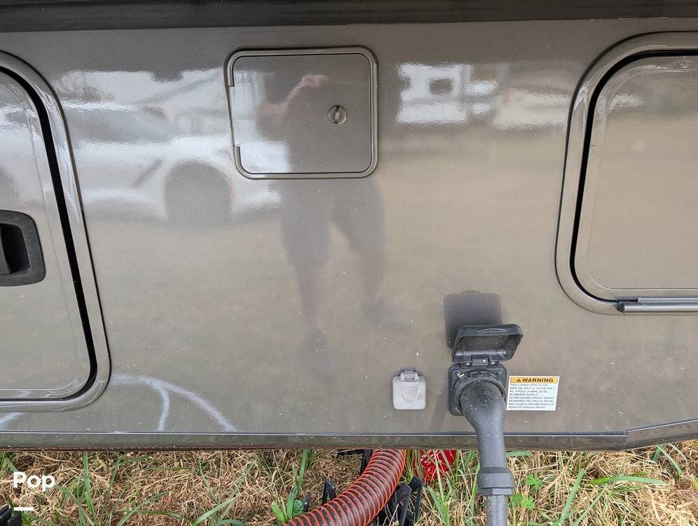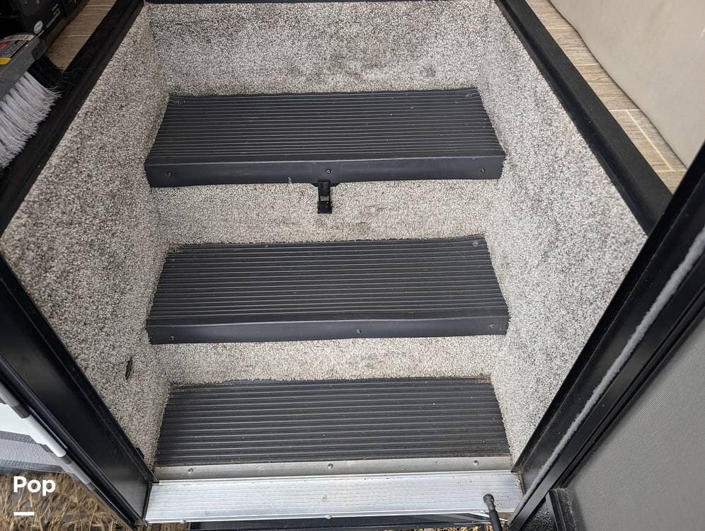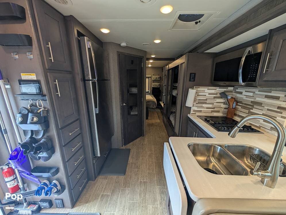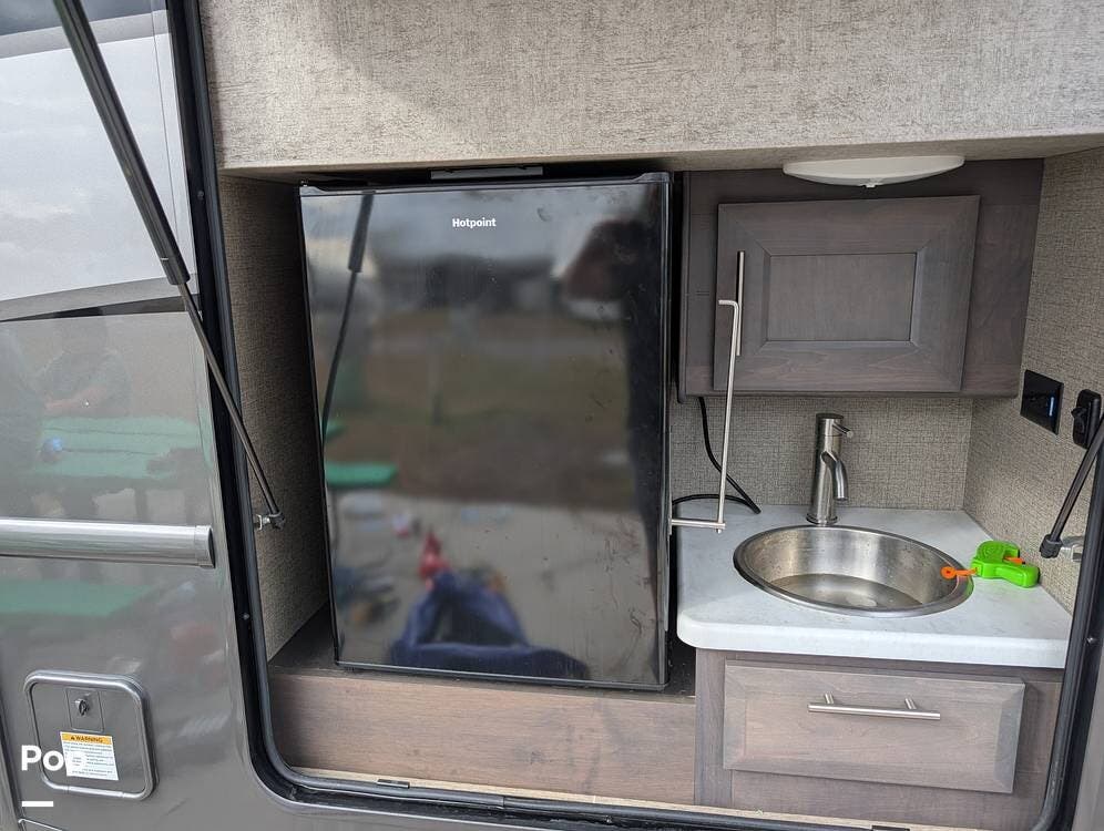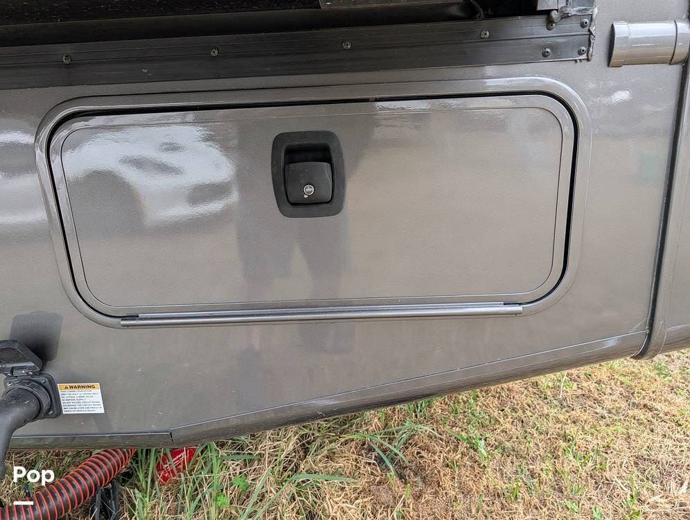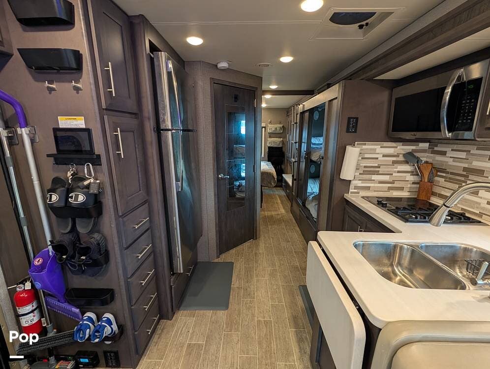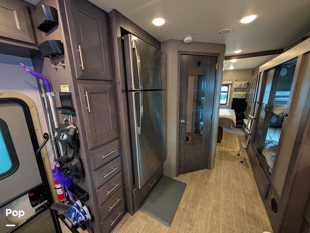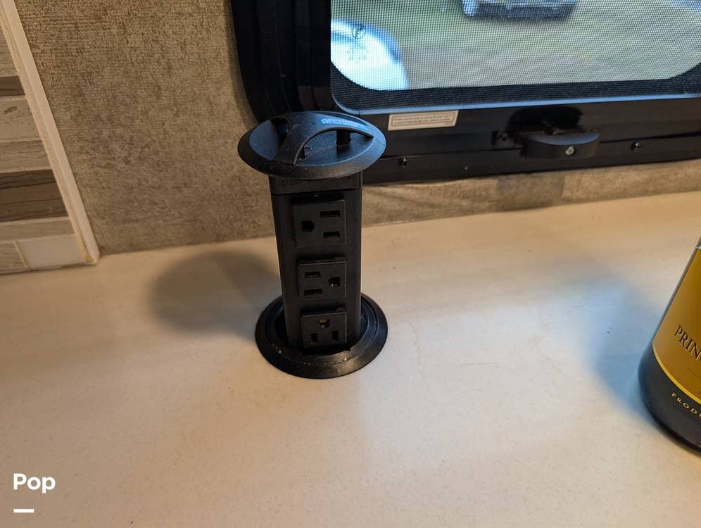 Inside, the full-wall slide opens the coach into an expansive living space that comfortably sleeps up to eight. The huge cabover bunk with power shade offers generous sleeping space, while twin bunks with windows, tablet mounts, and wooden privacy doors create the perfect bunkhouse setup for kids or guests.