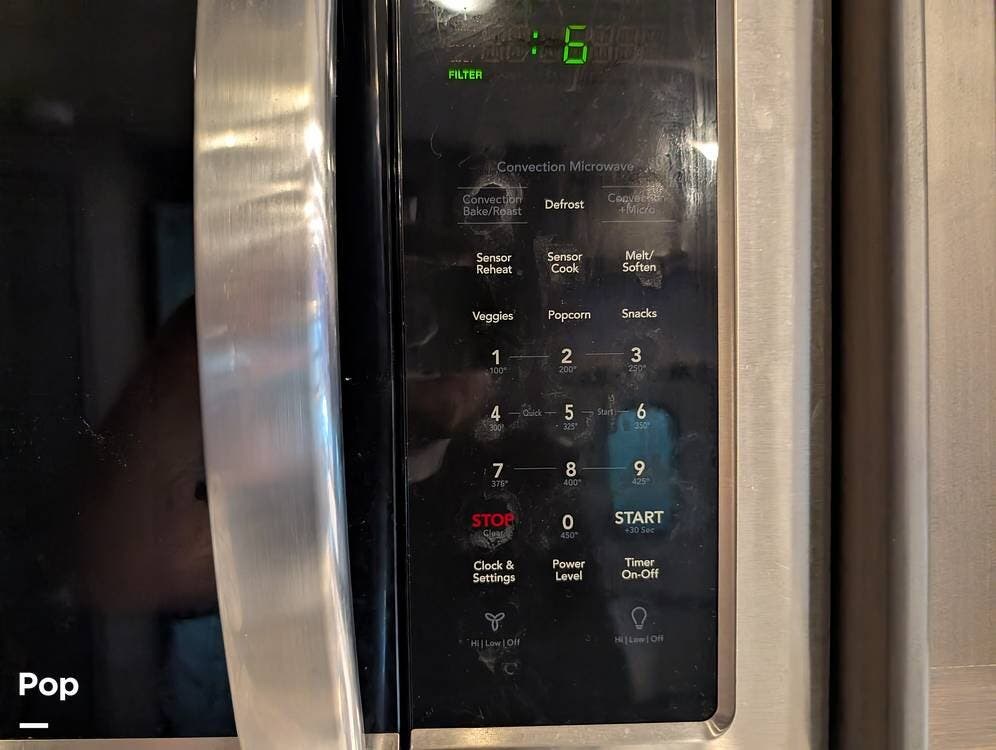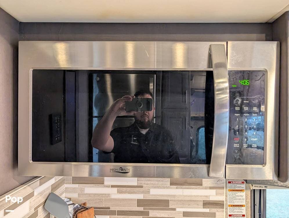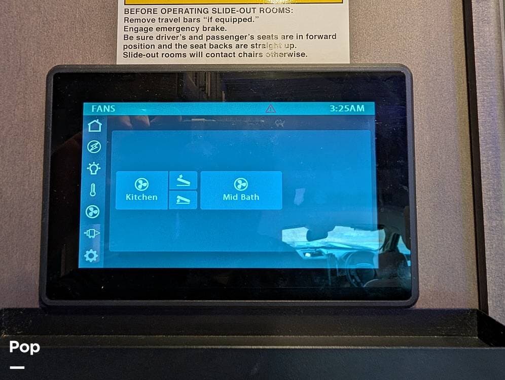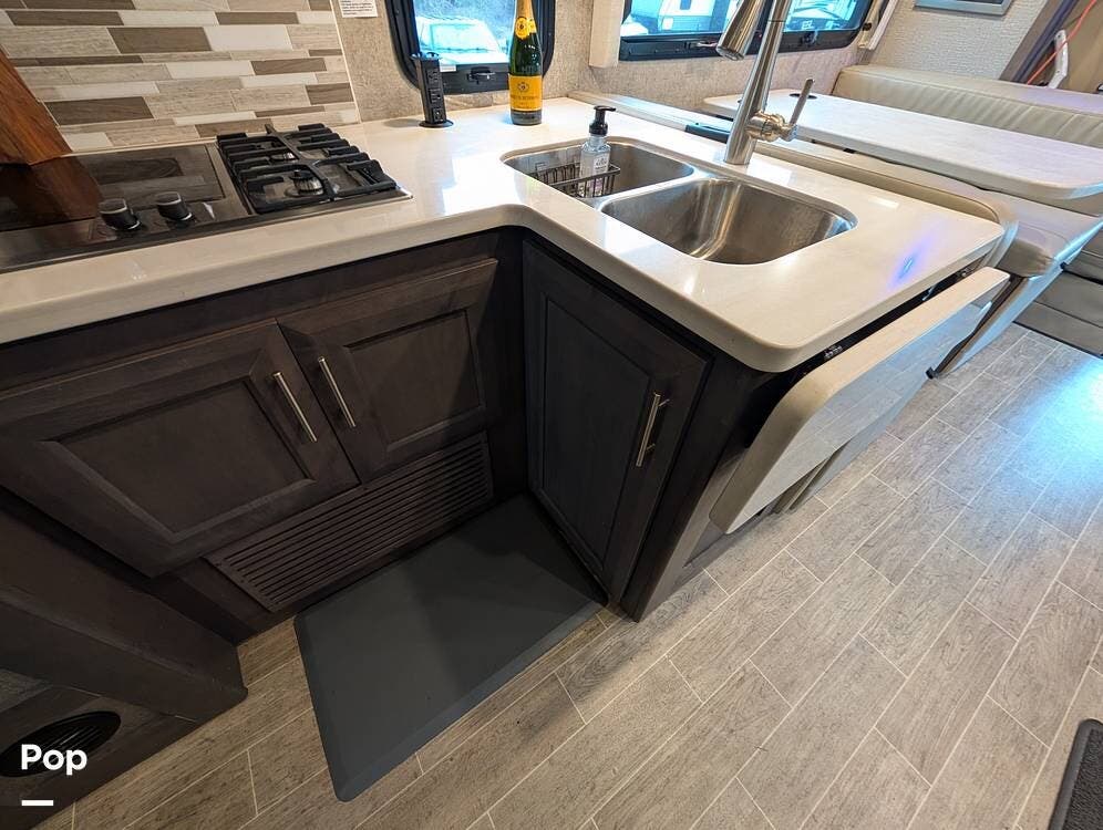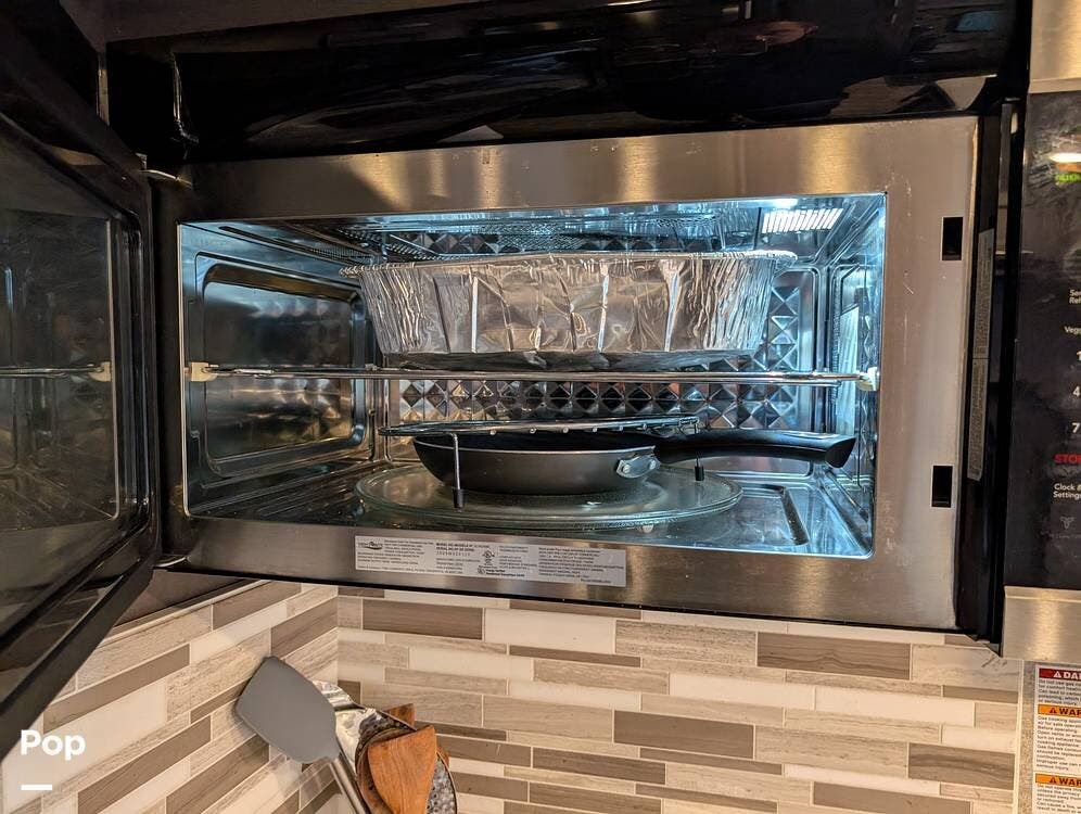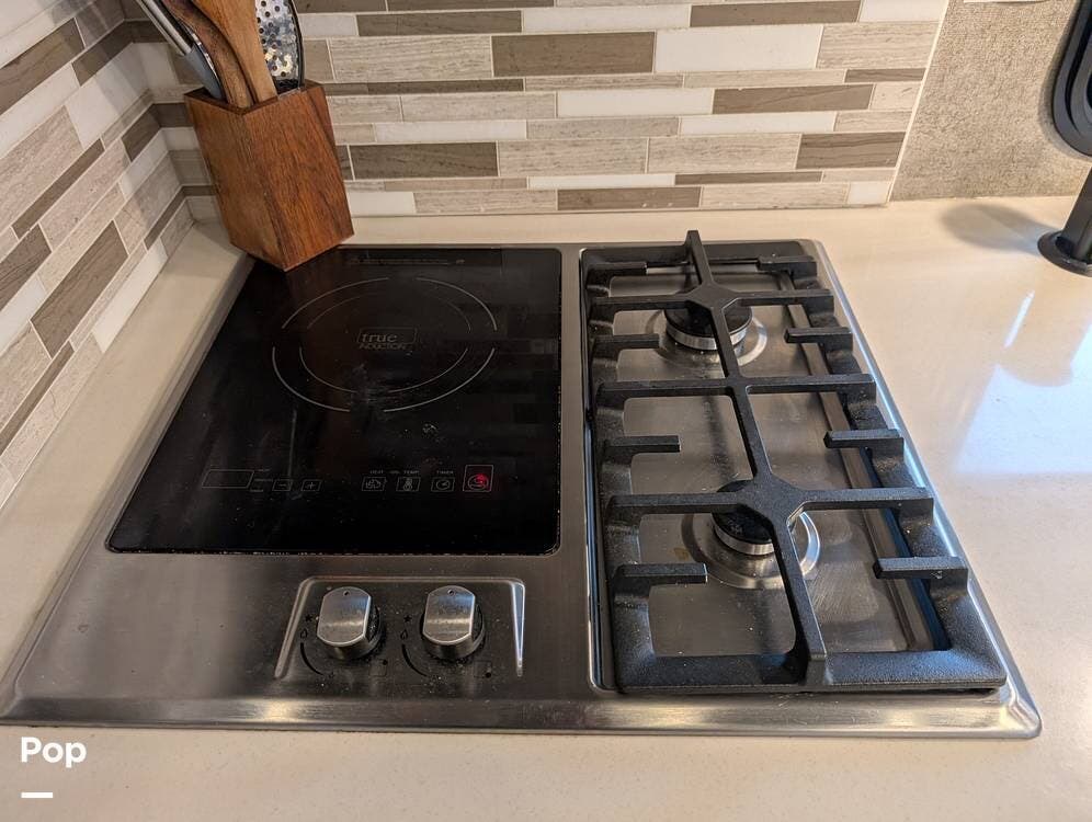 The kitchen is both functional and stylish, featuring a 12-volt refrigerator/freezer, microwave, induction and gas cooktop, dual stainless steel sink, and abundant cabinetry for storage. Everything you need for extended trips is right at your fingertips. A large TV on an adjustable mount anchors the living area for comfortable movie nights.