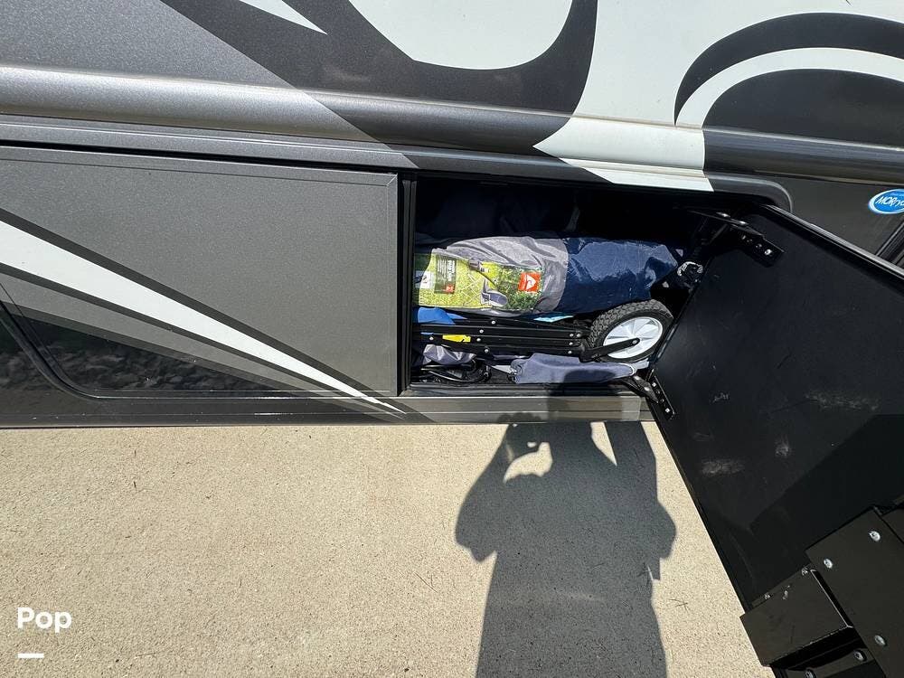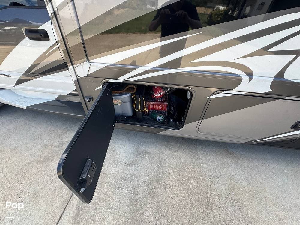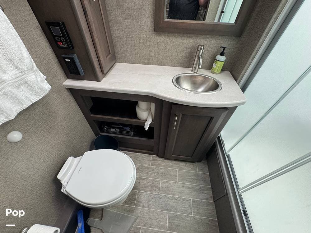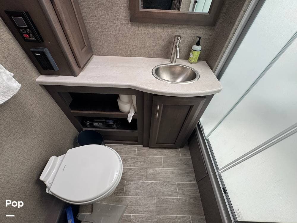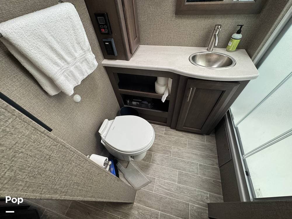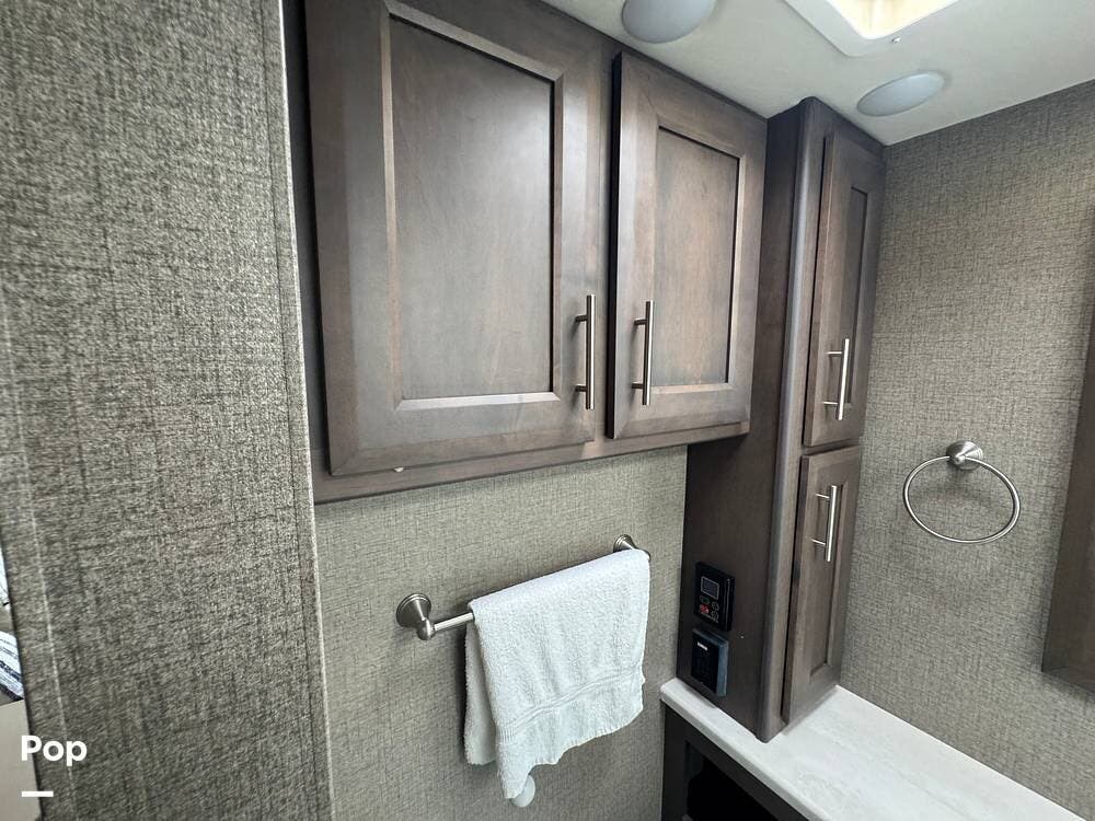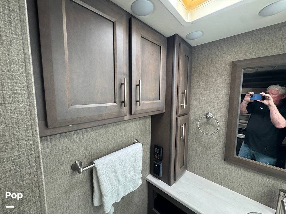 This RV also features luxurious living, complete with a king-size bed and a spacious bathroom.