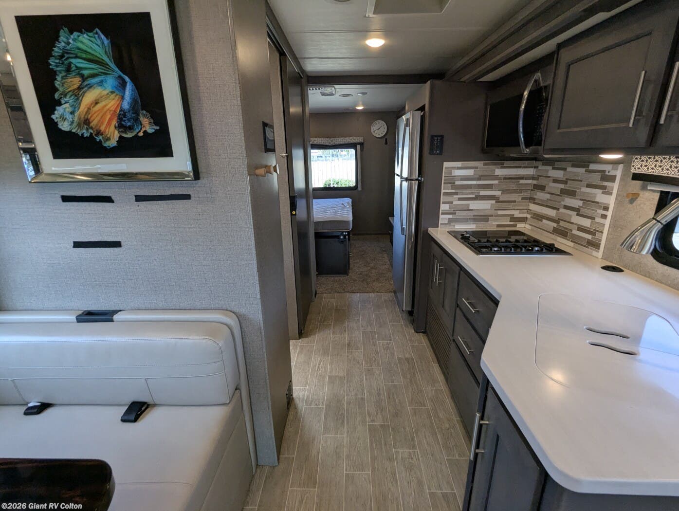 - Modern Kitchen: Features a residential refrigerator, 2-burner gas/induction cooktop, and solid surface countertops.