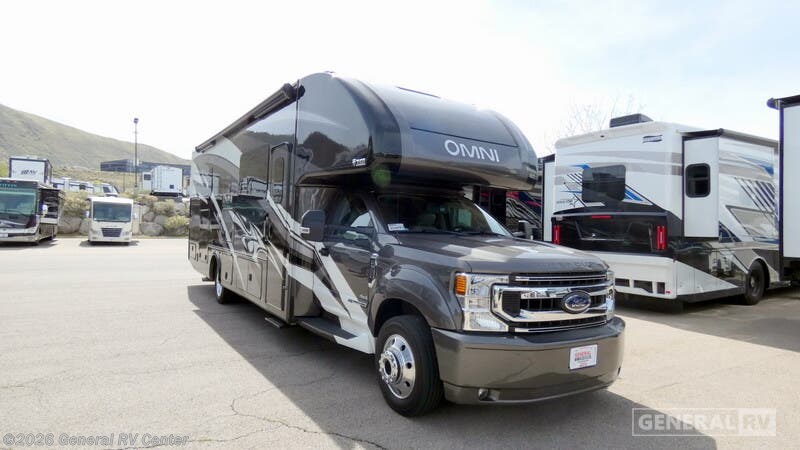 **Thor Motor Coach Omni Super C diesel motorhome SV34 highlights:** * Rear Private Bedroom * Residential Refrigerator * Exterior Entertainment * Bunk Over Cab * Outdoor Kitchen * Full-Wall Slide Check out this Omni Super C diesel motorhome! It features a comfortable 59" x 80" bunk over the cab with a skylight and a 39" TV on a swivel mount. You can choose to cook your meals at either of the two kitchens, one inside and one outside, plus you can keep your leftovers fresh in the spacious residential refrigerator. There is even an exterior 32" TV for your entertainment while cooking outdoors. Inside the rear private bedroom is a tilt-a-view inclining RV king bed for you to sink into and relax while watching your favorite movie on the 32" TV above the dresser. Plus, this model also comes with four-wheel drive! The type of trips you'll have with the Thor Motor Coach Omni Super C diesel motorhome are exciting, accommodating, luxurious, and unforgettable! Equipped with all of the latest technology, the Omni offers you a Winegard Connect Wi-Fi extender + 4G, a Bluetooth coach radio system, a digital TV antenna, USB charging ports, and a whole-house water filtration system. The 100W solar charging system allows you to prolong your travels by getting away from big groups of people, and the exterior 32" LED TV with Bluetooth sound bar and radio is just another feature which proves that the Omni has the best modern features around.