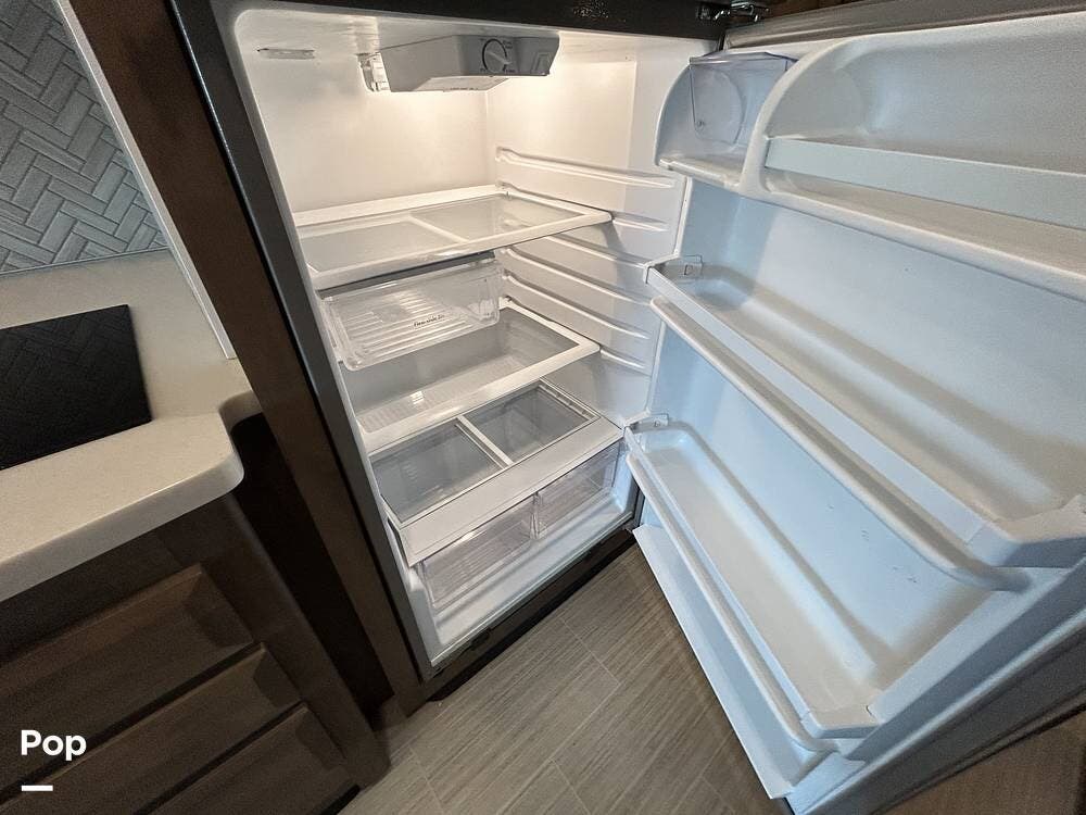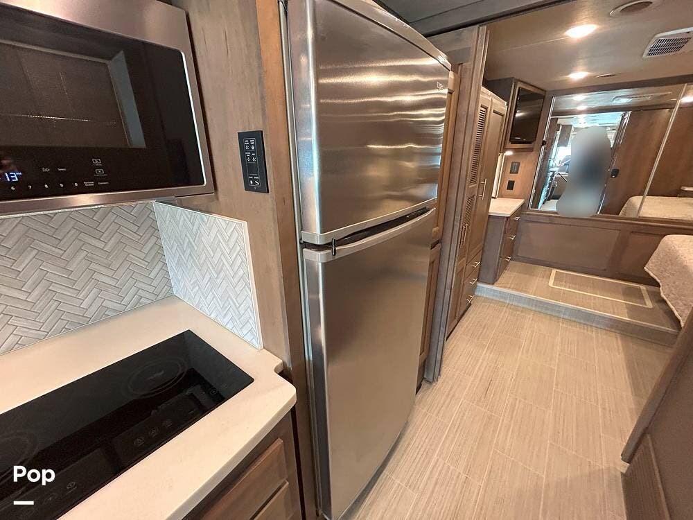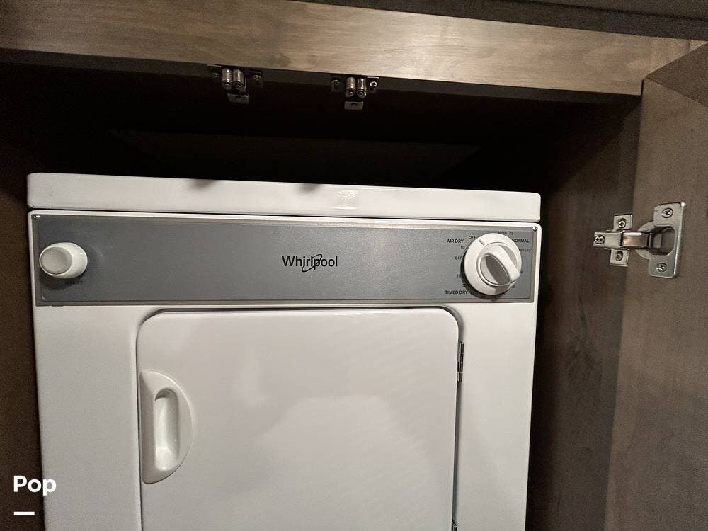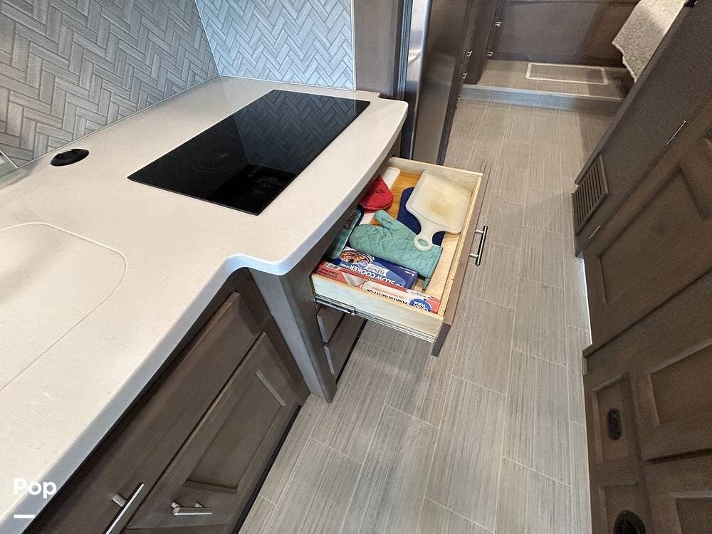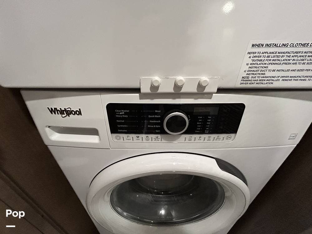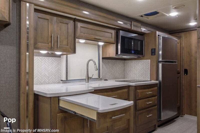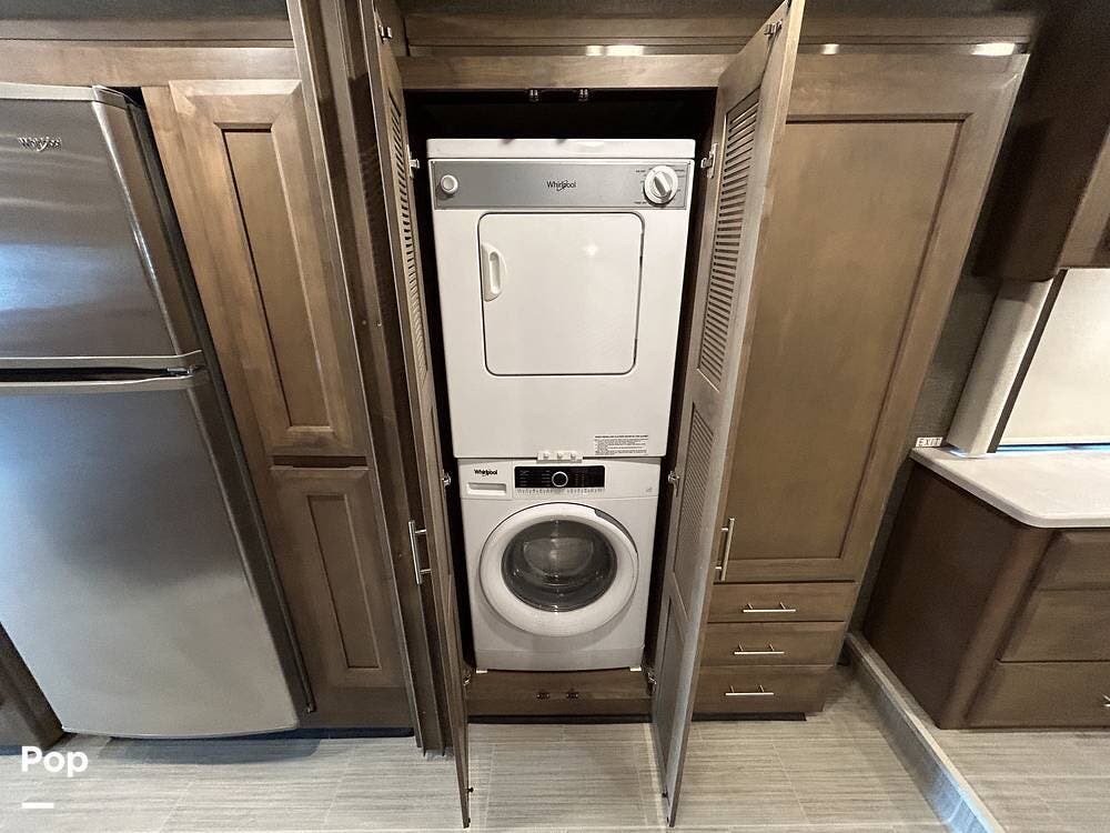 The fully equipped kitchen features solid-surface countertops, a residential refrigerator, and ample cabinetry, making it ideal for preparing home-cooked meals while on the road. A stacked washer and dryer are convenient, especially for long trips or full-time RV living.