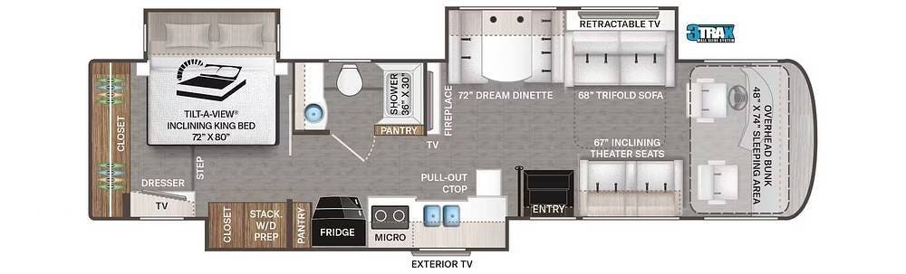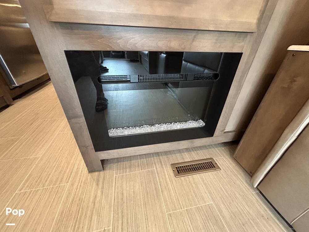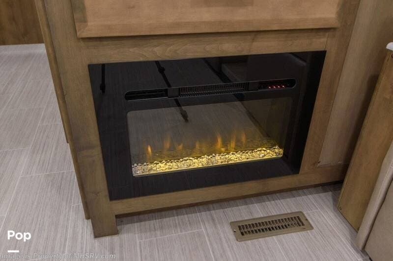 Inside, the coach feels like a luxury condo on wheels. The newly replaced flooring gives the entire space a modern, refreshed look. You'll love the plush theater seating, which is perfect for relaxing after a day of exploring, and the cozy ambiance created by the electric fireplace. When it's time for entertainment, the slide-up retractable TV appears at the touch of a button and tucks away neatly when not in use. Every detail has been thoughtfully designed to combine comfort with style.