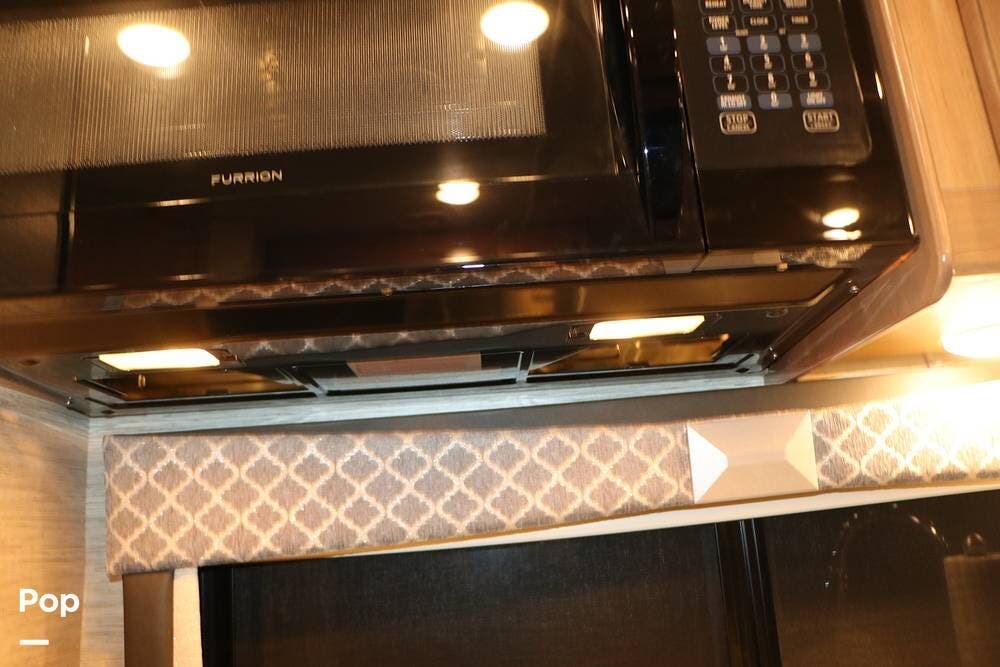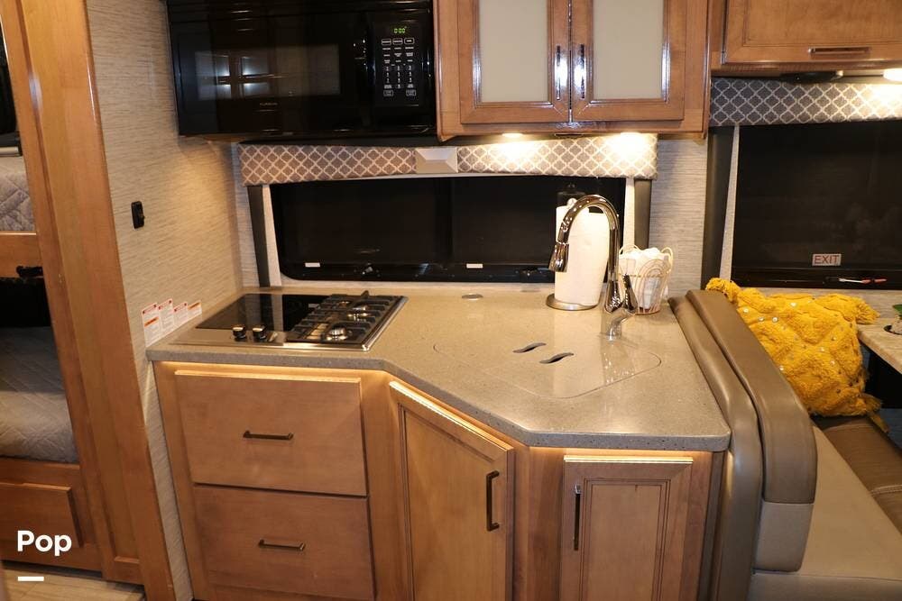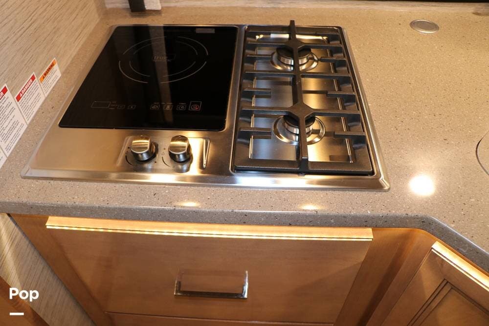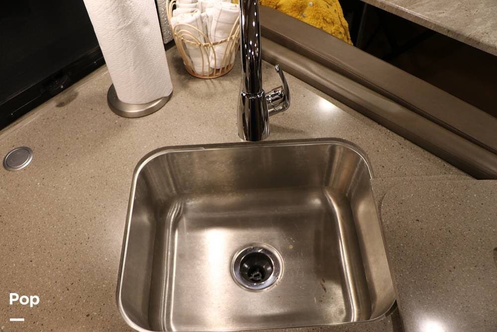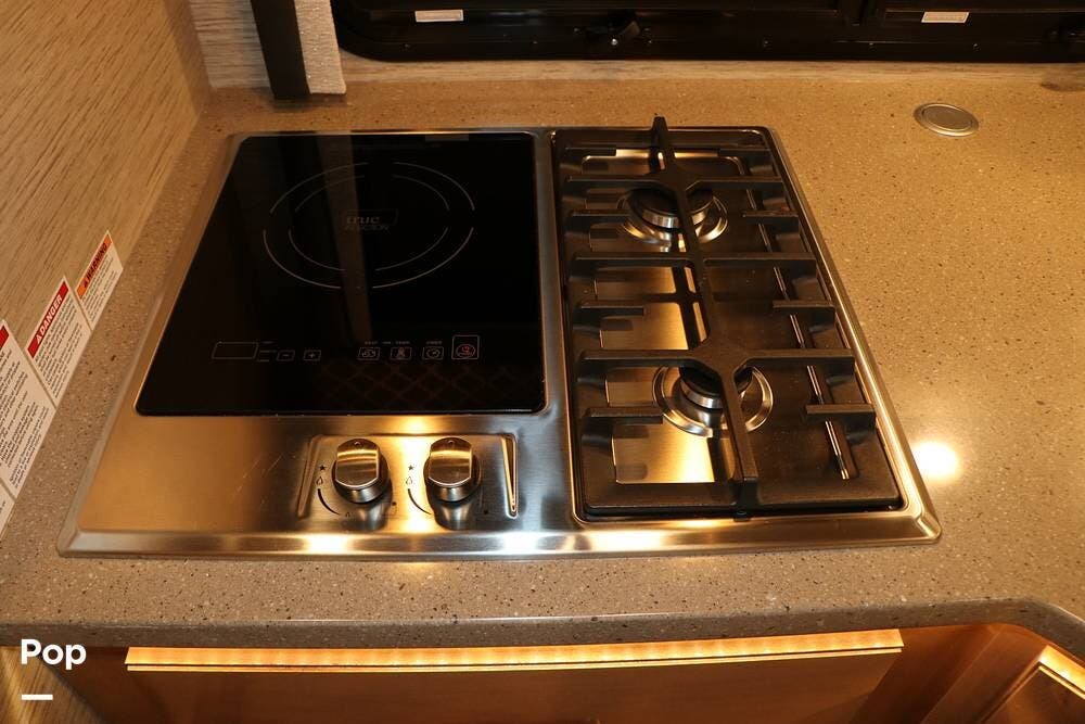 The galley is fully equipped with a mid-sized refrigerator, a convection microwave oven, a single induction stove top with one gas burner, and a stainless steel sink with matching covers, all on the solid surface countertop that runs throughout the RV.