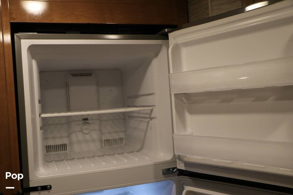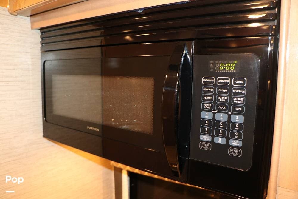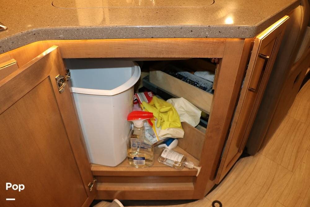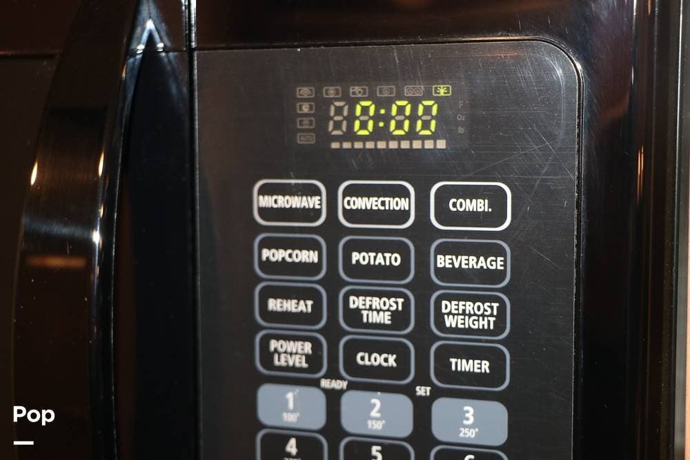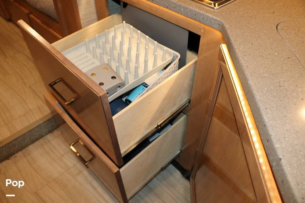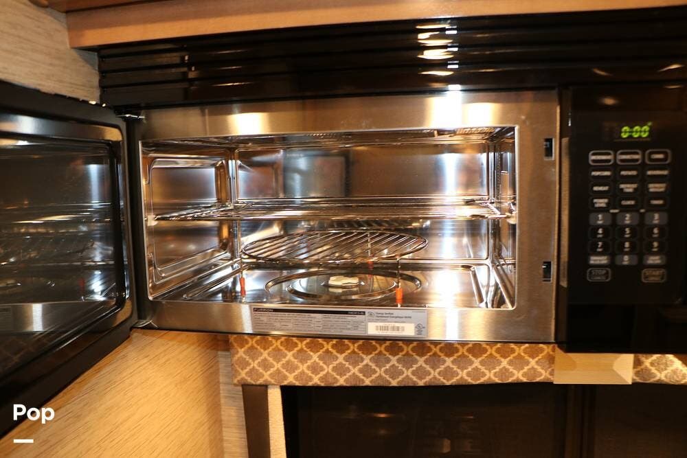 The galley is fully equipped with a mid-sized refrigerator, a convection microwave oven, a single induction stove top with one gas burner, and a stainless steel sink with matching covers, all on the solid surface countertop that runs throughout the RV.