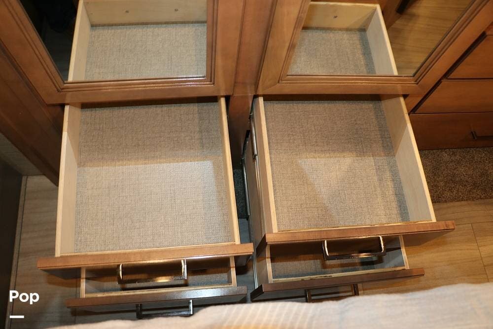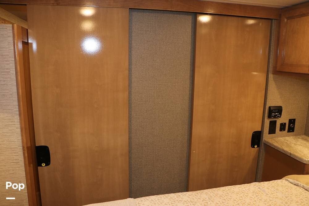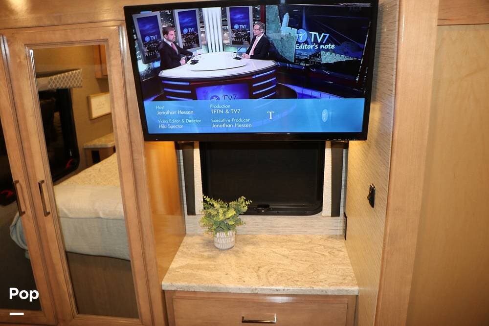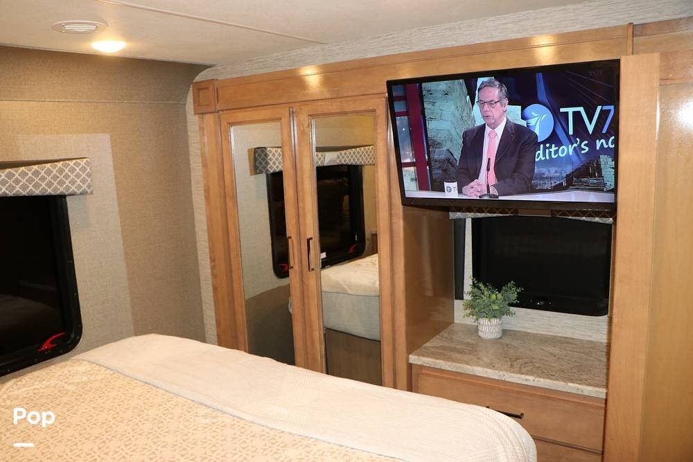 The master bedroom features a queen pedestal bed, a second TV over the vanity area, and a wardrobe closet at the foot of the bed, with additional drawers for more storage space below the wardrobe closet and vanity. There is also cabinet space over the head of the bed.