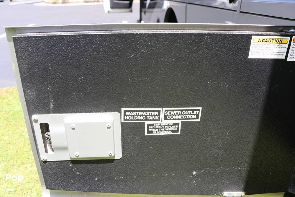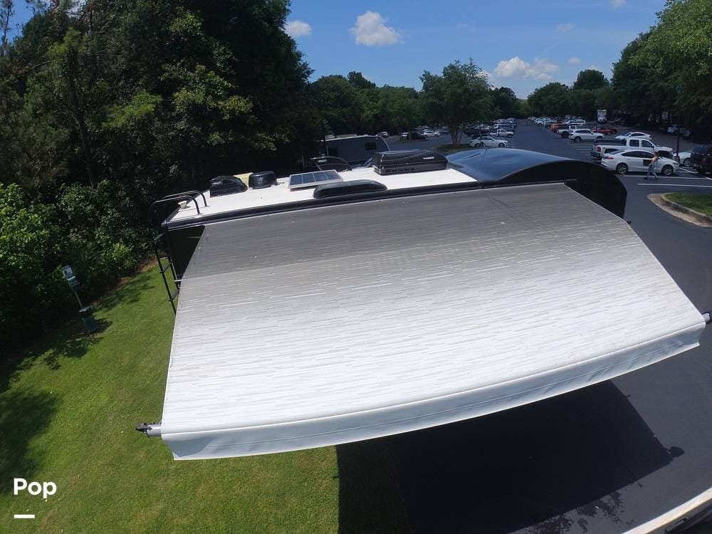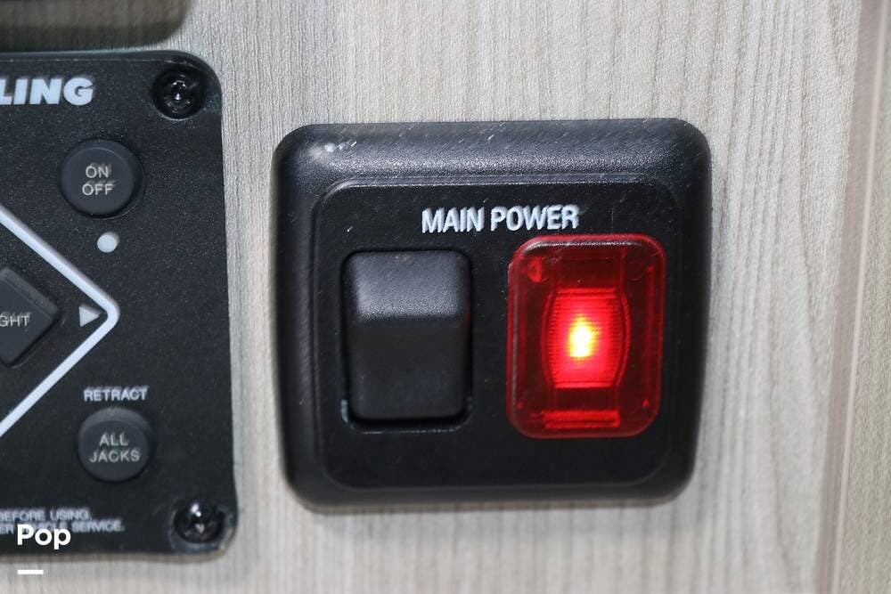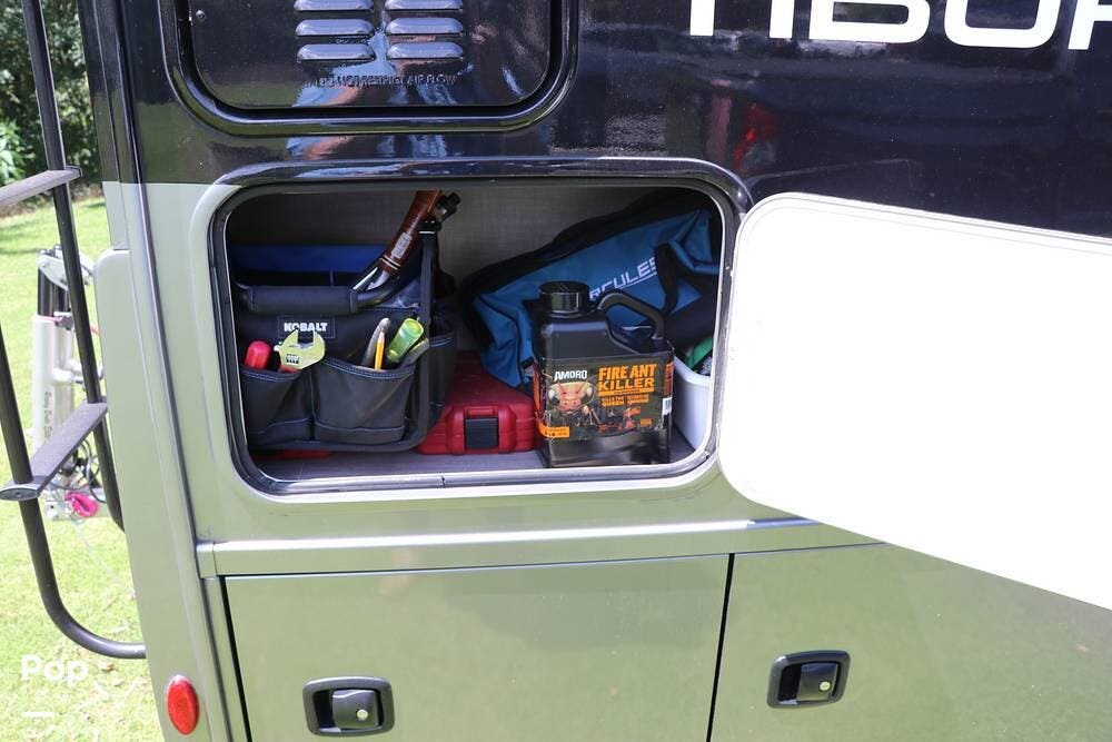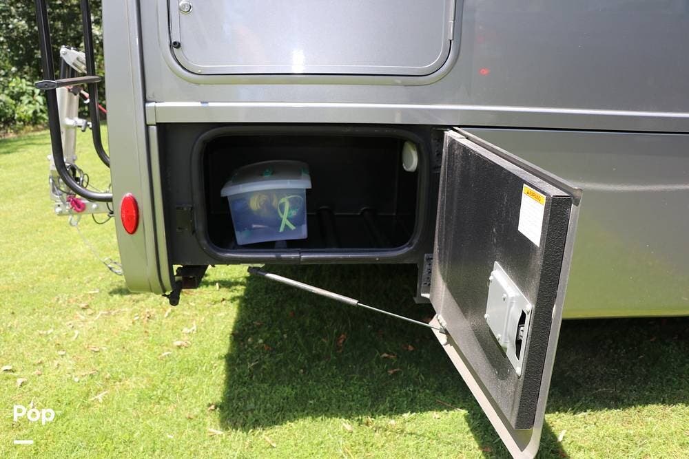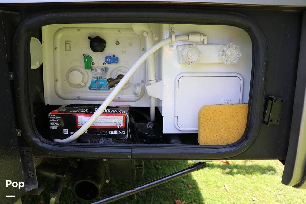Outside, the large power awning extends the fun outdoors when at the campsite. There are large exterior storage compartments, and all of the RV systems are clearly marked and easily accessible around the unit.
