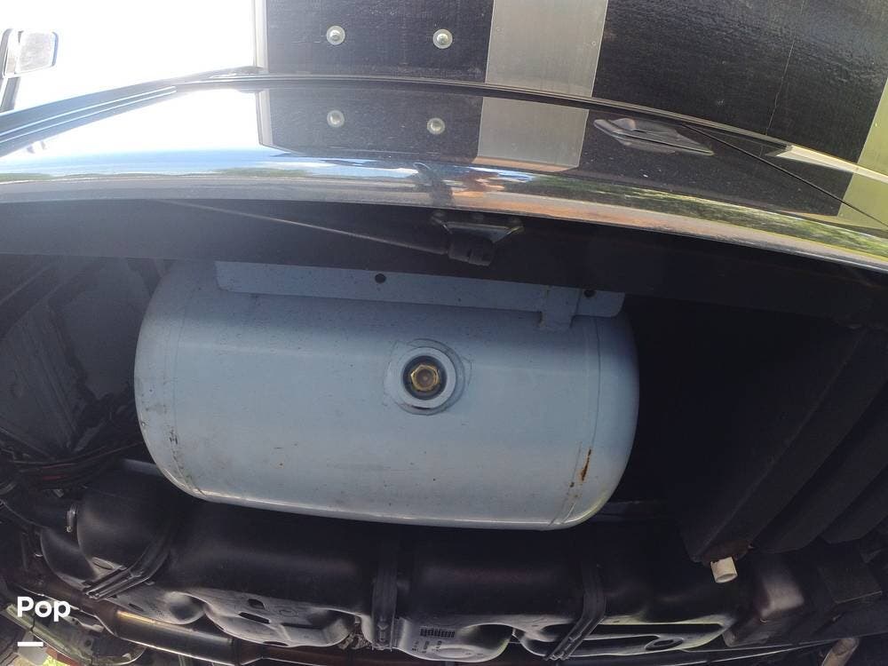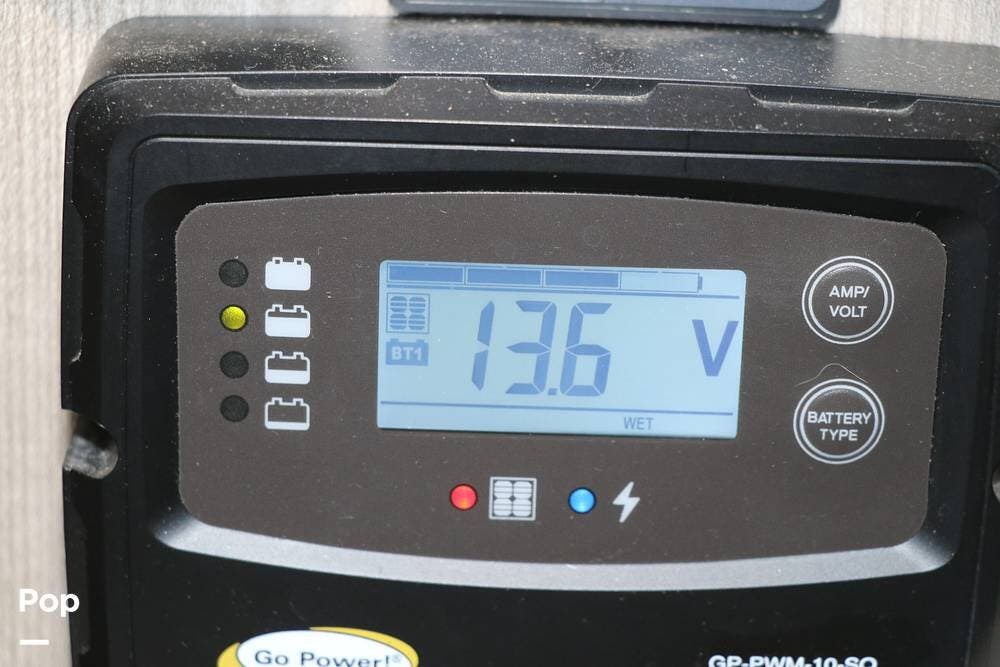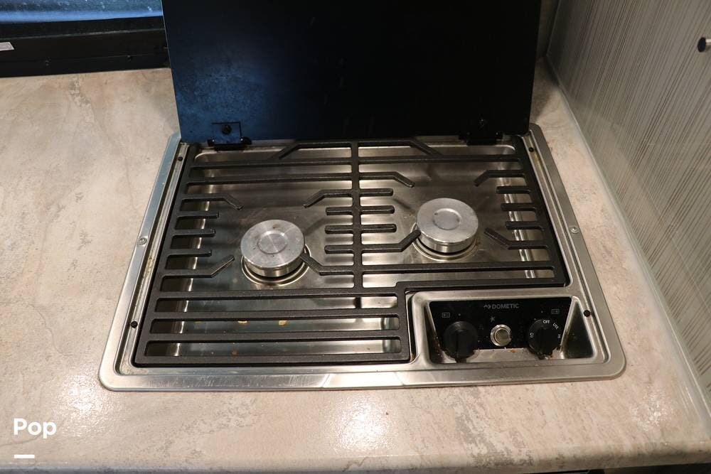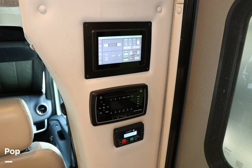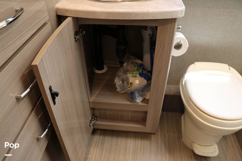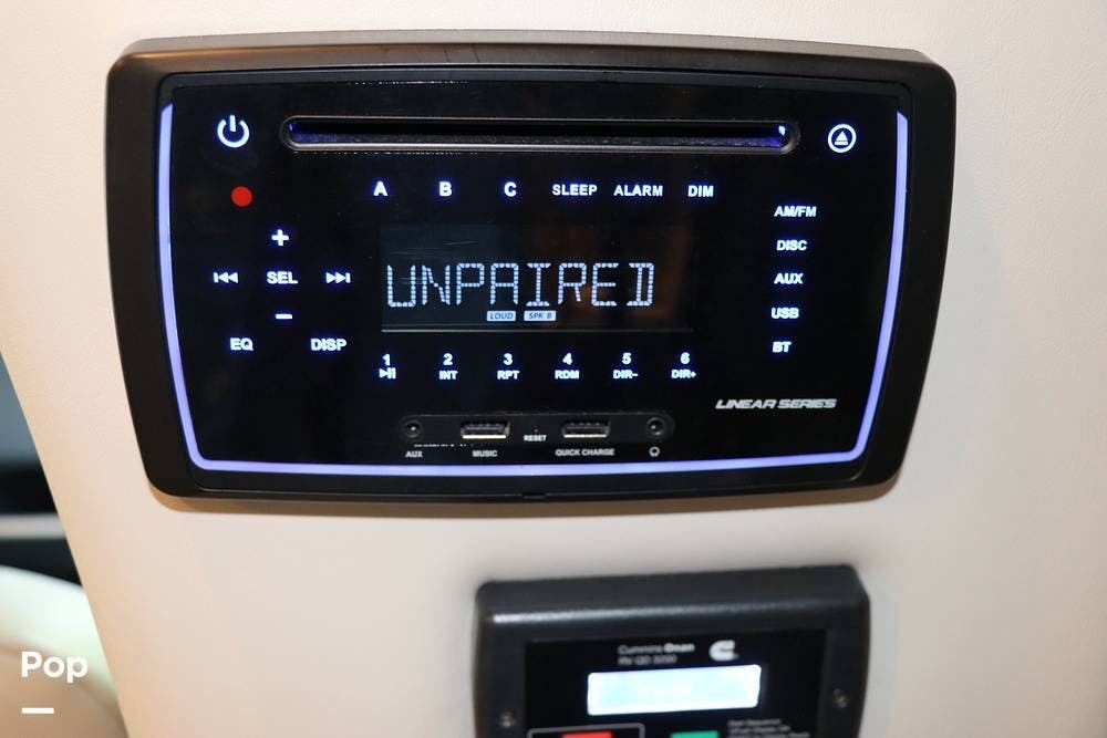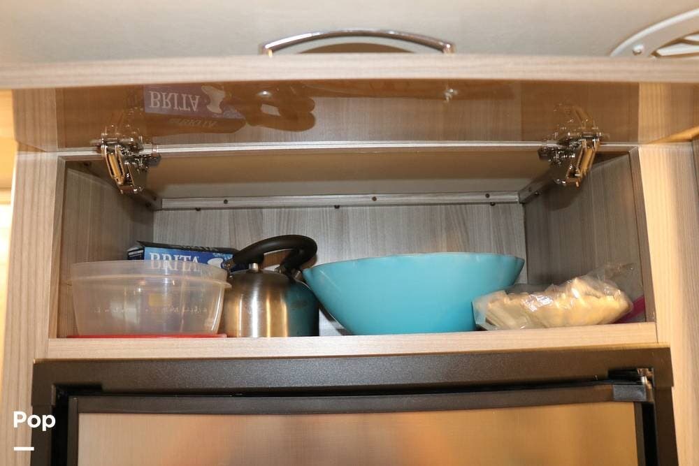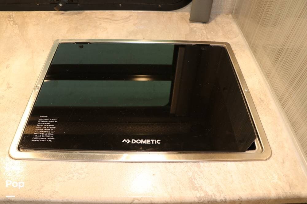 The galley is fully equipped with a microwave/convection oven below a 2-burner stovetop with glass cooktop cover - the round stainless kitchen sink with gooseneck faucet and cover for more countertop space when needed - replaced the dual fuel refrigerator (Propane/Electric) with a new 12 Volt Refrigerator (30% more usable space) and replaced the Lead Acid House Battery with a 200AH Lithium Battery. There is lots of cabinet space, and the wall-mounted TV provides entertainment as well as a separate sound system for the living area and the cab with the integrated stereo-nav - system controls for the unit.