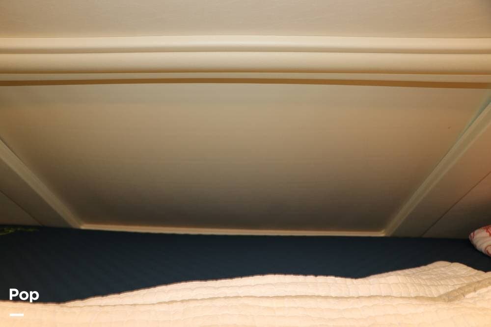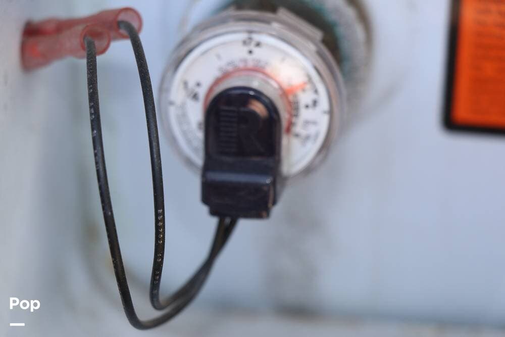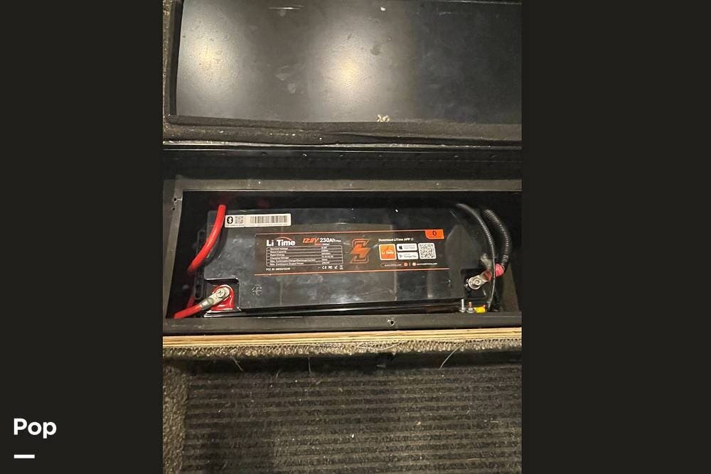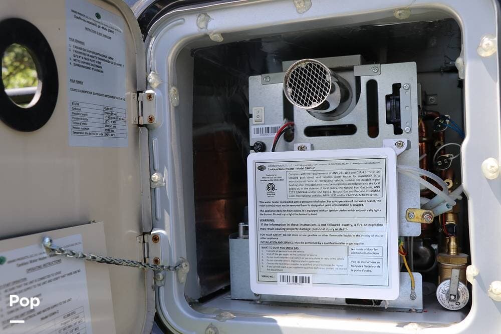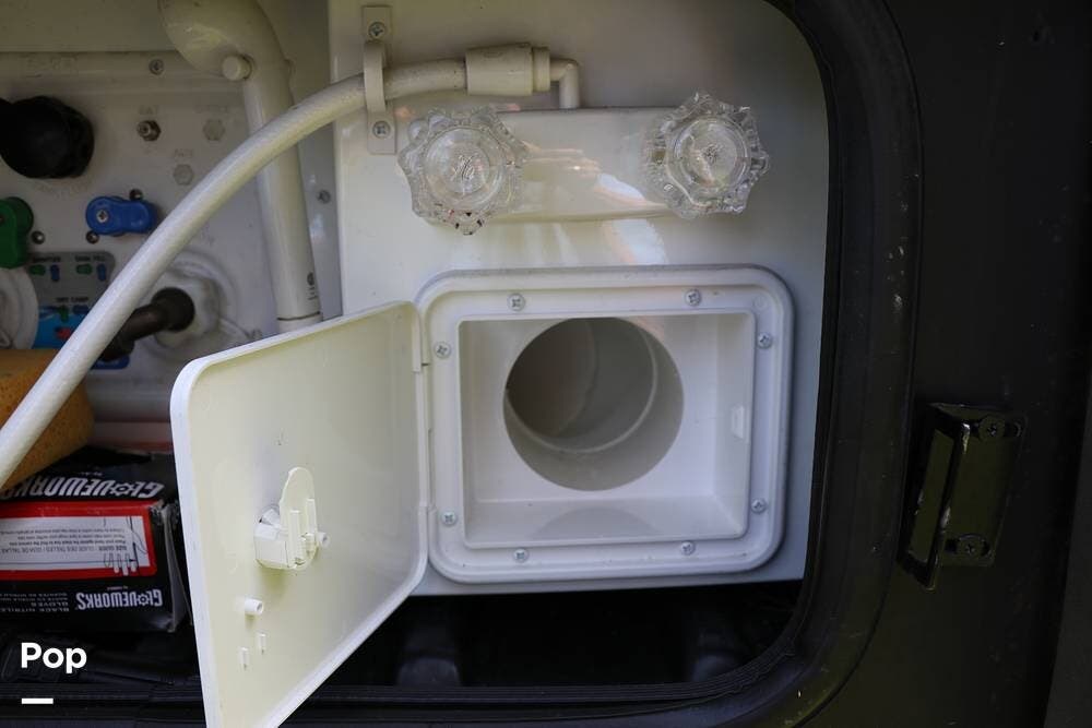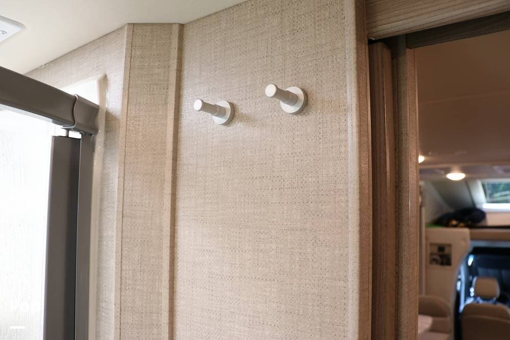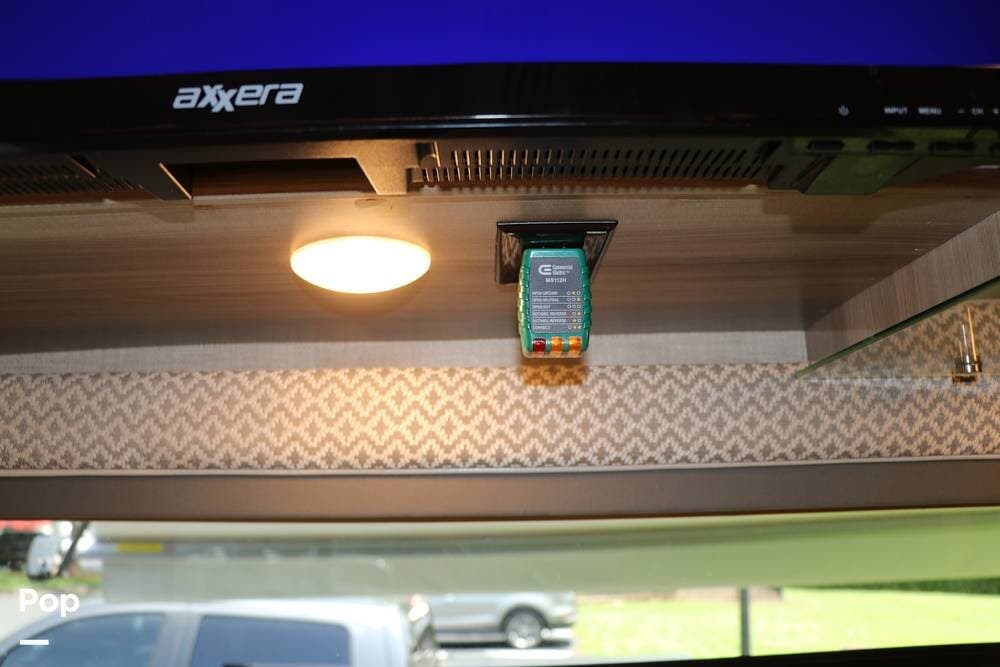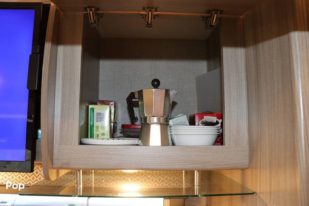 The galley is fully equipped with a microwave/convection oven below a 2-burner stovetop with glass cooktop cover - the round stainless kitchen sink with gooseneck faucet and cover for more countertop space when needed - replaced the dual fuel refrigerator (Propane/Electric) with a new 12 Volt Refrigerator (30% more usable space) and replaced the Lead Acid House Battery with a 200AH Lithium Battery. There is lots of cabinet space, and the wall-mounted TV provides entertainment as well as a separate sound system for the living area and the cab with the integrated stereo-nav - system controls for the unit.
