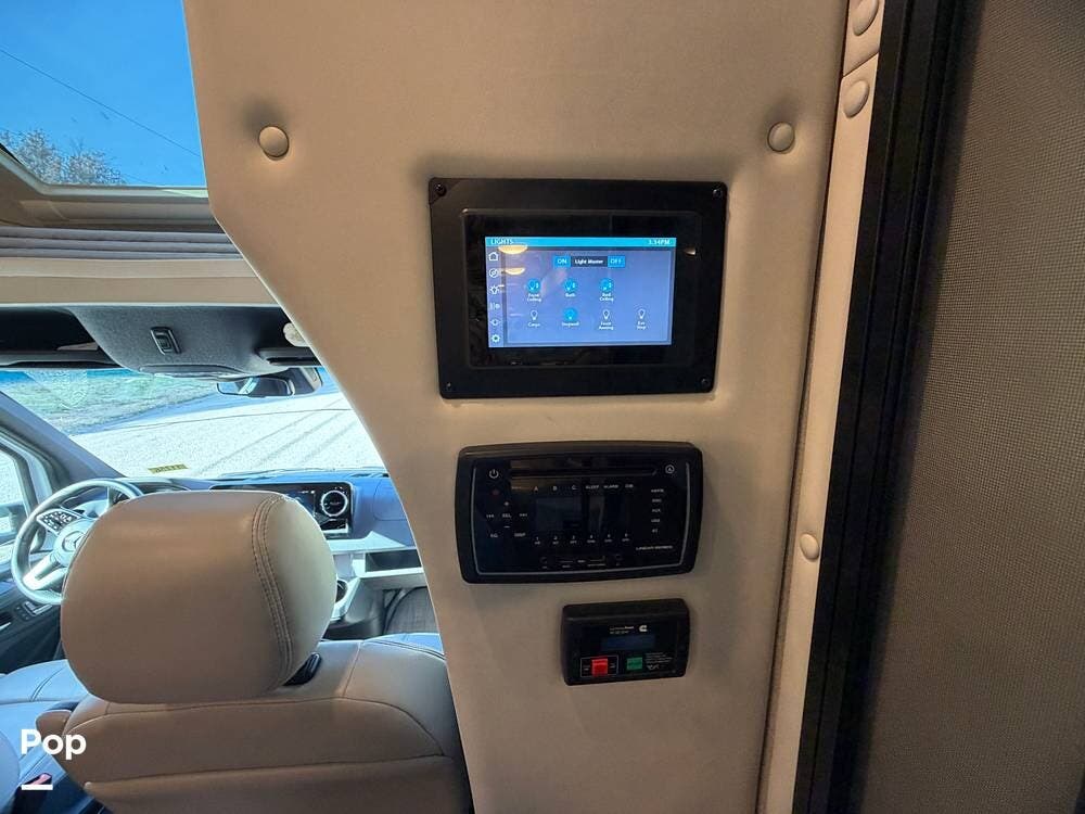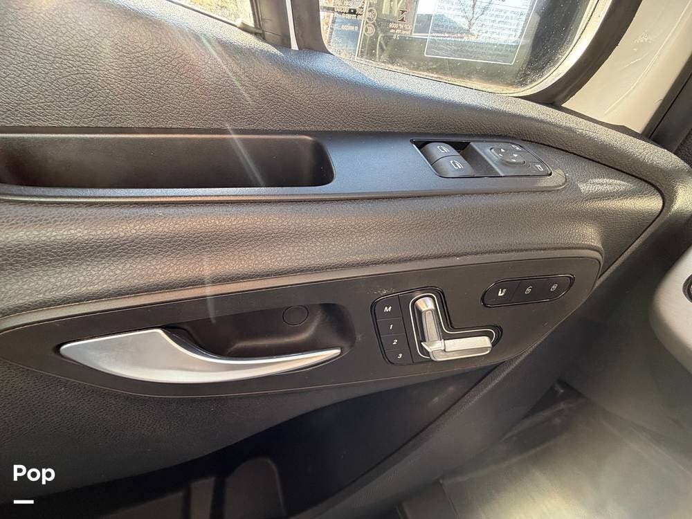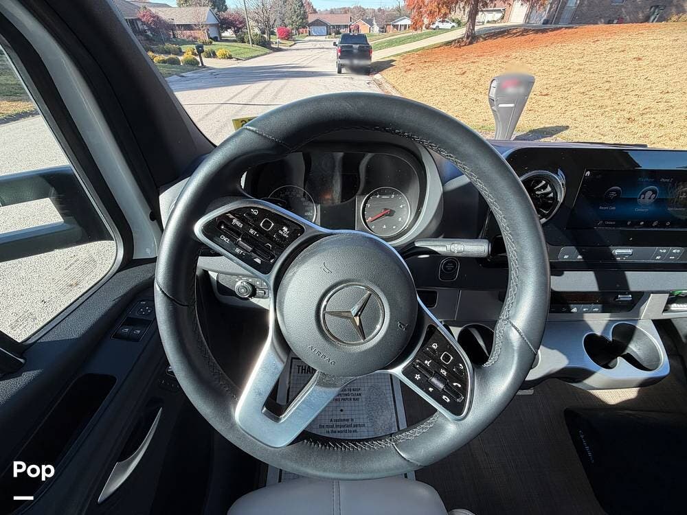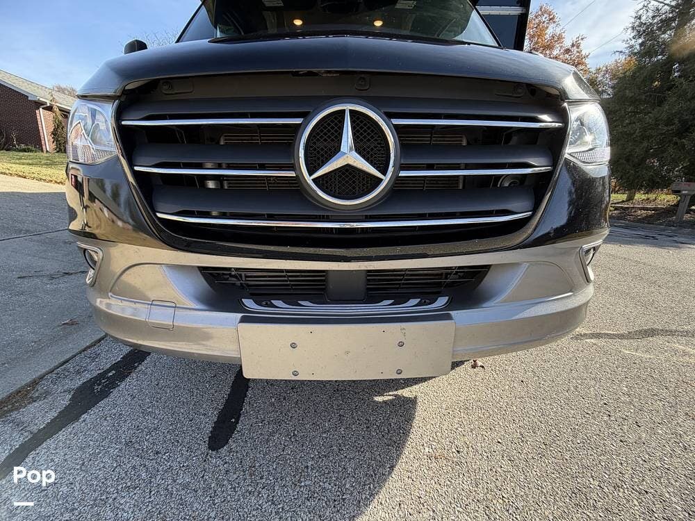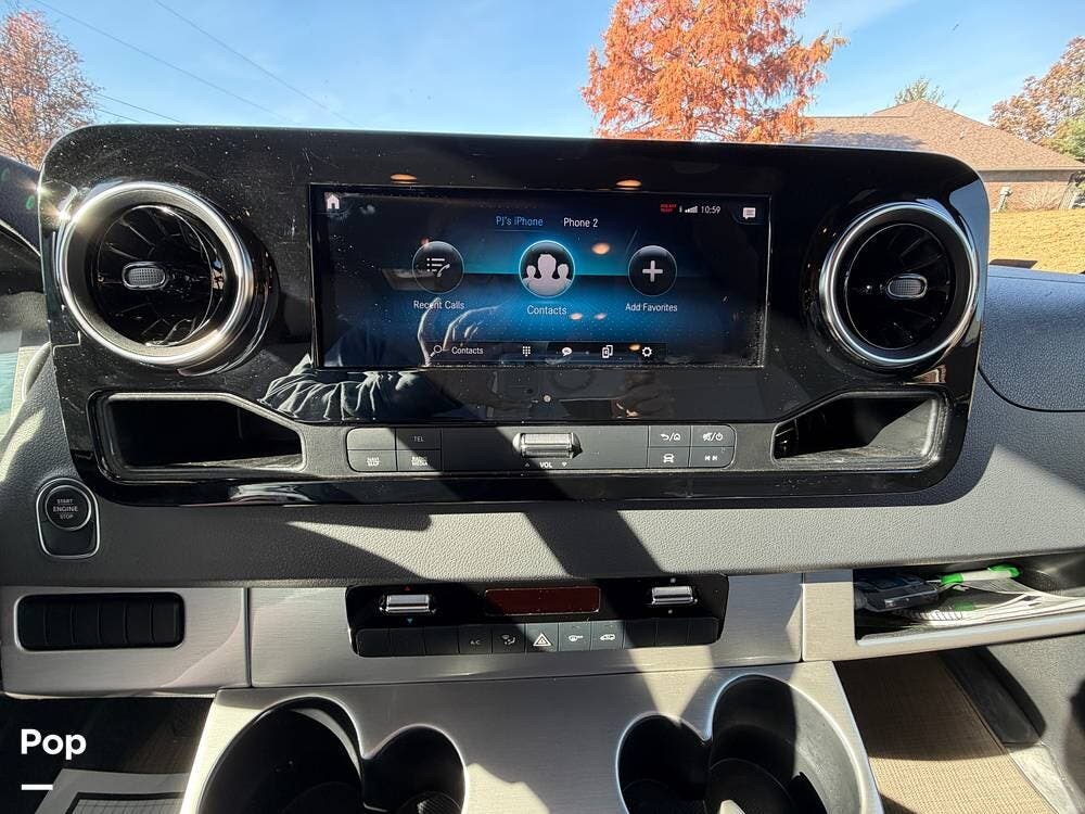 Premium features include the Mercedes safety suite, touchscreen dash controls, navigation, a diesel generator, modern cabinetry, LED lighting, and a large power awning with integrated lighting.