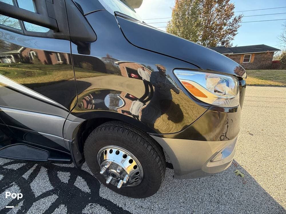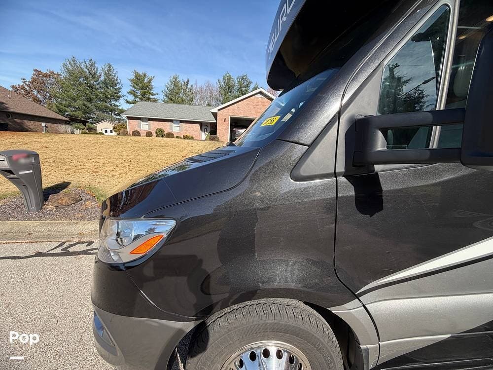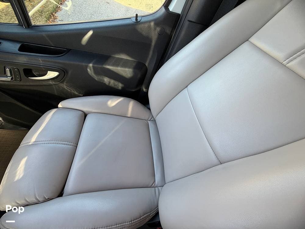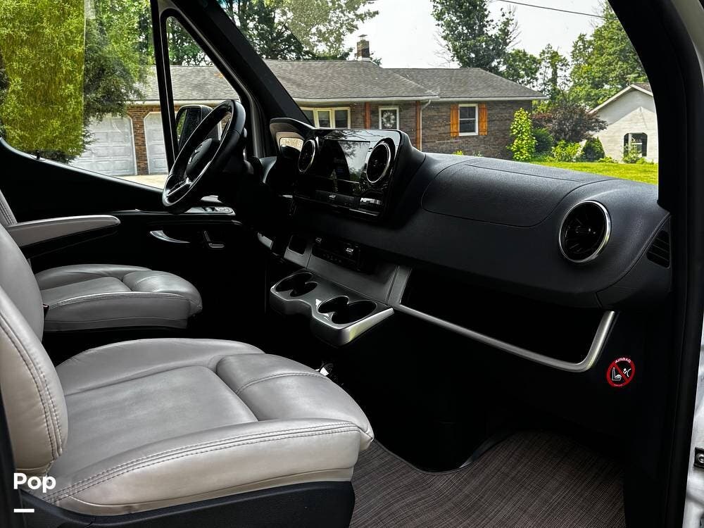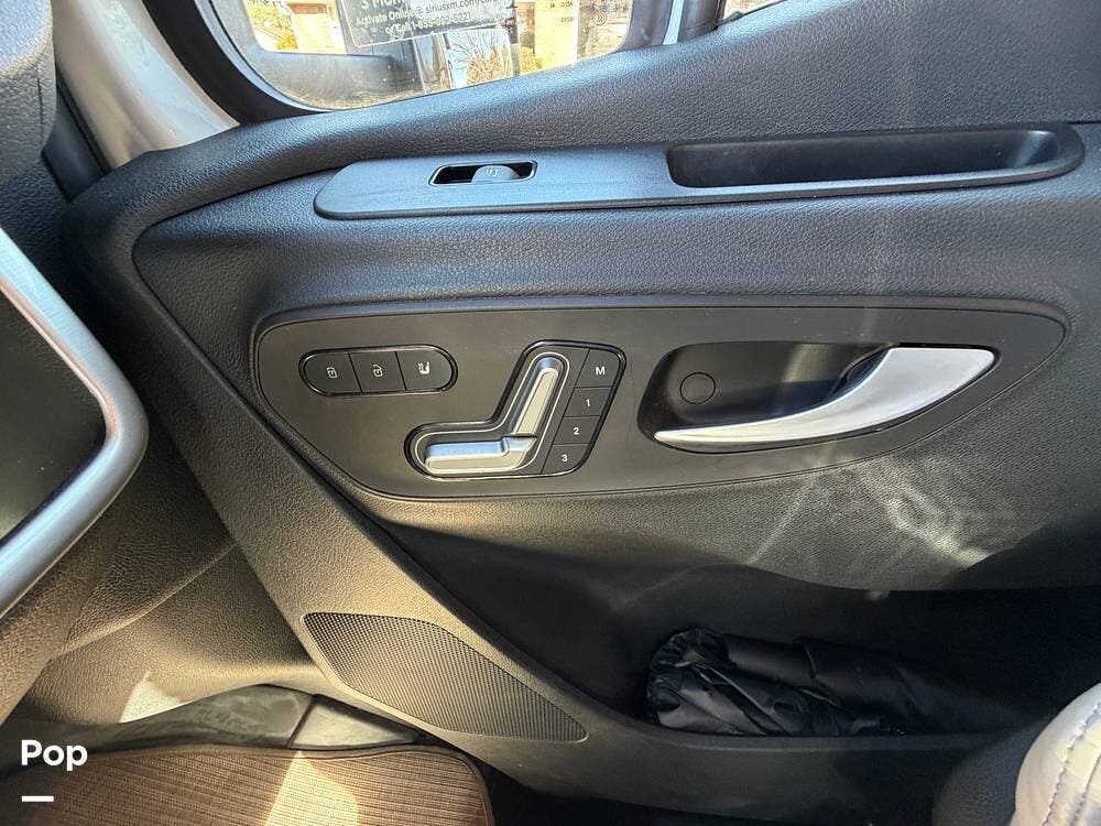 Premium features include the Mercedes safety suite, touchscreen dash controls, navigation, a diesel generator, modern cabinetry, LED lighting, and a large power awning with integrated lighting.