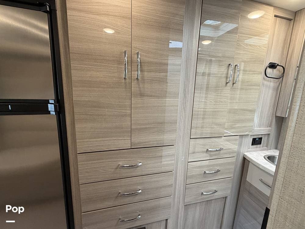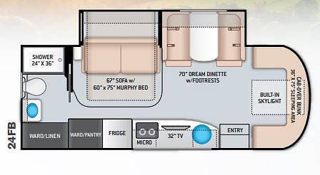 This classy, compact Class C offers a smart, spacious floorplan with a full-wall slide, a rear full bath, a fully equipped kitchen, and a comfortable Murphy bed/sofa combo that maximizes space without compromising comfort.