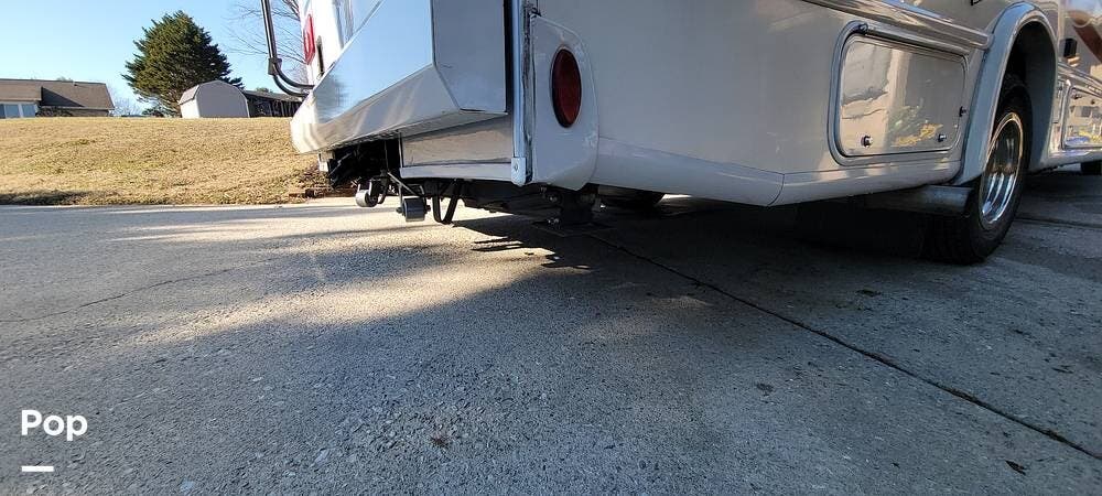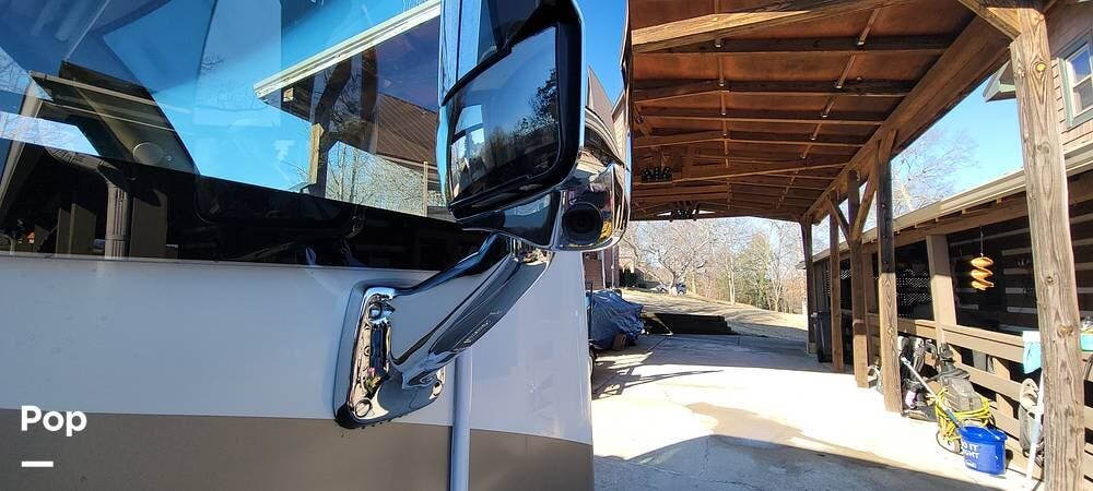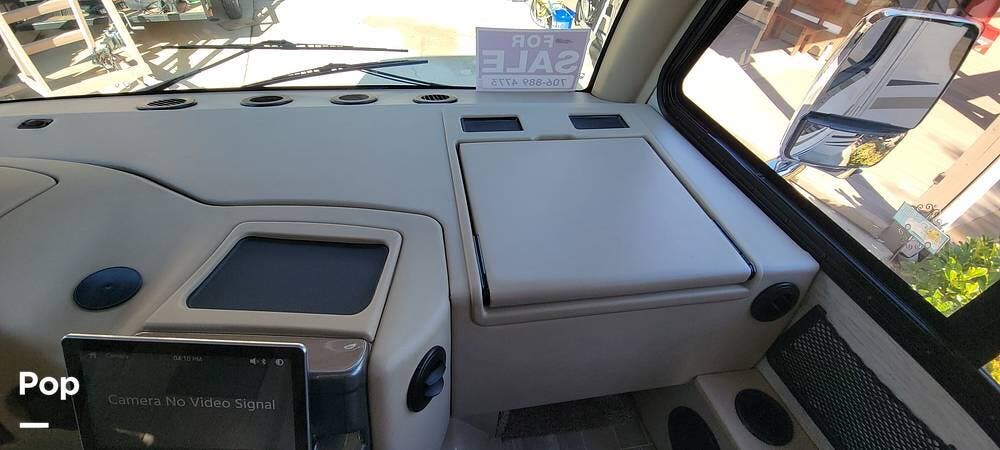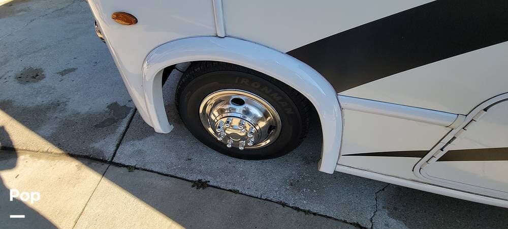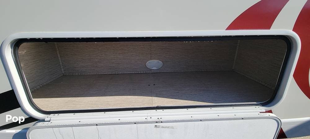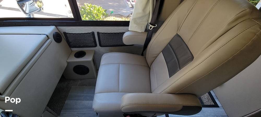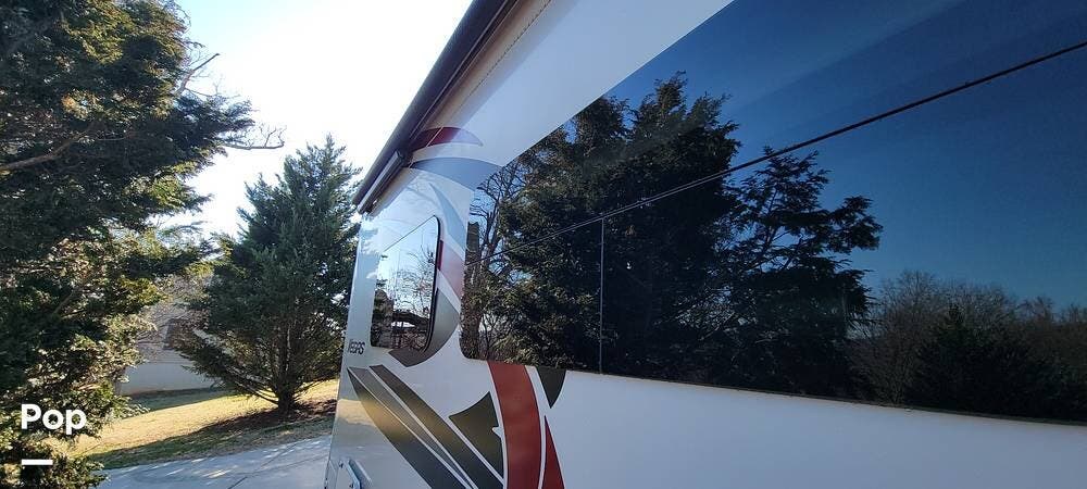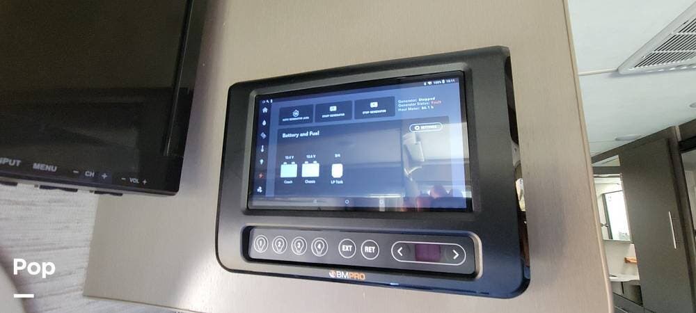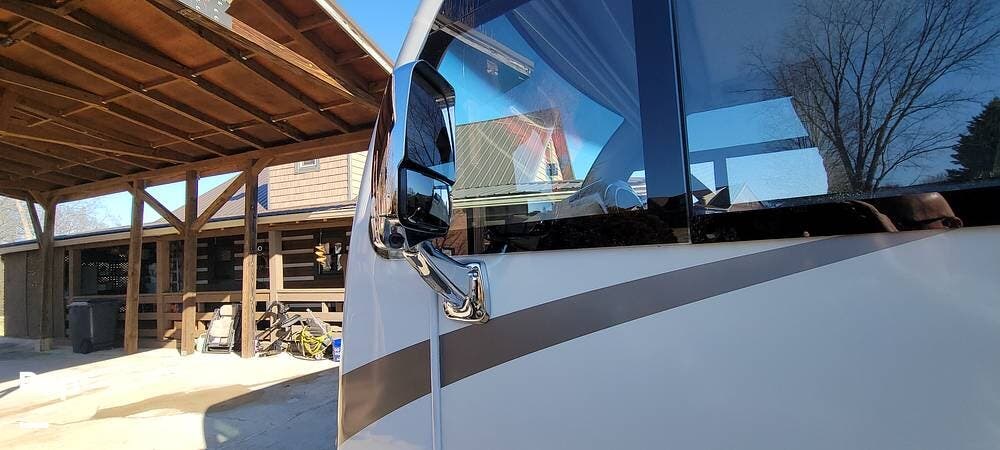 It will sleep five with the queen-size Murphy bed, queen-size drop-down bed, and a dinette sleeper. It does offer lane-changing cameras and rear electric stabilizers.
