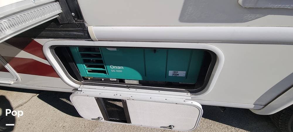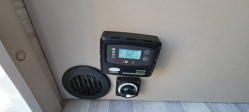 The kitchen features a stainless sink, a two-burner gas stove, a microwave convection oven, and a 12v refrigerator. Batteries are kept charged by a 100-watt solar panel, and you also have an Onan 4.0kW generator if needed.