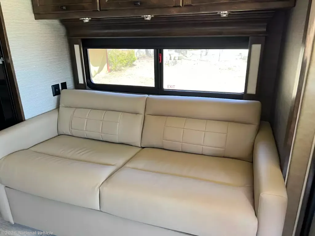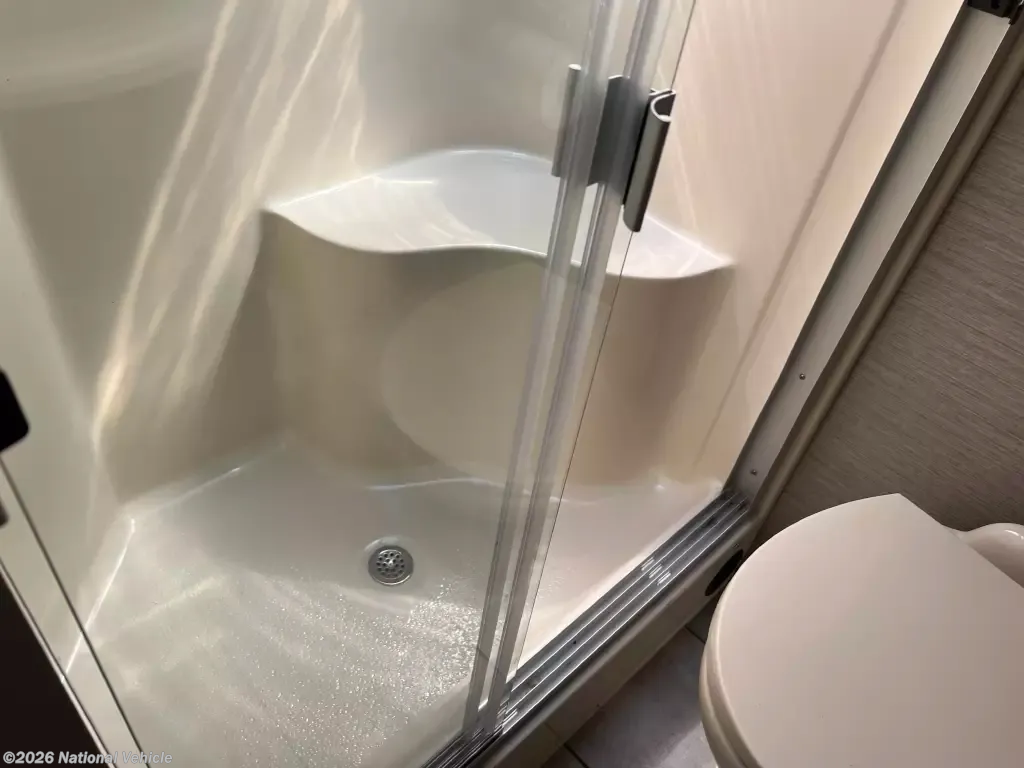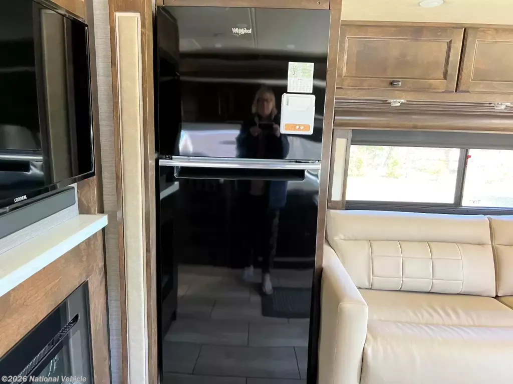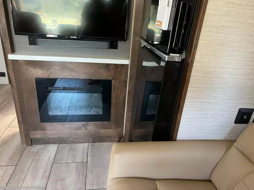Pack your bags and load up into this motorhome for a luxurious adventure! This compact yet comfortable coach delivers an enjoyable nimble ride atop smooth air ride suspension, propelling you ahead thanks to a quiet yet robust diesel engine. The rear private bedroom has a queen bed slide with nightstands, a bank of drawers next to a TV, and a wardrobe that is prepped to add a washer and dryer so you can have clean clothes throughout your entire trip. The full bathroom has a shower with a seat to freshen up in each morning and has an upgraded Nautilus Shower Door system. The kitchen area has a three-burner cooktop to enjoy your meals in the table top off long counter & 2 folding chairs. The residential refrigerator has ample room for storage for a short or long trip. The upgraded LG TV is remarkable for watching your favorite show while keeping warm with a fireplace below. If the weather is enjoyable outside head outdoors to watch the exterior for a relaxing evening.