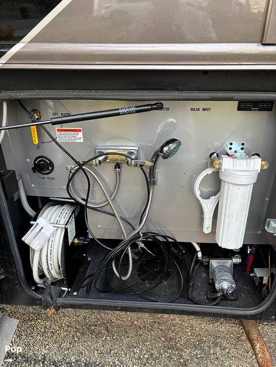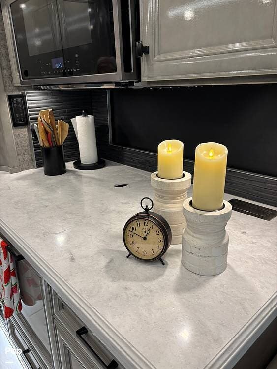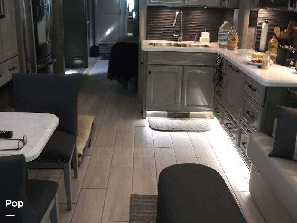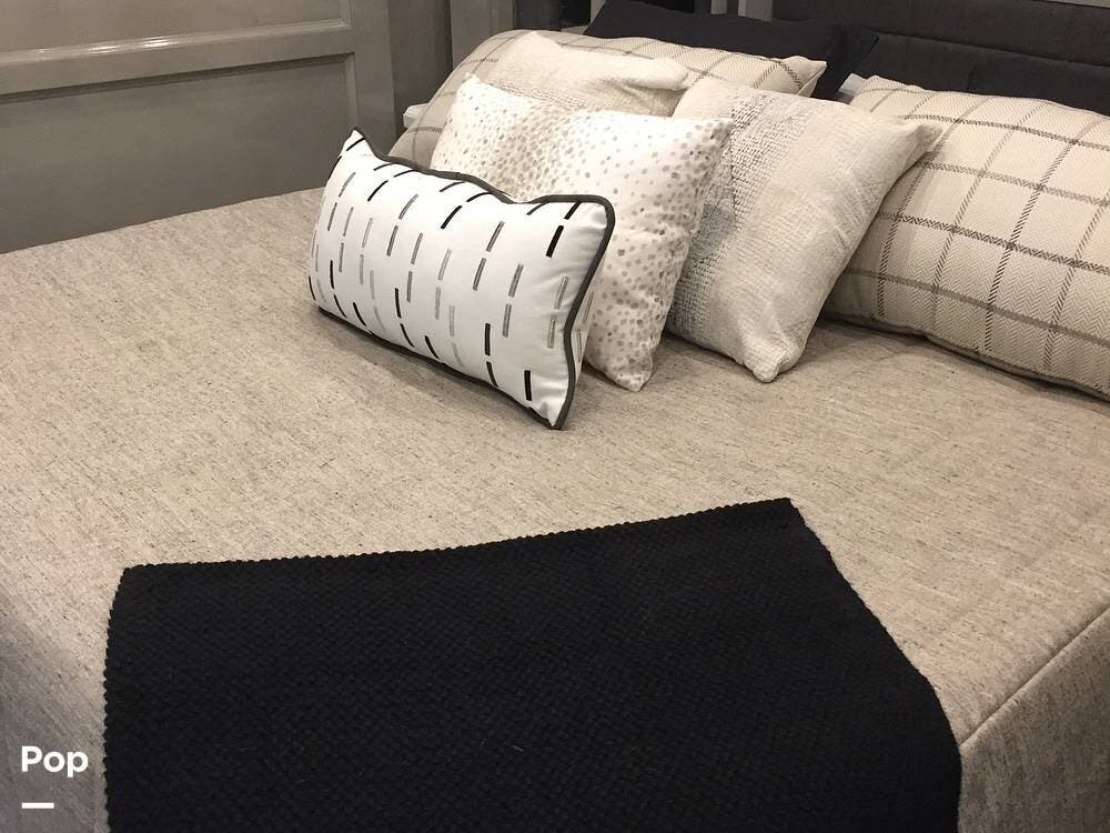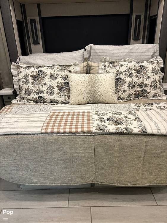 This is a 2021 Allegro Bus 35CP. An L9 Cummins turbo diesel engine powers it. With 450 horsepower and 1250 foot-pounds of torque, it will roar up any hill. On the descent, it will gradually roll down it with a two-stage engine brake, allowing it to slow down while barely pressing the pedal.