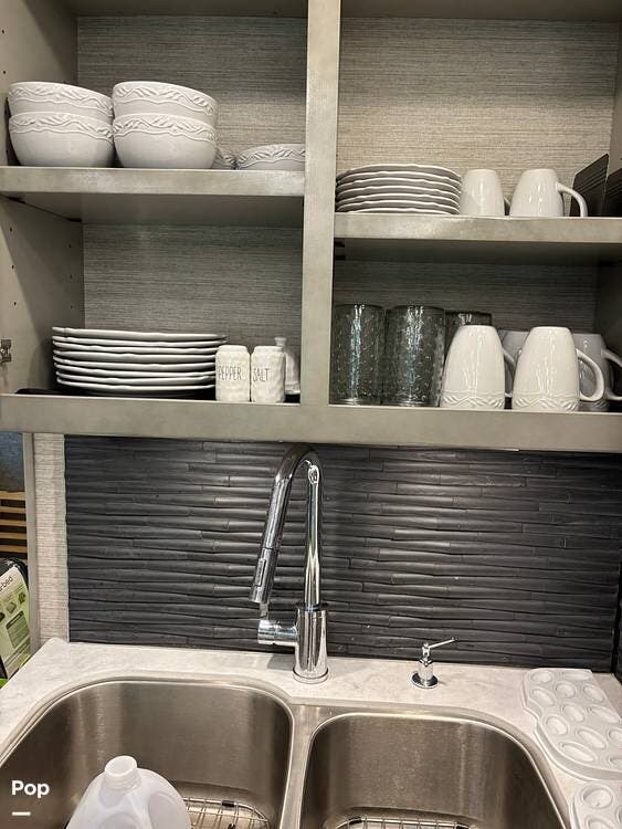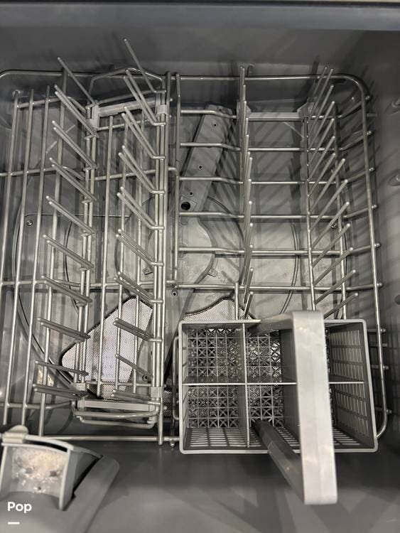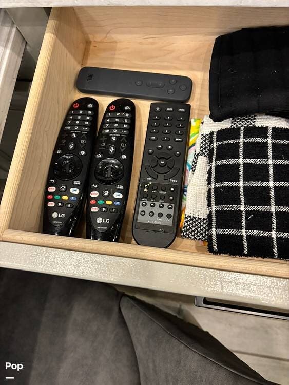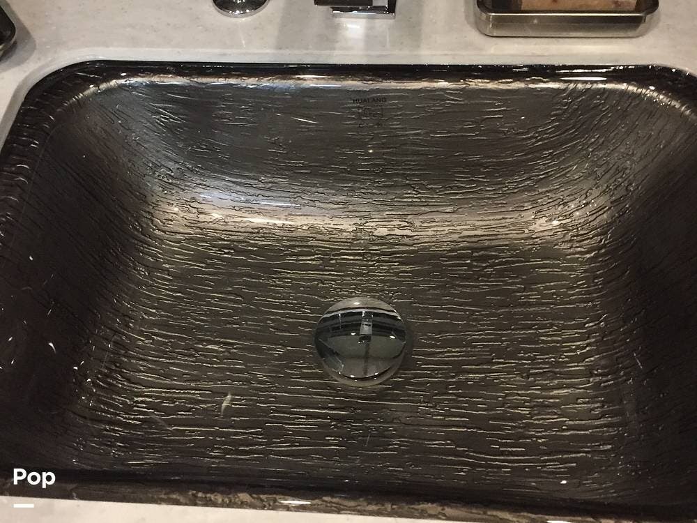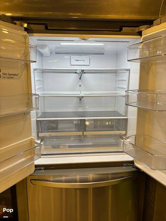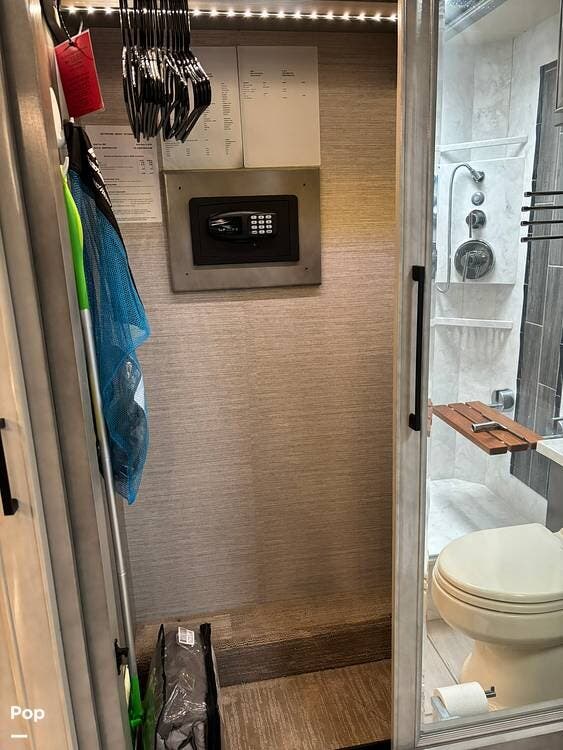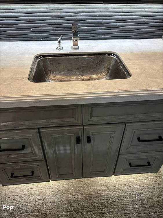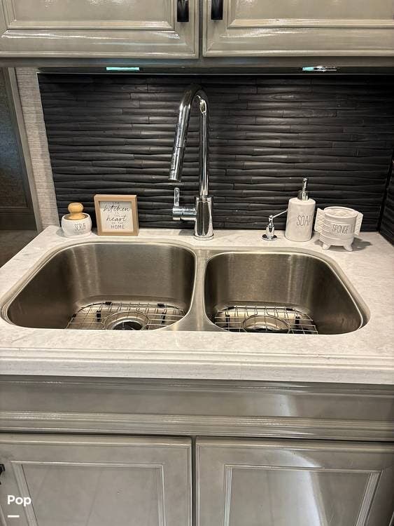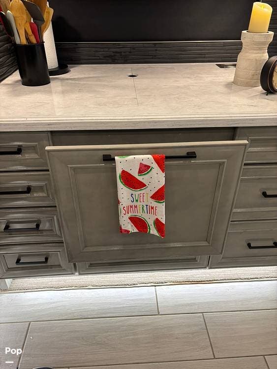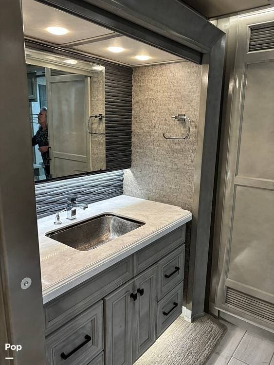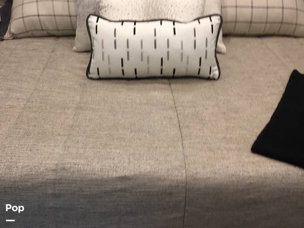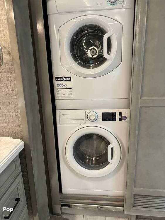 The master bedroom features a slide-out and a king bed with dual nightstands, as well as a 50" bedroom TV. Friends can sleep on the sofa bed in the main living area. The large closet, stacked washer and dryer, and dual bath sinks make it a home away from home.